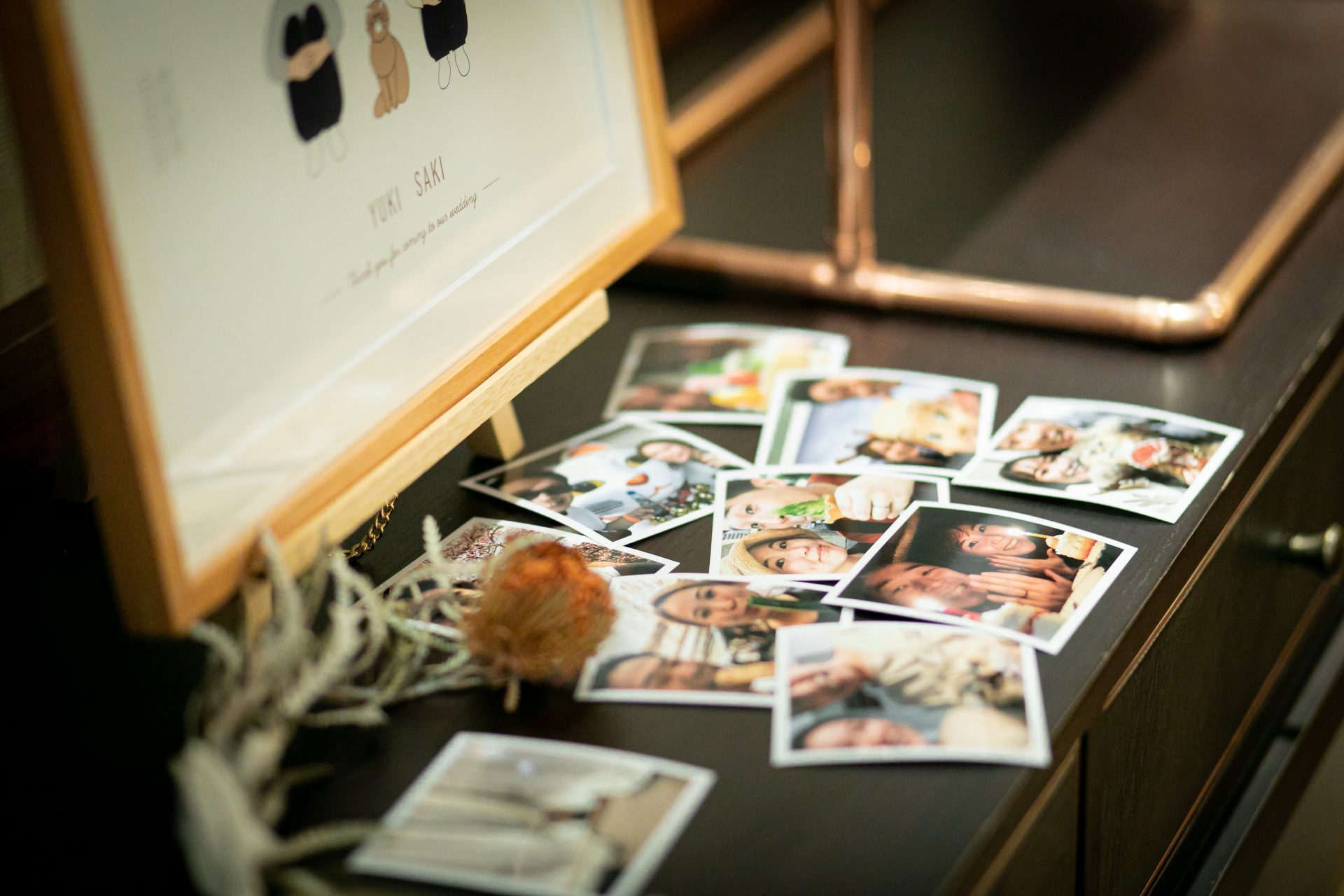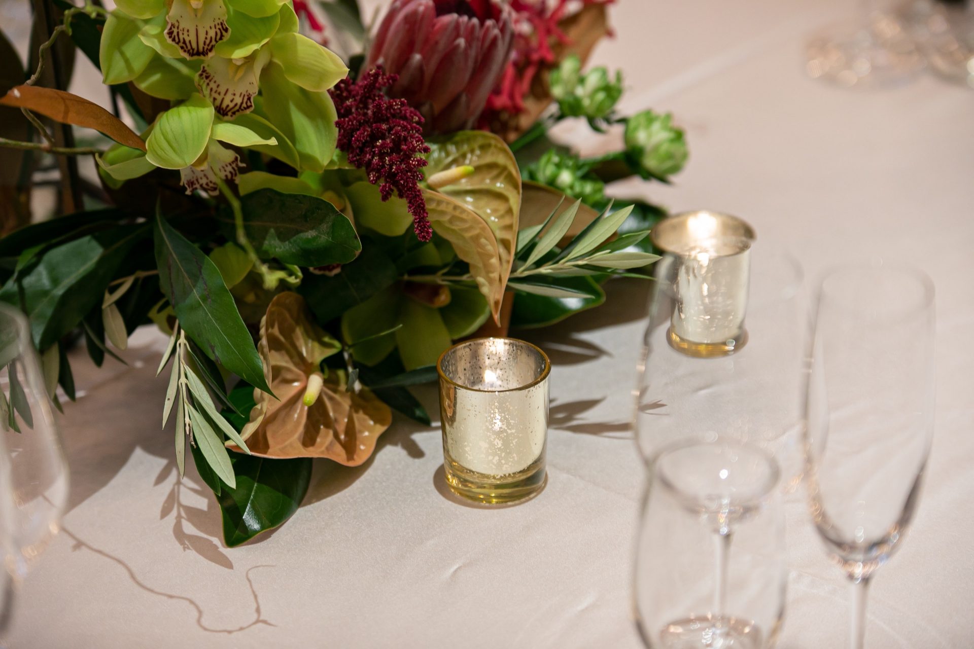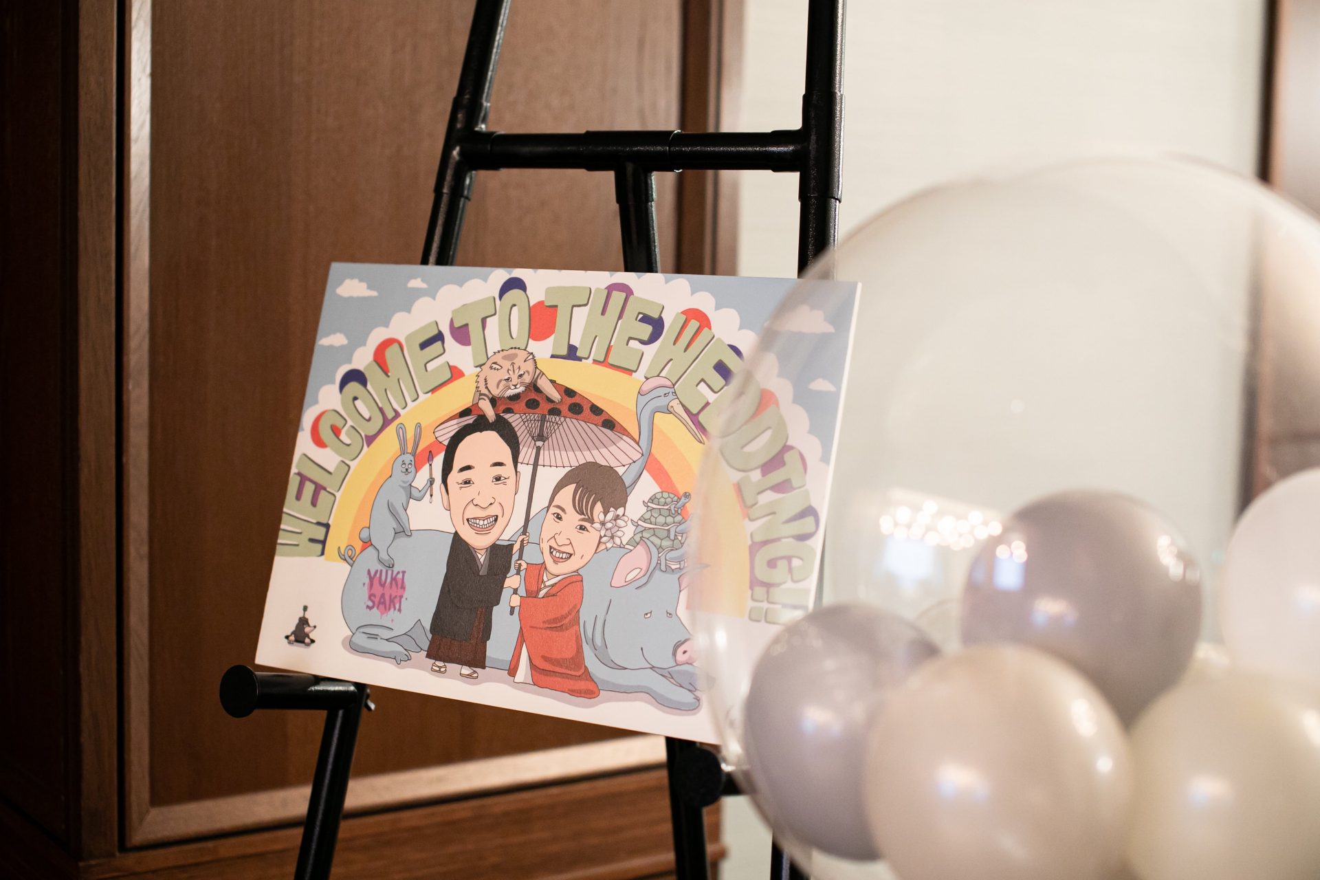 4FのTHE DINING ROOM(ザ・ダイニングルーム)のウェルカムスペースには、いつもハッピーオーラが漂うおふたりらしい、ポップなデコレーションを。装花には秋らしく少しシックな色味をセレクトし、ゴールドのキャンドルを添えて上質な雰囲気を演出。お部屋がブルーの色味に包まれるため、その中にアクセントとして濃いグリーンやワインレッドを入れることによって、ぐっとエレガントな印象になります。
