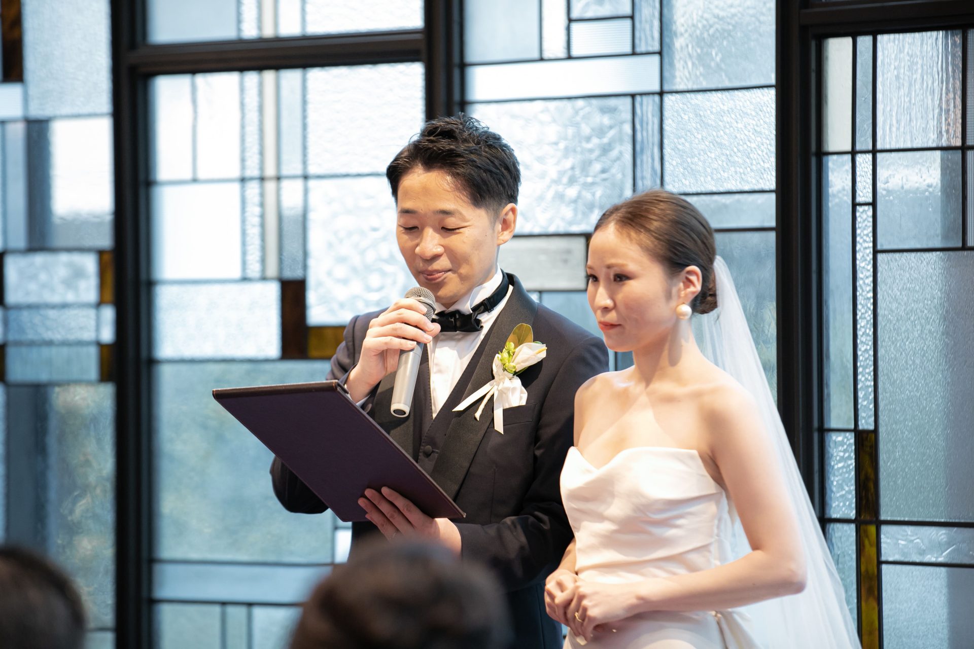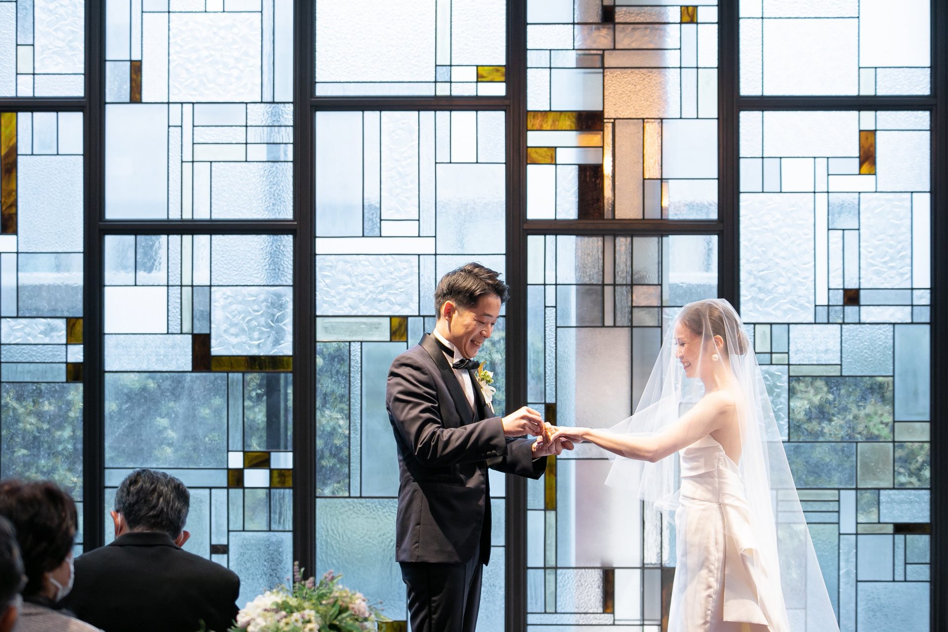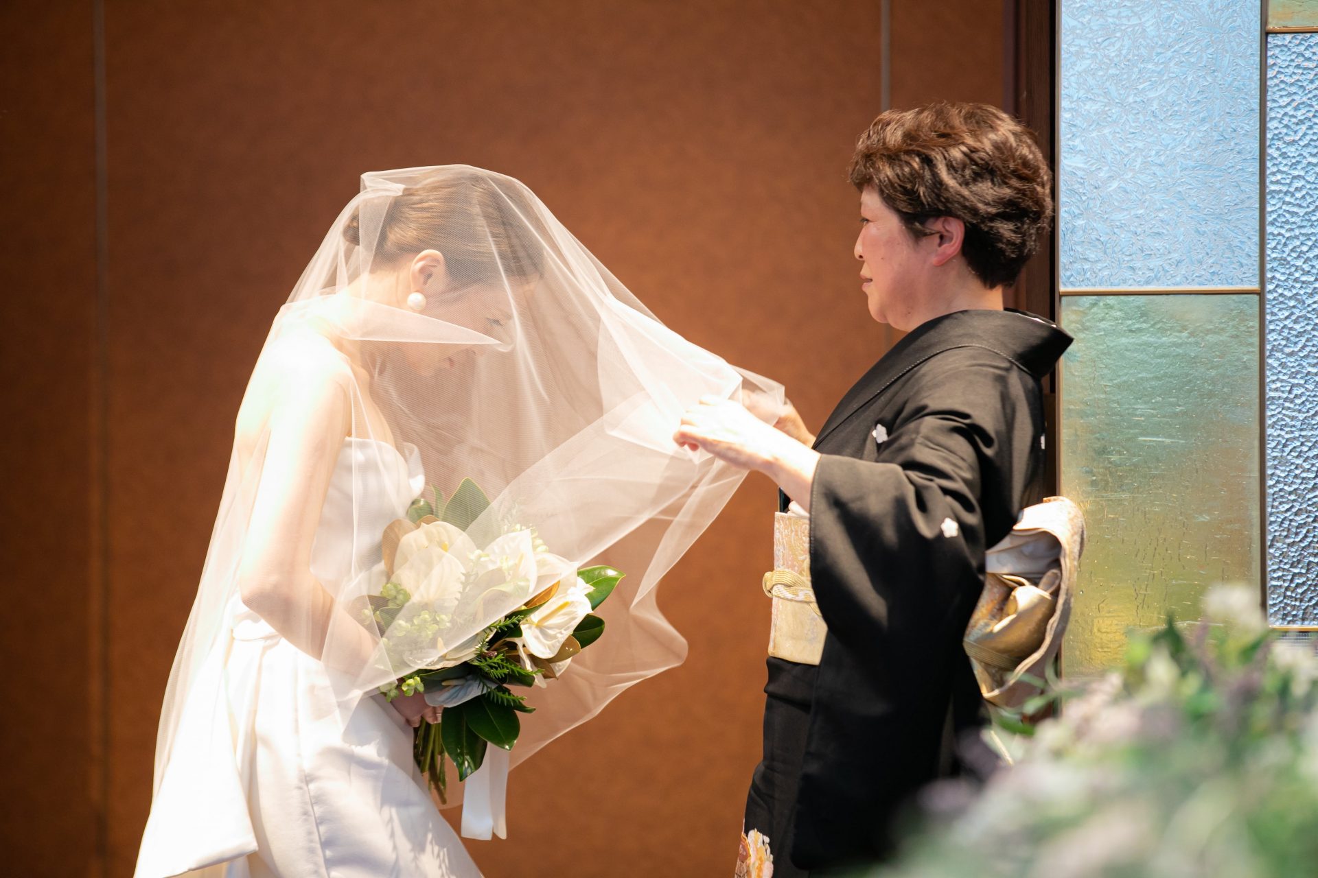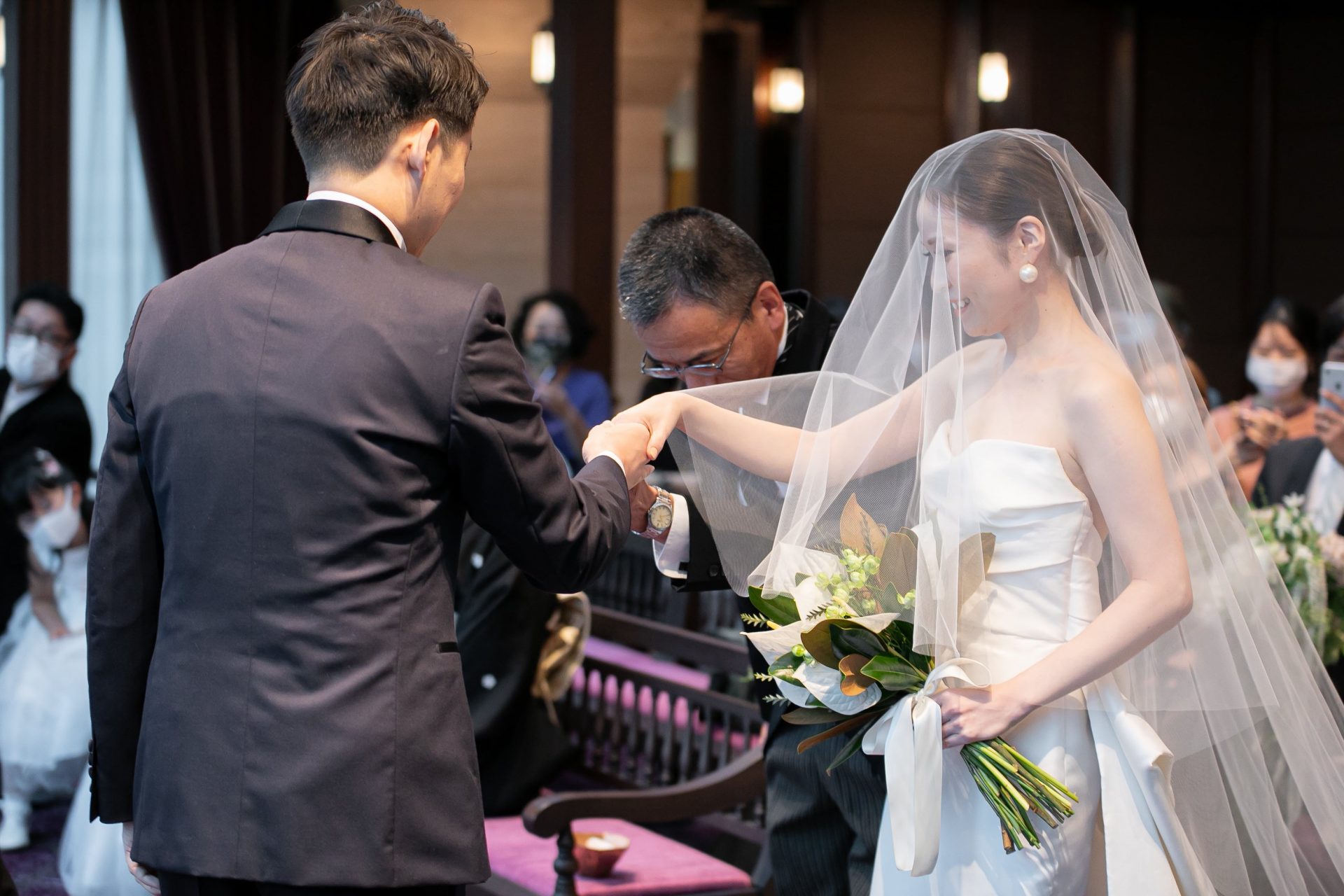 コロナウィルスのパンデミックにより、一度はお式の延期をご決断されたおふたり。悔しいことや不安なこともたくさんあったはずで、当たり前が当たり前ではなかったと気付かされたこの時だからこそ、大切なご家族やご友人の皆様におふたりの言葉で決意を伝えたい。そんな想いから、おふたりが選ばれたのは人前式でした。ヴェールダウンによって、お母様から花嫁様に結びの身支度を。人生を表すヴァージンロードはお父様が一緒に一歩一歩あゆみ、その先に待つ運命の人、新郎様にその大切な手を渡す。これからはご両親ではなく新郎様が守ってゆく、そしてその人生に添い遂げていくという意思表明をするのが挙式なのです。大好きな皆様に見守られながら、おふたりはおふたりの言葉で、その愛を誓われました。