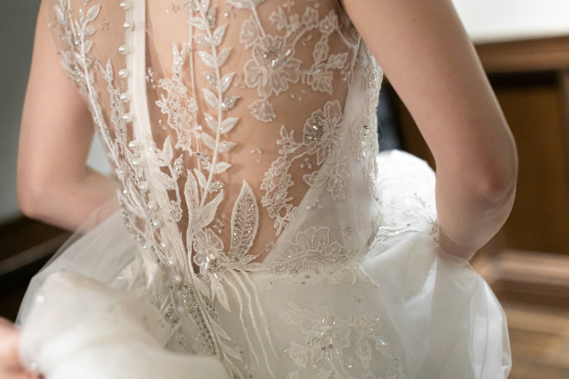Reem Acra(リーム・アクラ)のブランドコンセプトは、“Modern Cinderella(モダン・シンデレラ)”。ロマンティックでクラシック、でも偏ったイメージになりすきず、ファッショナブルであってほしい。プリンセスではなくクイーンになれるような、そんなブライズスタイルが叶うのがこのブランドです。女性らしい柔らかさと芯の強さを持つ新婦様に、お似合いになりそうとおすすめさせていただいたのがこのウェディングドレスでした。お背中に施されたインド刺繍と細やかなビーディングが、この日を祝福してくれるかのようにきらきらと輝きます。Reem Acra(リーム・アクラ)自身が書き起こした刺繍のデザインに合わせて、インドの職人が時間をかけて一針一針丁寧に施すからこそ、この繊細な輝きが実現するのです。デザイナーのこだわりと想いが込められた1着です。