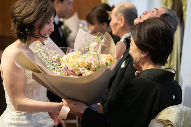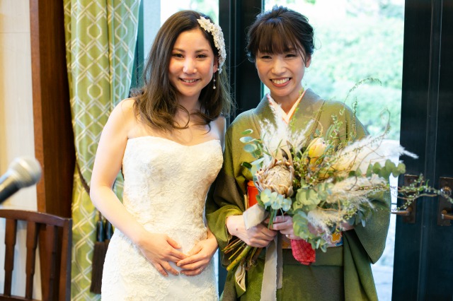 当日は、お式・披露宴で新婦様がお持ちになったブーケをご友人様にプレゼント、