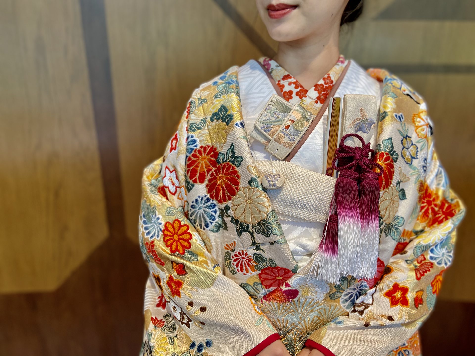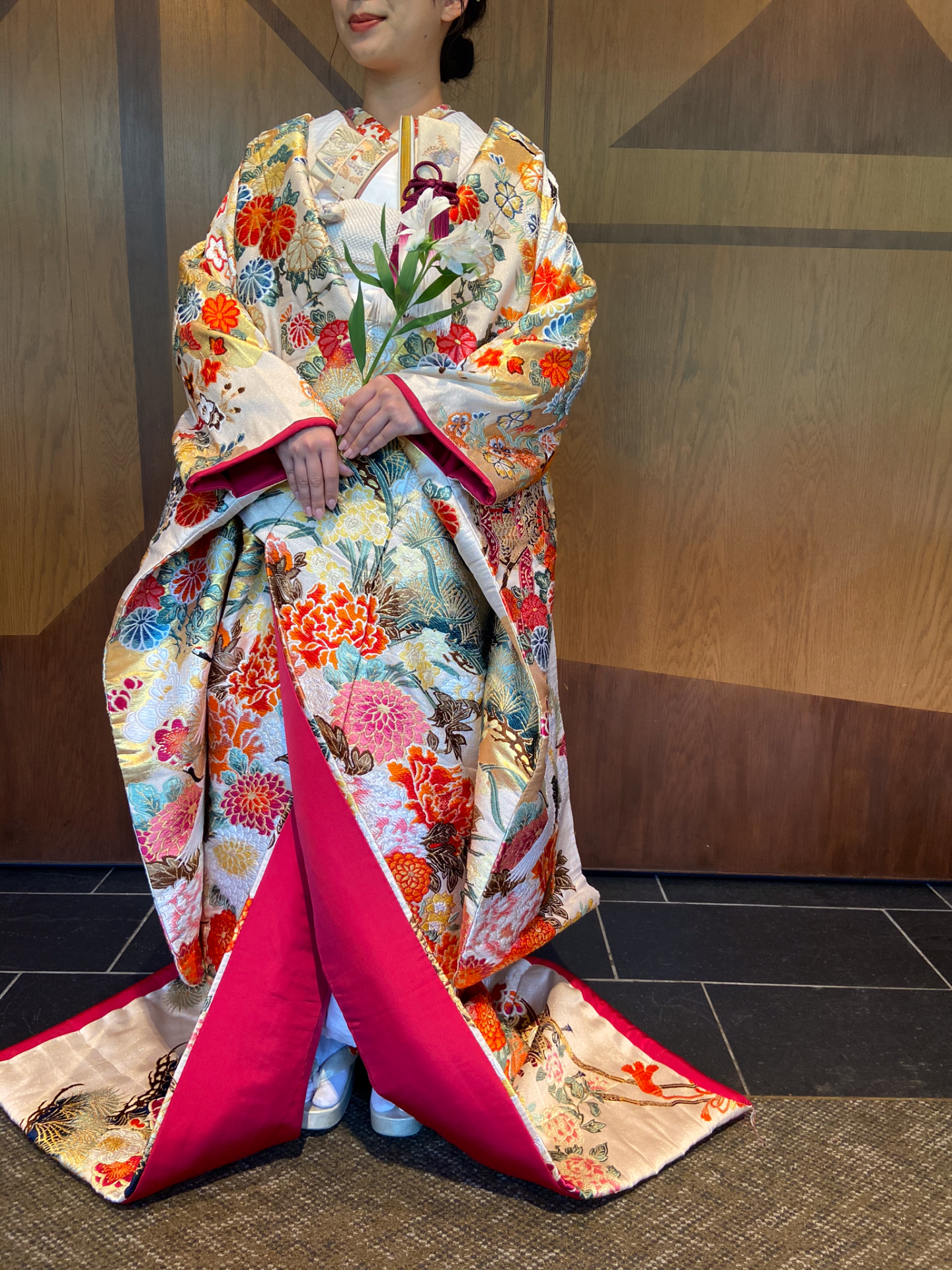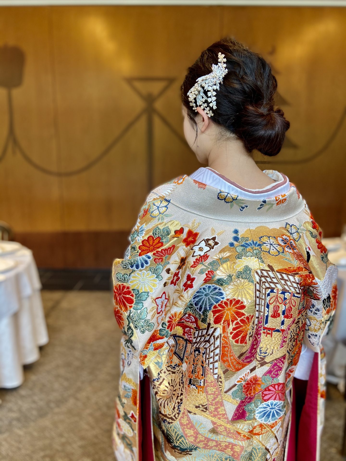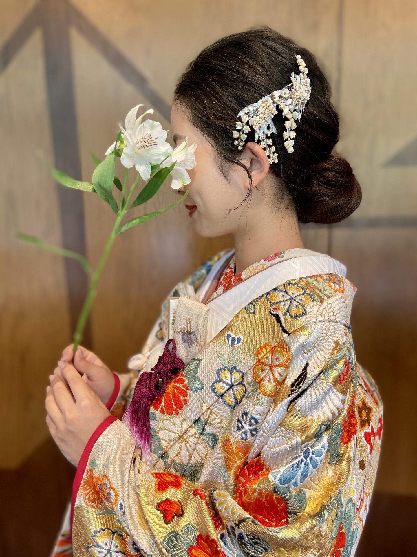お色直しではウエディングドレスとは全く異なる表情を見せる色打掛をセレクト。