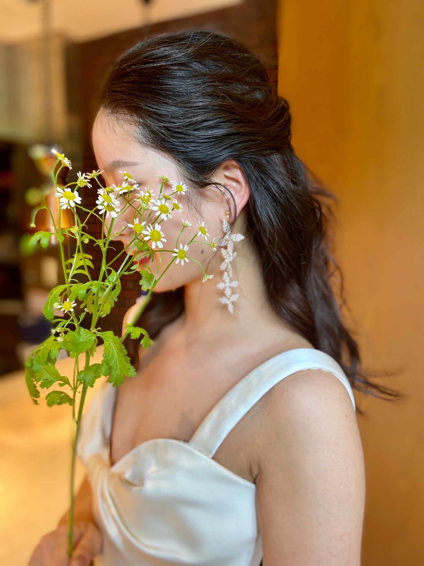 ハーフアップにまとめたヘアスタイルにフラワーシルエットの
