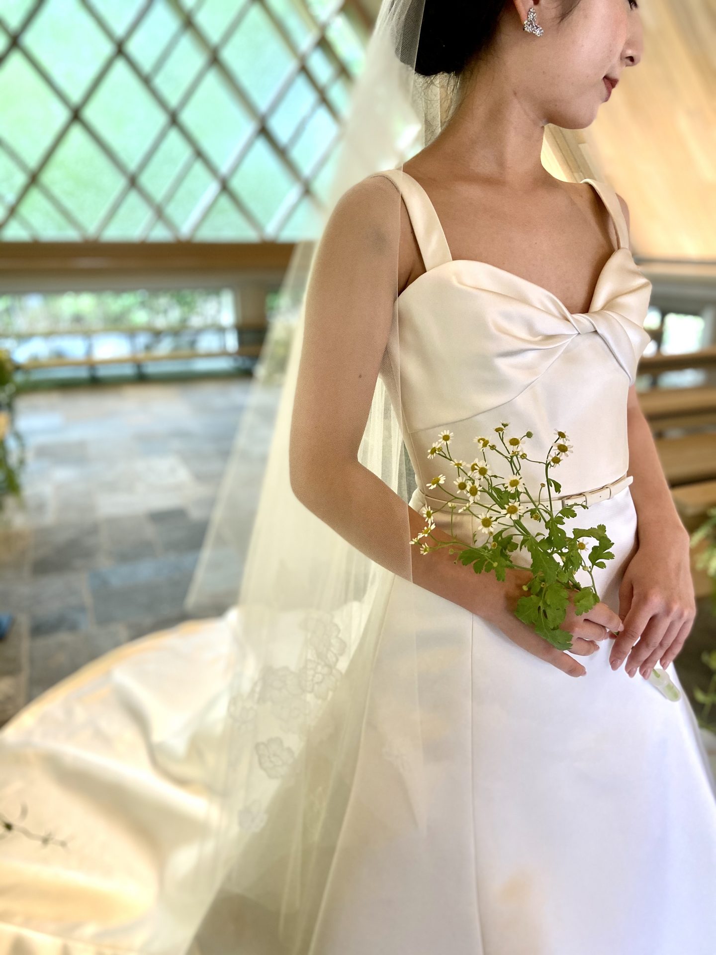 フラワーモチーフのショートベールや小花のブーケを合わせ上品なナチュラルさを演出。