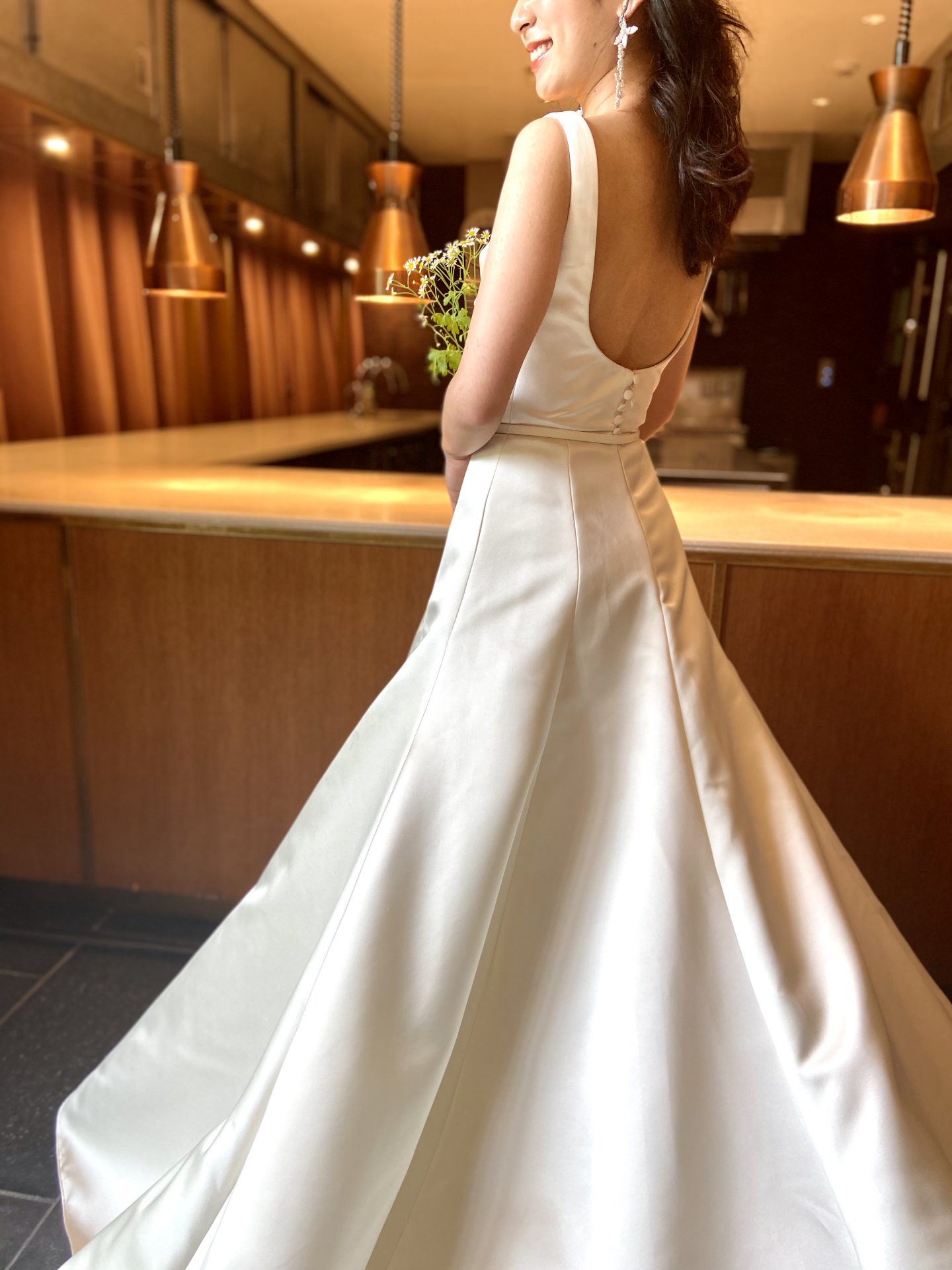 大ぶりのイヤリングを合わせることでチャペルでの洗練された雰囲気とは違った