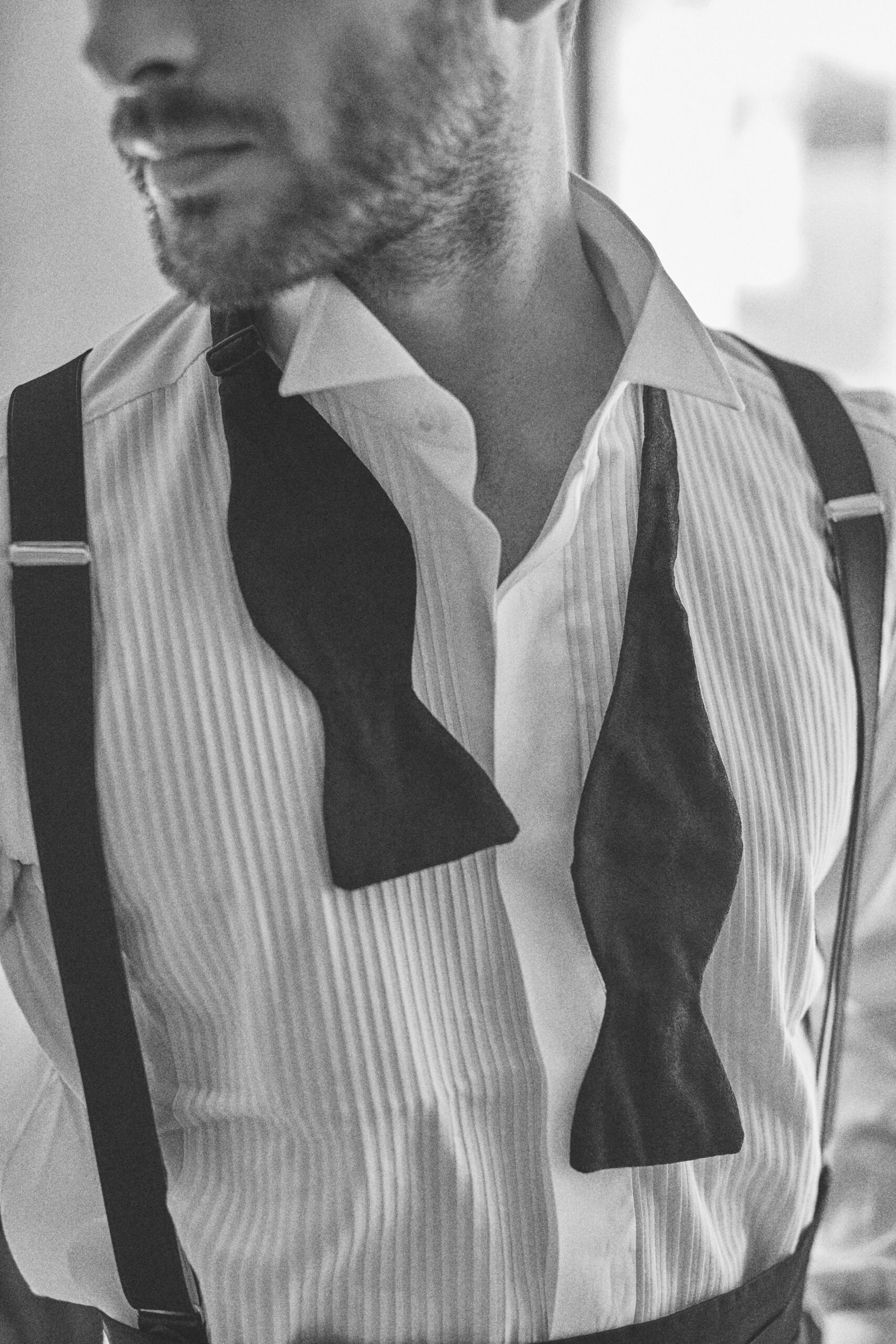 結婚式で着用するシャツを選ぶ際に、押さえておきたいポイントをご紹介します。まず1つ目は襟型ですが、ウイングカラーが最もフォーマルとされております。ウイングカラーのシャツとは、襟先が前に折れており、首を囲むように襟が立ち上がったシャツのこと。襟先の折り返しが鳥の翼のように見えることから、「ウイング(=翼)」と名付けられました。また、前立てを二重にしてボタンを見えなくした「フライフロント(比翼仕立て)」もフォーマルなシーンで着用するシャツのデザインの1つです。そして、胸元の装飾としてプリーツが入ったシャツもございます。現代ではデザインの一つとして着用されていますが、フロント部分に襞を付けた仕様で生地を多く取り、切り替えをつくることで肌が透けて見えてしまわないようにする男性の配慮から始まったディテールとされております。こちらのプリーツに関しては、ベストやジャケットの胸元の見える面積に合わせて有無をお選びいただくと良いと思います。