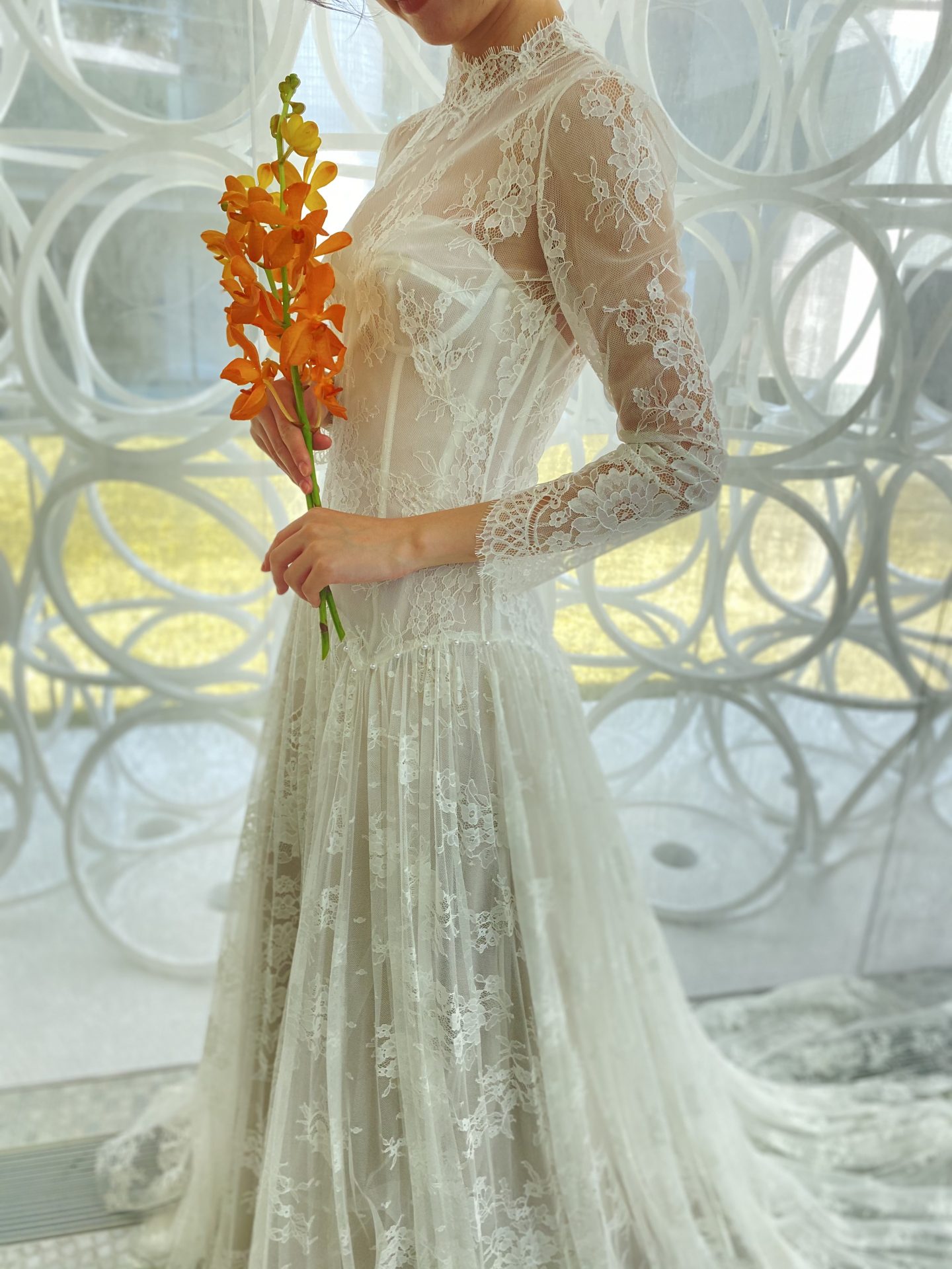 水辺に佇む”eternity”と言う名のチャペル。チャペル内に施された無数のエタニティリングを通して降り注ぐ陽光は、神秘的な印象を与えてくれます。そんなチャペルにおすすめのウェディングドレスはLela Rose(レラ・ローズ)の1着。都会的でファッショナブルなデザインは世界中の花嫁を虜にするブランドです。花嫁の首筋を美しく彩るハイネックのレースのスカラップや、背中に連なる愛らしいくるみボタン、華奢な腕に寄り添うロングスリーブ。そのどれもが印象的で、どこまでもエレガントで可憐なブライズスタイルを演出します。白を基調としたチャペルでゆっくりとバージンロードに歩みをすすめるとき、トレーンのロマンティックなレースにきっとゲストの皆様も感動してくださることでしょう。透明感のあるレースを用いることで、花嫁の美しいウエストラインを表現し、ローウエストの切り替え部分に施されたパールや、贅沢に生地を使った細やかなプリーツスカートが女性心をくすぐります。永遠を誓うエタニティ―チャペルで、ゲストとの「つながり」を育む記憶に残るウェディングをぜひ叶えられてはいかがでしょうか。