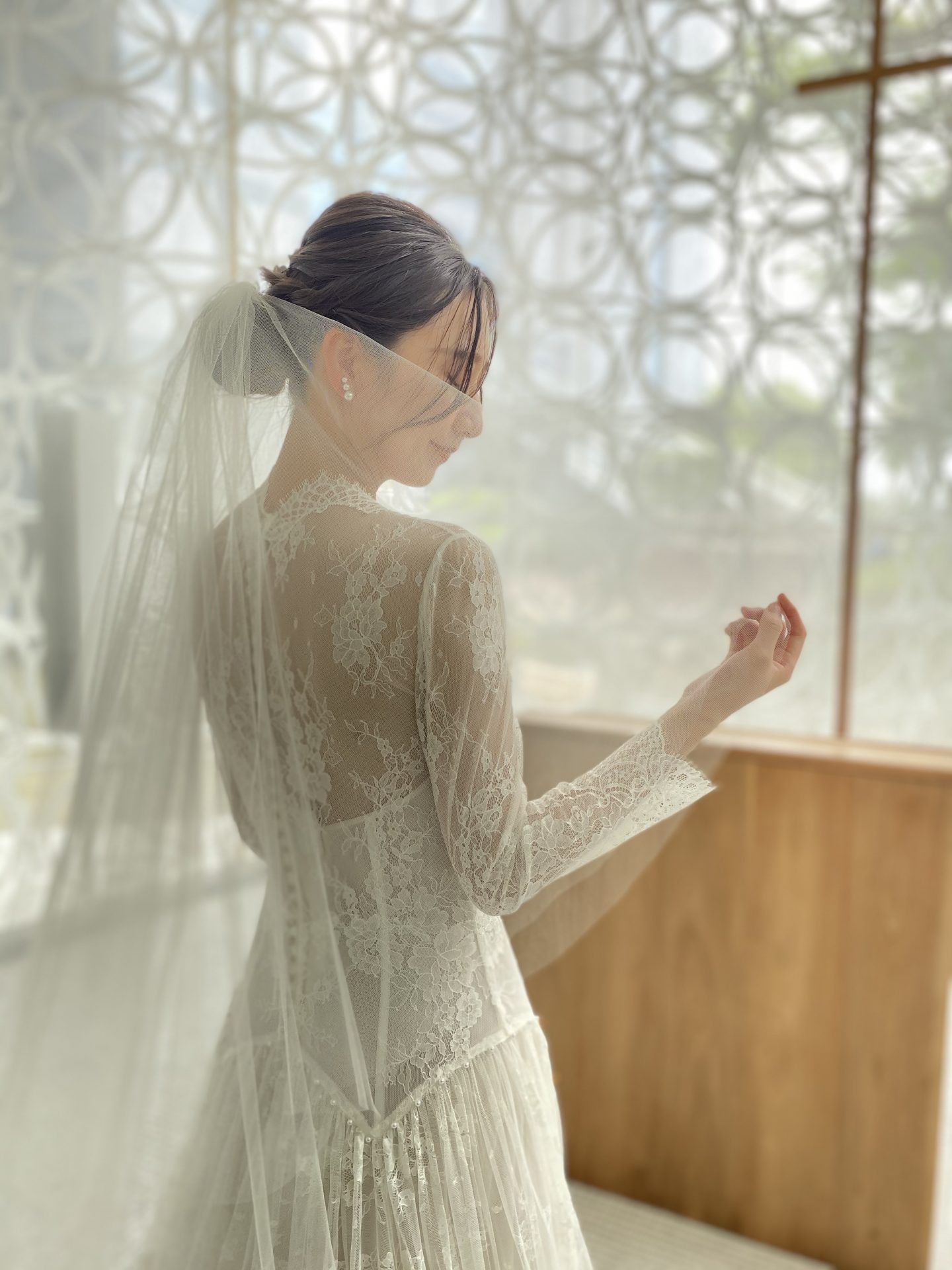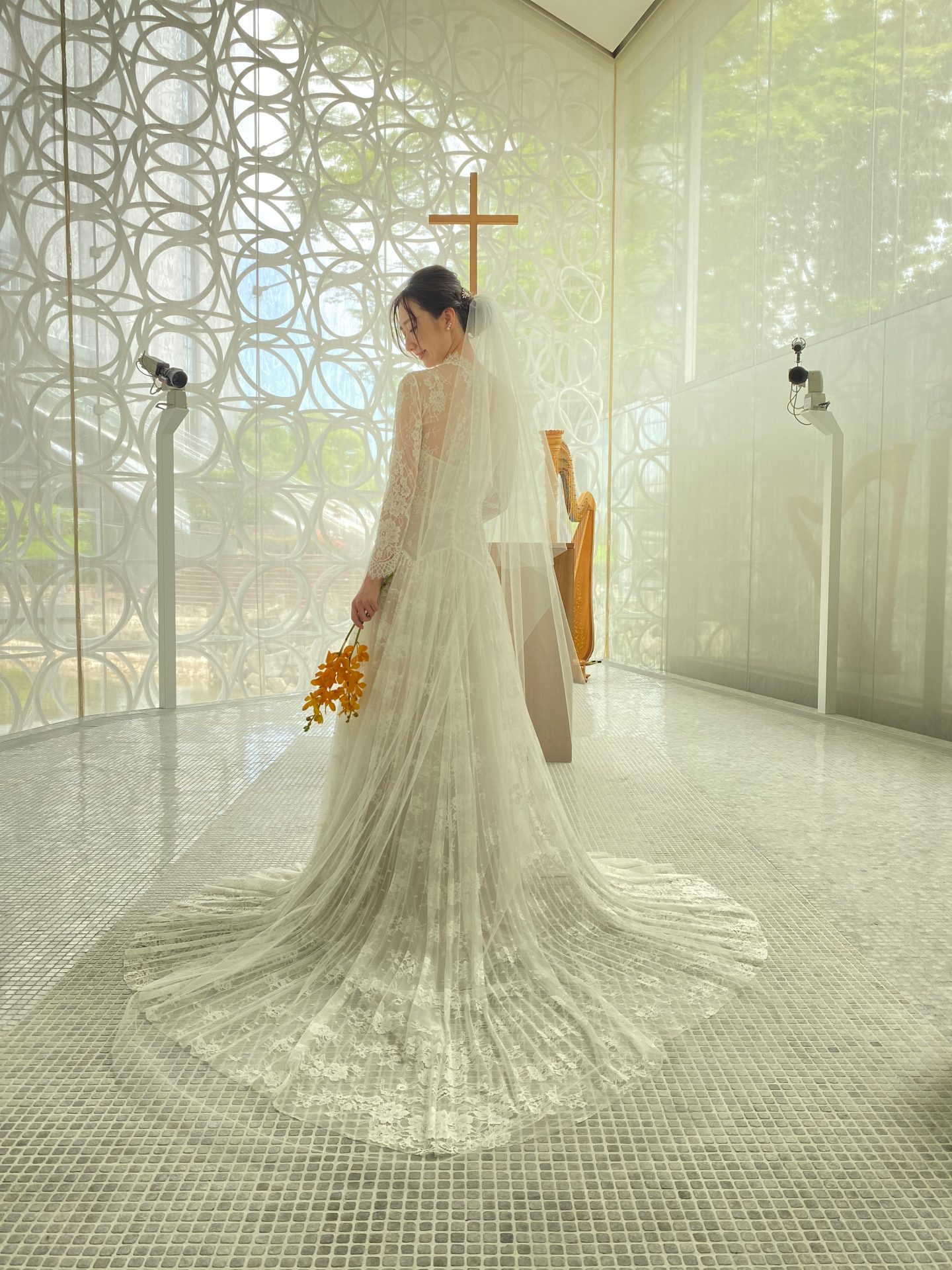 ハイアットリージェンシー大阪のチャペルに合わせたザトリートドレッシングの総レースのウェディングドレス