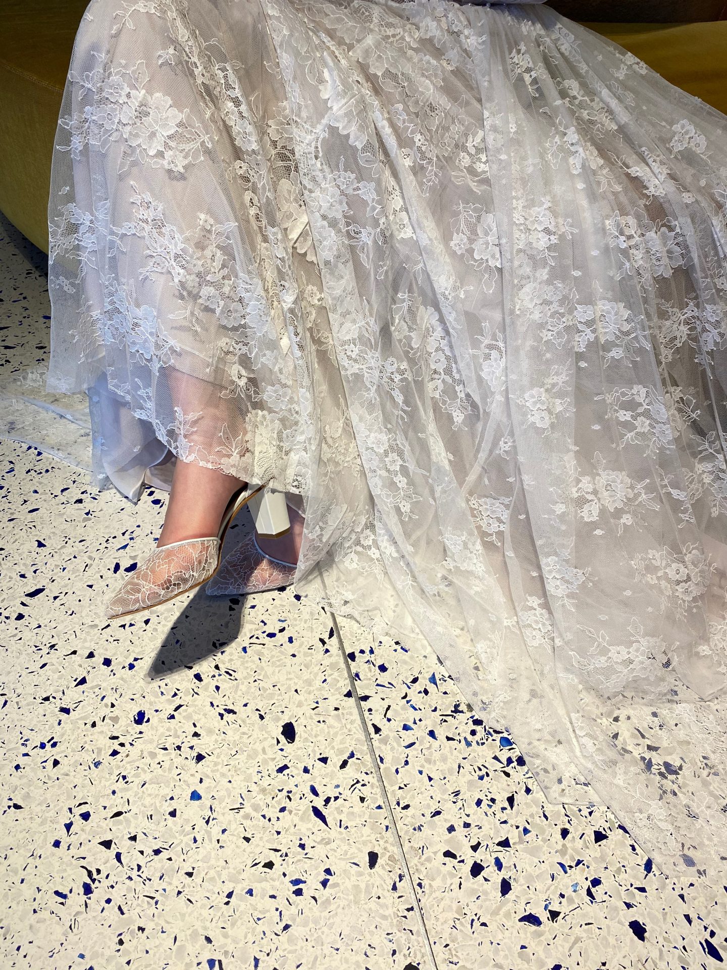軽やかなレースに合わせて、ヘアスタイルはゆるくまとめたシニヨンをセレクト。耳元には小粒のパールを合わせることでノーブルに仕上げます。レース使いが美しいドレスだからこそ、シューズはロマンティックな気分を高める一足を足元からそっとのぞかしてみてはいかがでしょうか。THE TREAT DRESSING(ザ・トリート・ドレッシング)にて取り扱いを開始した、HAAVE(ハーヴェ)の可憐なレースとマットなホワイトのチャンキーヒールのシューズを合わせて。頭の先からつま先までこだわり抜くファッショナブルなブライズスタイルをご提案します。