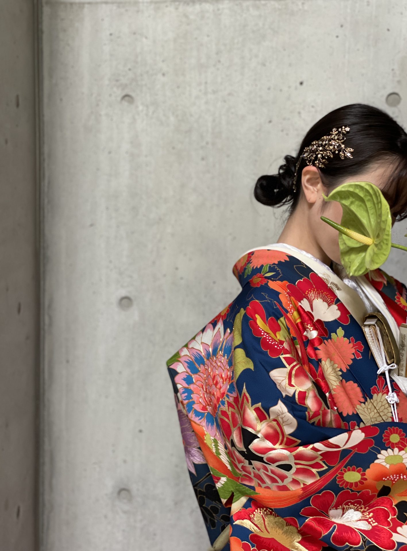 紺色に赤のふきがひと際目を惹く色打掛。一面に大輪の牡丹や菊などの花々が幾重にも重ねて描かれた色打掛は、大胆ながらも優美な印象を与えます。胸元の懐剣、筥迫、末広には優しく深い黄みがかった緑色をセレクト。色打掛の中にお召しになる掛下と胸元の小物たちのトーンを合わせ、女性らしい柔らかな雰囲気も忘れません。胸元の小物に施された金刺繍に合わせて、髪飾りにはアンティークゴールドのヘッドアクセサリーをセレクト。生花とはまた異なるモダンなコーディネートに仕上げました。