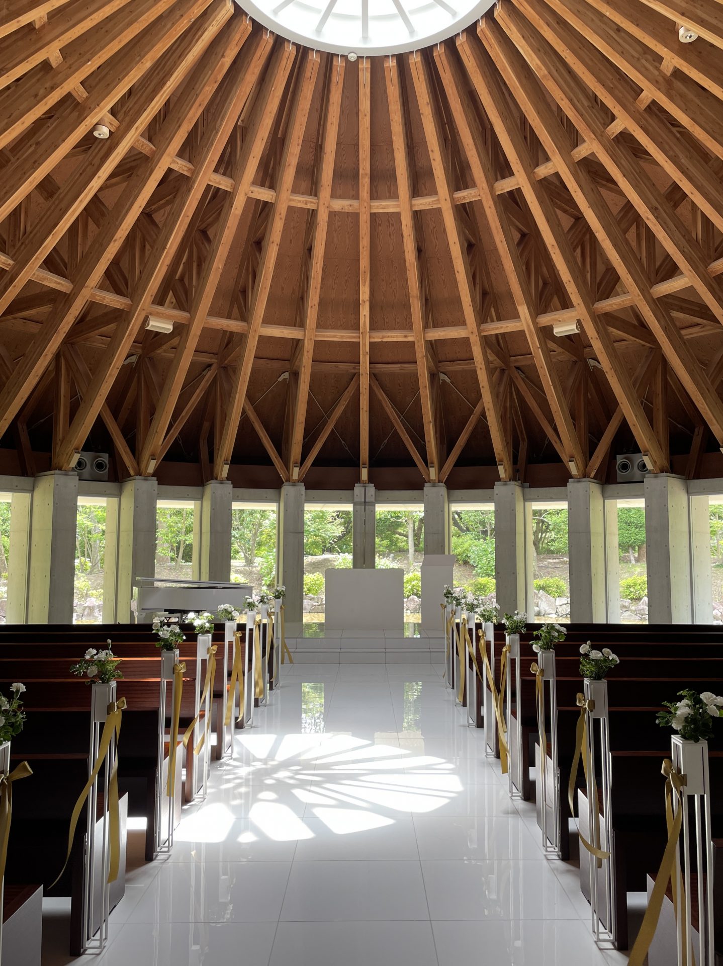 インテリアデザイナーである野井成正が手がけた、和傘からインスパイアされた天井に広がる木組みが美しい芸術的なチャペル。木の香りが神聖な空気の中を穏やかに漂い、開放的な空間が広がります。チャペルに入る前から心惹かれる外観は、太陽の光が水に反射し、円形に造られたチャペルの屋根に煌めきを映し出し、自然の美しさを感じさせます。木組みの温かなぬくもりを感じながら、石造りの壁面がモダンなチャペルには、鮮やかな色味が印象的な色打掛で和装人前式をしてみてはいかがでしょうか。