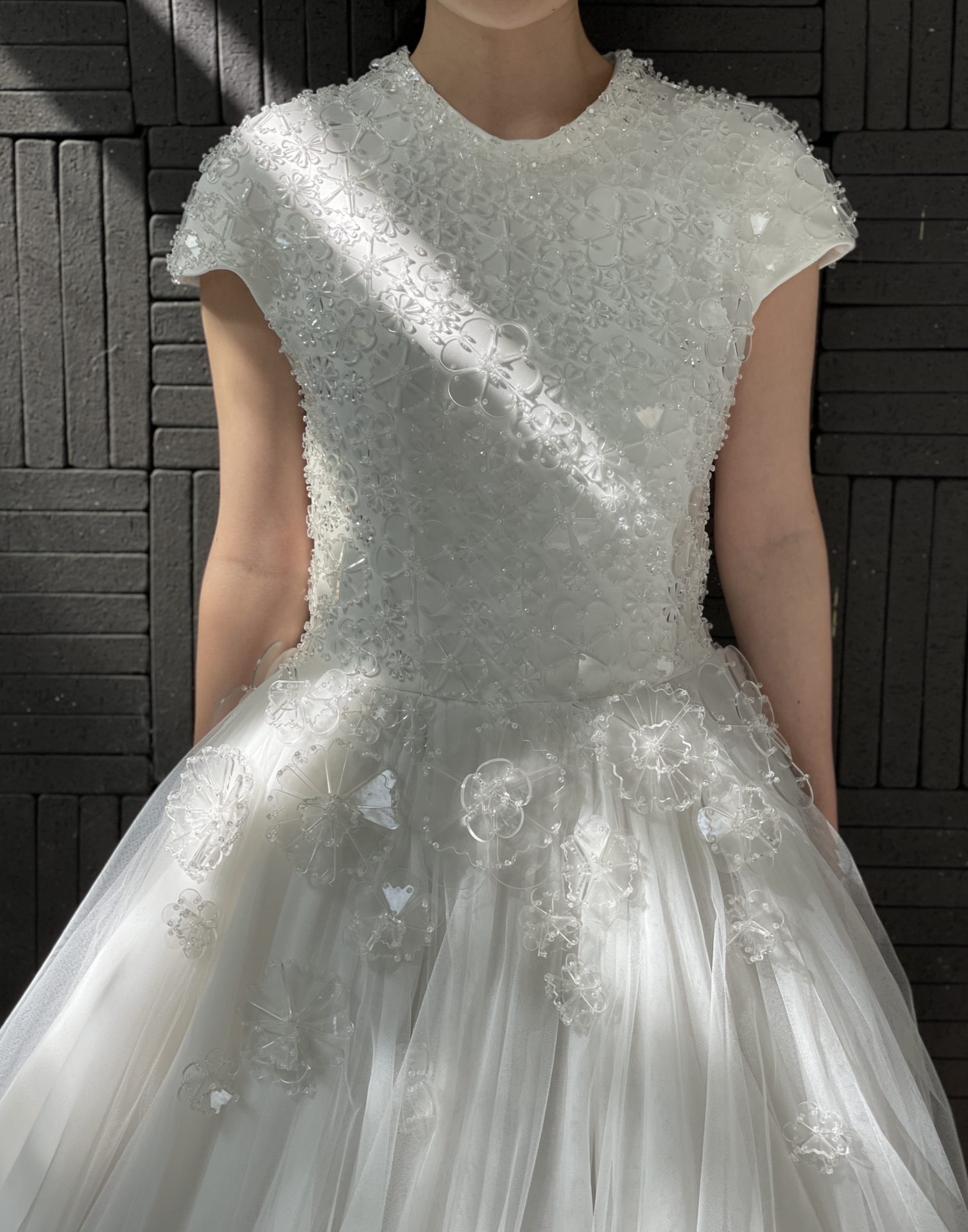 自然光がたっぷり差し込む森の中の別邸。こちらもチャペルと同じく、野井成正がデザインを担ったバンケットです。大きな窓から見える中庭と青い空がパーティーをより明るい雰囲気で照らしてくれます。そんな開放感溢れるバンケットに合わせたのは、柔らかいチュールがふんだんに使用されたVIKTOR&ROLF MARIAGE(ヴィクター アンド ロルフ マリアージュ)のプリンセスラインのウェディングドレス。360度どこから見ても存在感を放つビッグボリュームのシルエットが、花嫁らしい主役感を感じさせます。ゲストの近くに歩み寄るとき、花嫁が動く度にふわっとなびく柔らかいチュールがゲストをうっとりとさせることでしょう。首元まで詰まったミニマムなトップスがカジュアル感も演出。そこに施されたプラスチックで模られたフラワーモチーフは自然光が差し込むと透明感溢れる煌めきに。ゲストに囲まれとびきりの笑顔の花嫁をより一層引き立ててくれます。