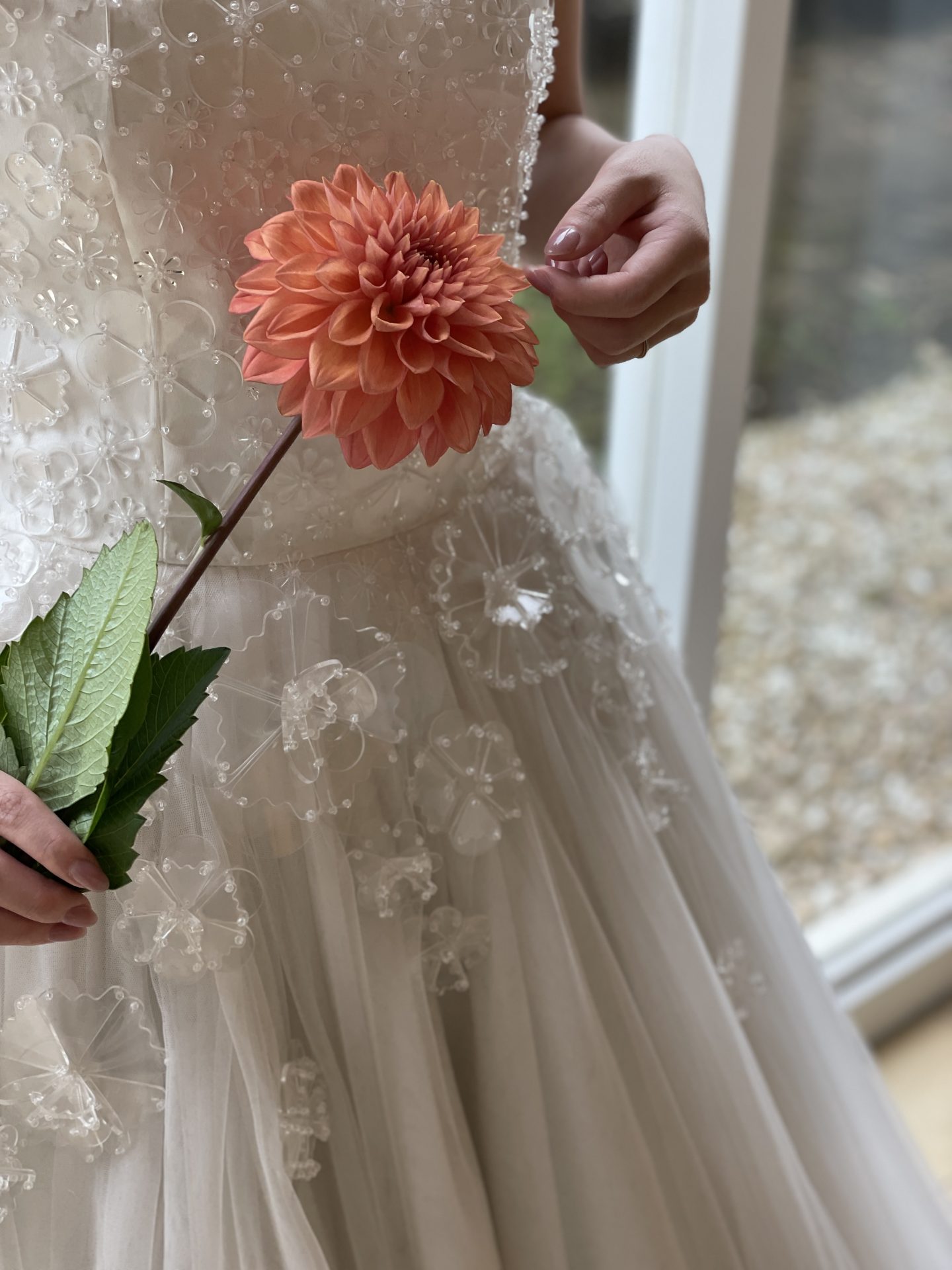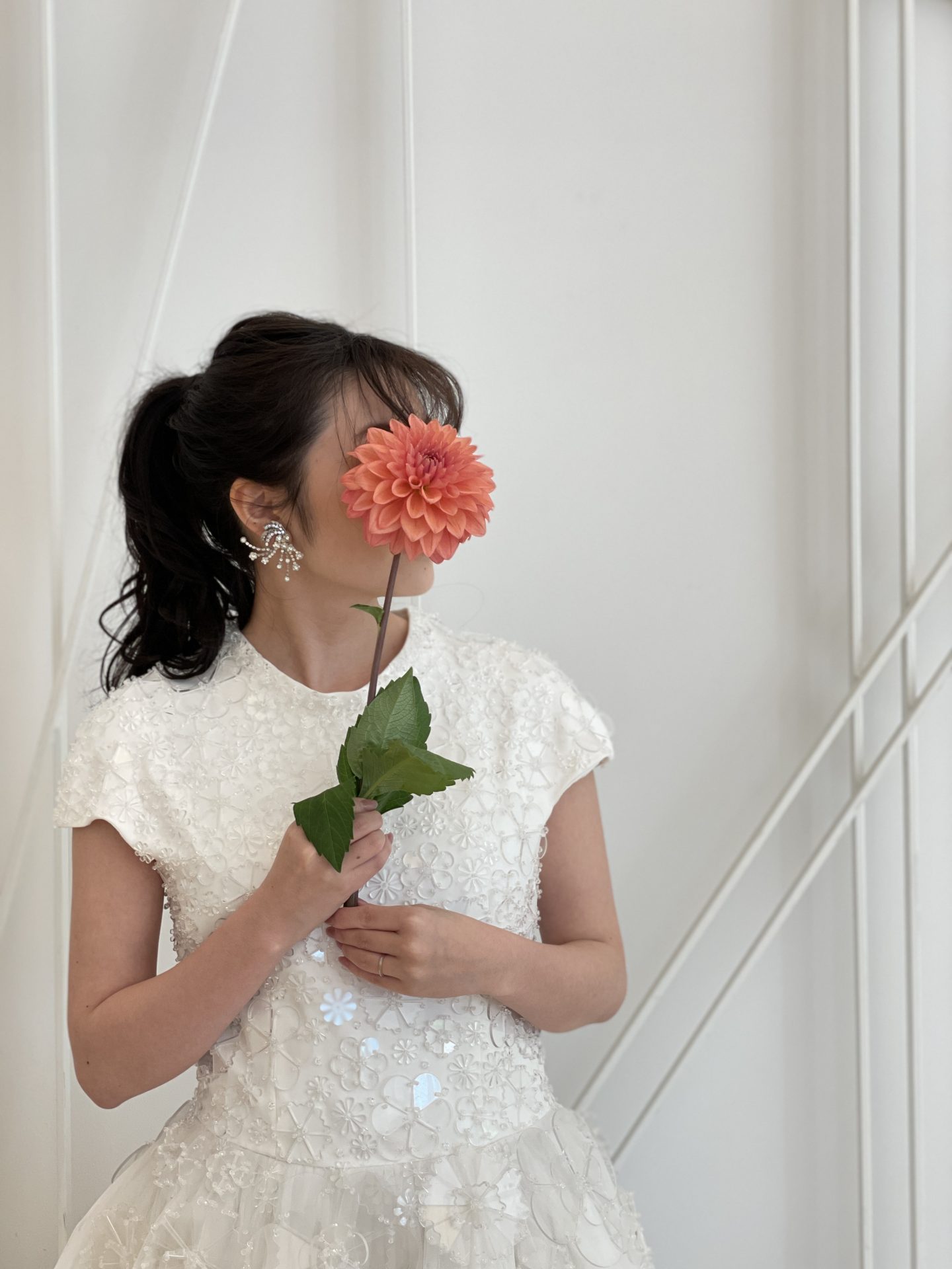 ヘアスタイルはざっくりとまとめた高めのポニーテールで、首元をすっきりさせます。ゴージャスなドレスに大輪のブーケももちろん素敵ですが、鮮やかなオレンジのダリアを一輪だけ合わせ引き算を。大小様々にカットされたフラワーモチーフの装飾と相まって、愛らしい雰囲気になりますね。
