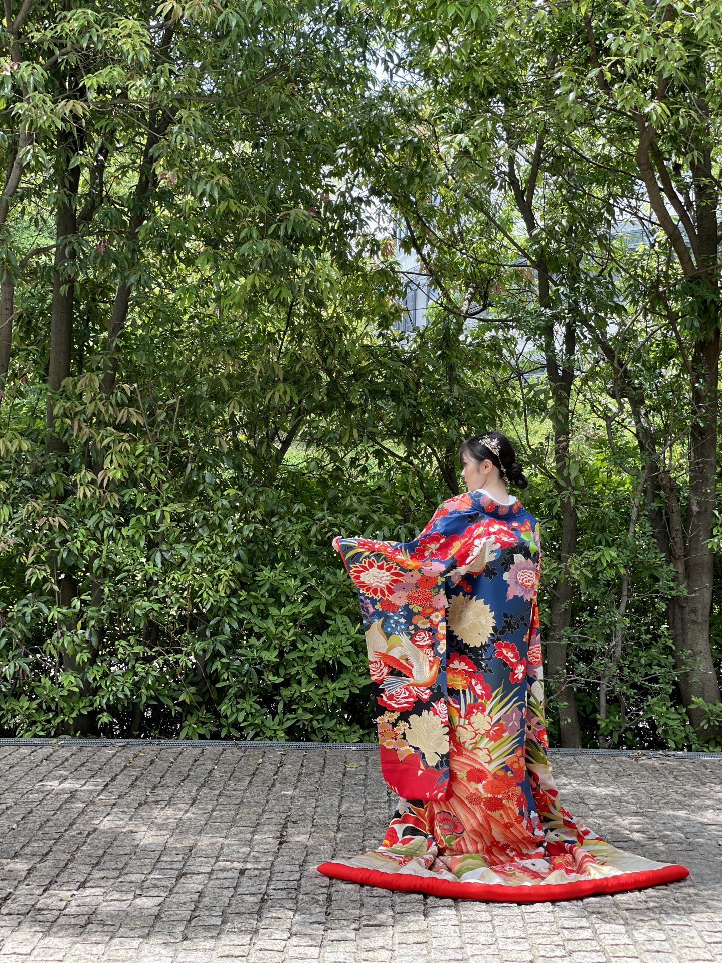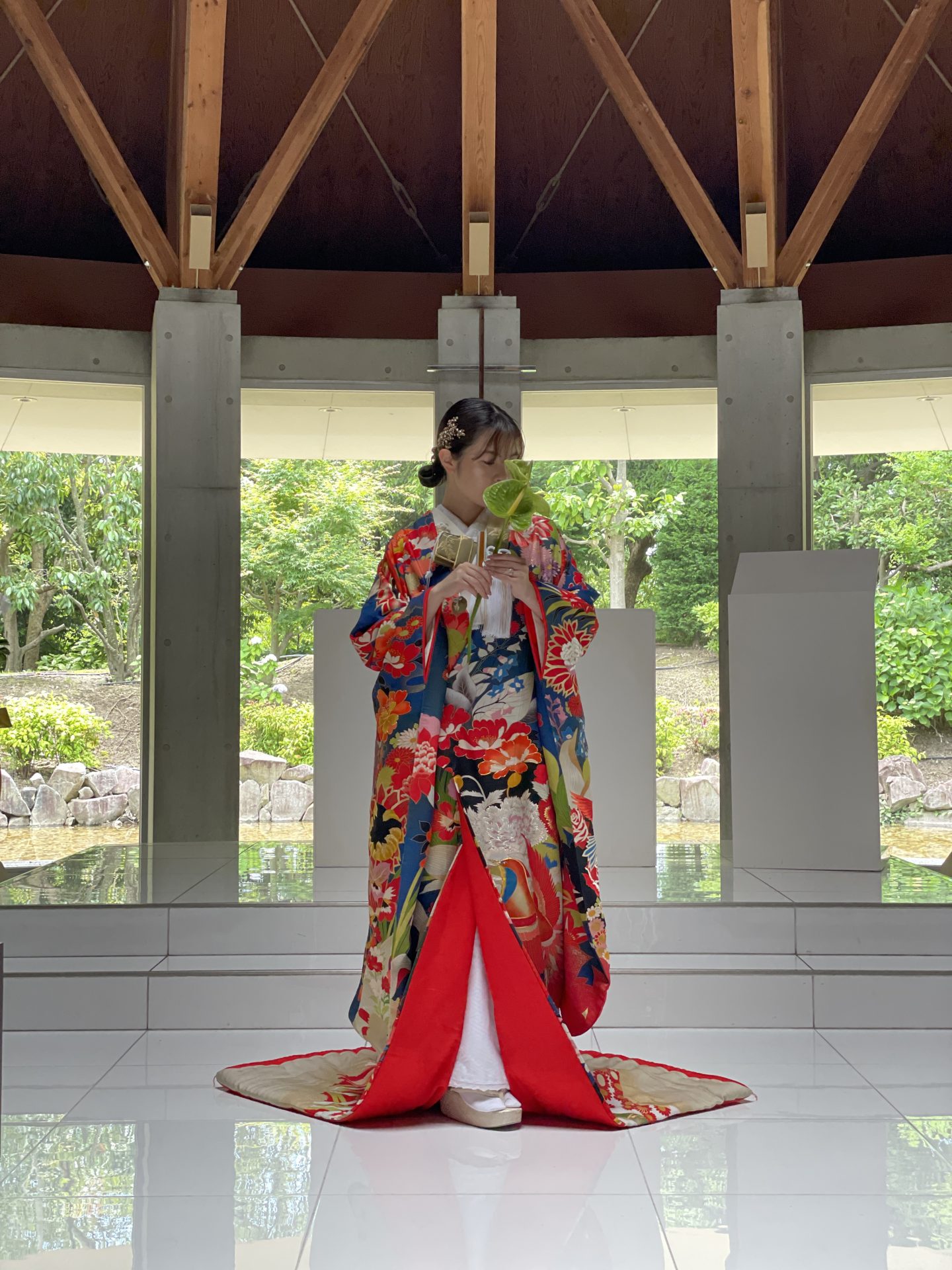 和装での挙式と聞くと、白無垢を思い浮かべる方も多いのではないでしょうか。思わず見上げてしまう圧巻の木組みの天井、静けさの中に鳥のさえずりが聞こえる豊かな自然、中に入った瞬間漂う木の香り、思わず息をのむような神聖な空気。そんな閑静な場所に造られたチャペルに出会い一番に想像したのは、凛と強く佇む日本の花嫁の姿でした。「緑、水、光に包まれた清新で開放的なアーバンリゾートウエディング」にふさわしい鮮やかな色打掛をお召しになり、皆様の前で結婚の誓いをたててみませんか。