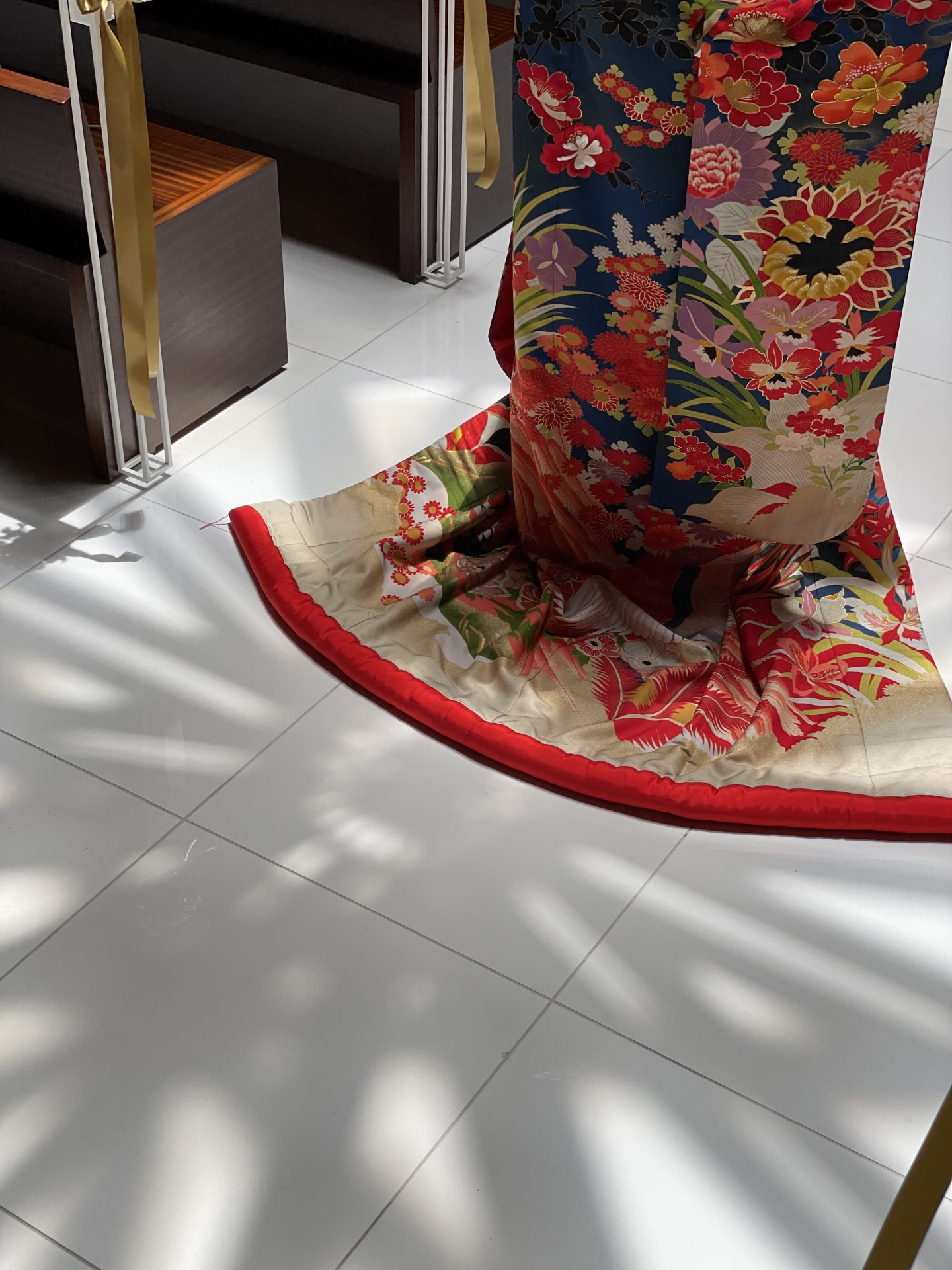 和傘からインスパイアされたチャペルに合わせる紺色の色打掛
