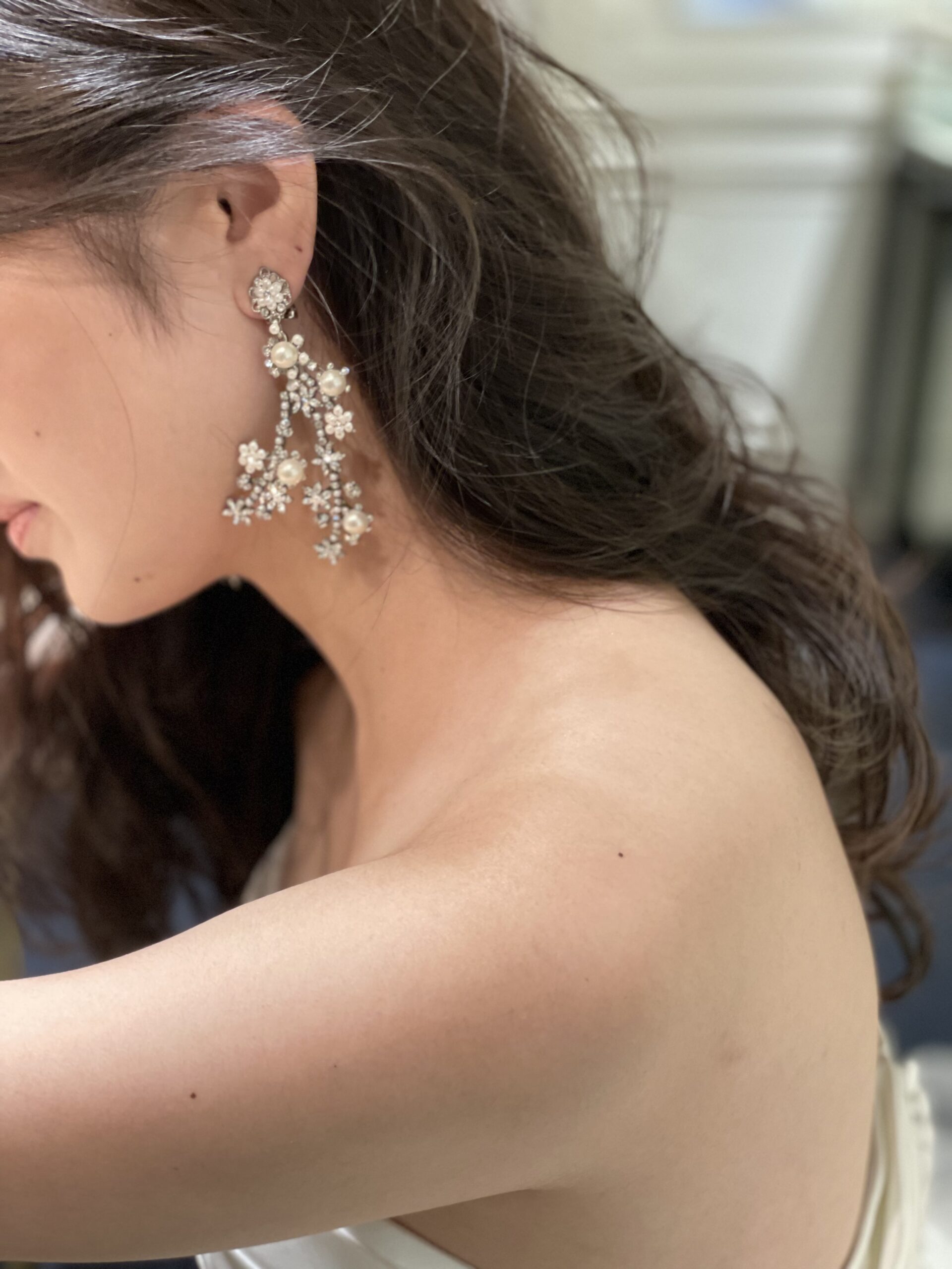 パールが上品さを演出してくれるMARIA ELENA (マリア エレナ)のイヤリングに合わせたのは、多くのセレブリティや世界の皇室から絶大な指示を受けるELIE SAAB BRIDE(エリー サーブ ブライド)のウェディングドレス。”レッドカーペットの王”という代名詞が付くほどのラグジュアリーブランドのドレスには、品よくまとめていただけるシルバーのアクセサリーでコーディネートしました。胸元のリボンが印象的な光沢のあるサテン生地のトップスと、たっぷりのチュール生地を使用した美しいシルエットのスカートが存在感を放ちます。ゆるく巻いたダウンヘアとデザイン性のあるイヤリングを合わせていただくと、抜け感のあるこなれたスタイルに。大振りで大人な印象もあるイヤリングですが、小花のモチーフが女性らしい愛らしさを表現してくれるのもポイントです。歩みを進めるたびに優雅に揺れ動いてくれるので、顔まわりの輝きをアップしてくれますね。クラシカルで華やかさのあるこちらのスタイルは、ホテルでお式をされる方にもおすすめのコーディネートです。