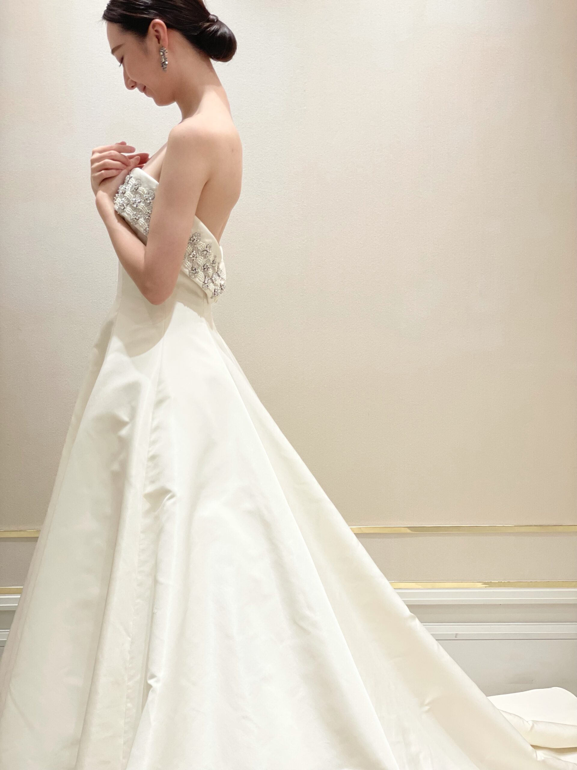 自身の結婚を機にドレスデザインをスタートさせたデザイナーのアムサーラ。いつもモダンで自信があり、自分らしいスタイルを持っていた彼女がデザインしたドレスは華やかなドレスが人気だった時代のウェディング業界に衝撃を与えました。そんなアムサーラらしいデザインを感じさせてくれるシンプルなデザインの中に胸元のクリスタルビーディングが上品な華やかさを表現してくれる1着。バックスタイルからは胸元のデザインが襟元のように折りたたまれており、ファッショナブルなディティールがモダンなデザインに。腰元から広がるAラインのシルエットはウエストの切り替えがない分、ラインを美しく見せてくれます。生地はシルクタフタを使用することで歩くたびにスカートがふわりと広がり軽やかな印象を与えてくれます。シンプルだからこそ上質な素材と美しいシルエットを計算して追及しているアムサーラだからこそのデザインですね。どこかクラシカルさも漂うこちらのドレスにはシルバーのキャッチーなイヤリングのみを合わせ、髪型はタイトなシニヨンでまとめました。ドレスのシルエットや胸元のデザインが際立つようなシンプルなコーディネートが気品のある花嫁像を叶えてくれます。上品なデザインだからこそ、クラシカルなホテルや歴史を感じられる落ち着いた会場にもマッチする1着ではないでしょうか。