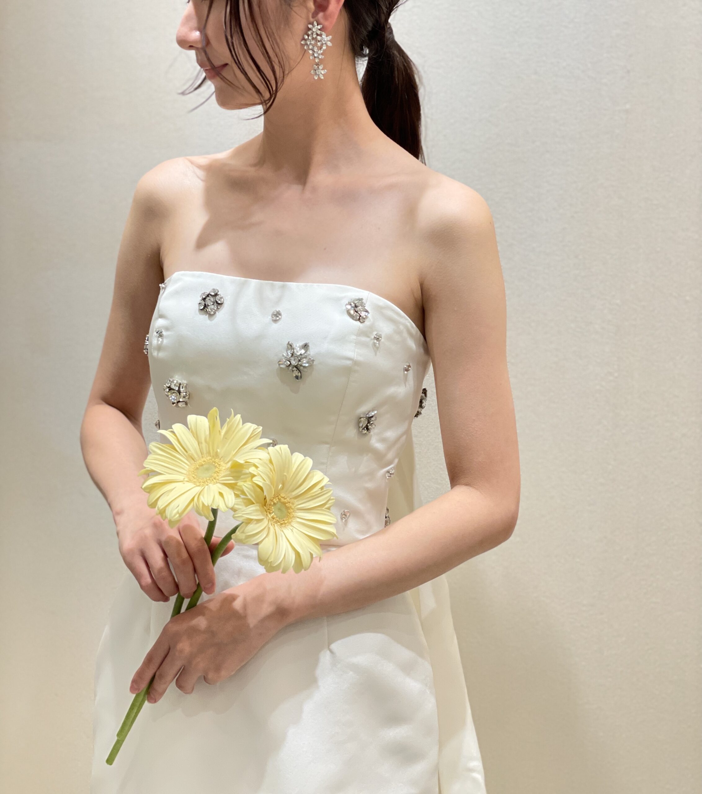 アムサーラの最大の魅力でもあるタイムレスな美しさが表現されたスレンダーラインのトップスに煌めく大粒のビジューが目を引く1着。バックトレーンは歩みを進めると背中から颯爽と流れるようにデザインされ、スレンダーラインのドレスをより華やかでスタイリッシュな印象にしてくれます。そんな都会的なウェディングドレスに合わせるスタイリングは緩く巻いた前髪に低めのポニーテールでエフォートレスな雰囲気に。イヤリングは柔らかさも演出していただけるように小花がまとまったシンプルなデザインでコーディネート。20年後も写真を見返して美しいと思えるシンプルなコーディネートだからこそ、ドレスと花嫁が創り出すドラマティックさを最大化していただけます。軽やかで爽やかな生地に淡い色味のお花を合わせることでスタイリッシュな中に優しく柔らかい雰囲気がプラスされ、親しいゲストの方とアットホームにお過ごしいただくドレスとしても、おすすめです。