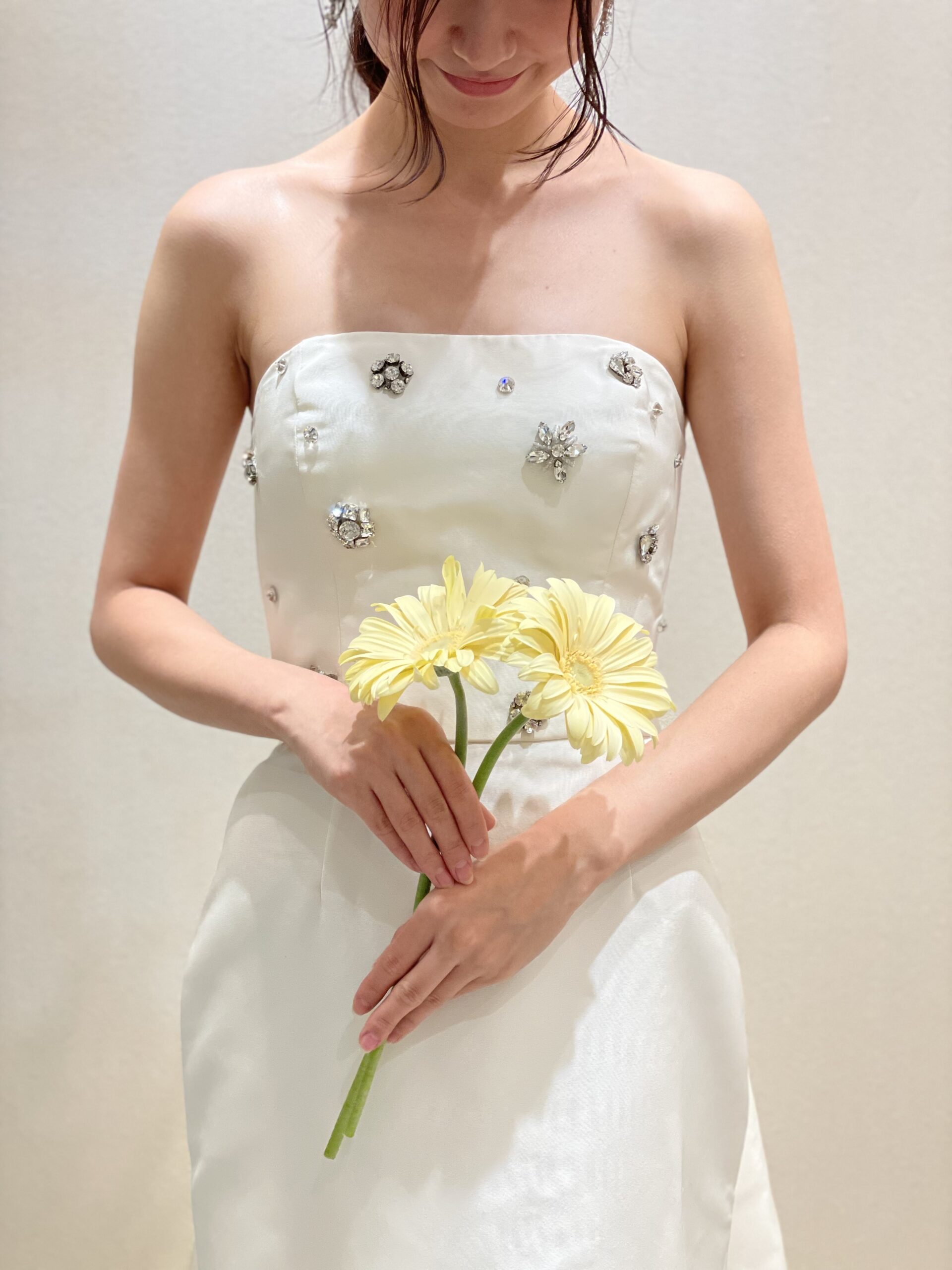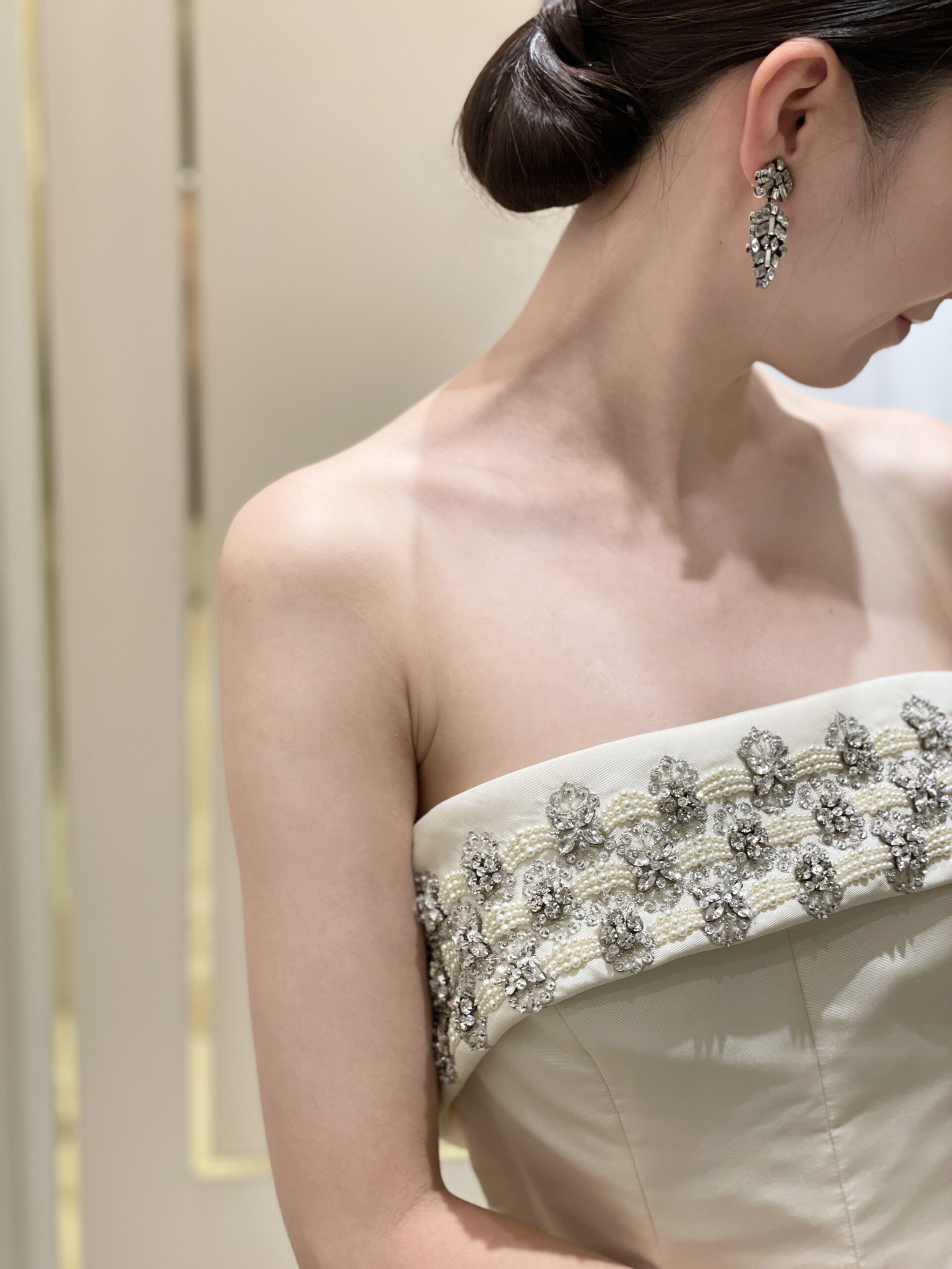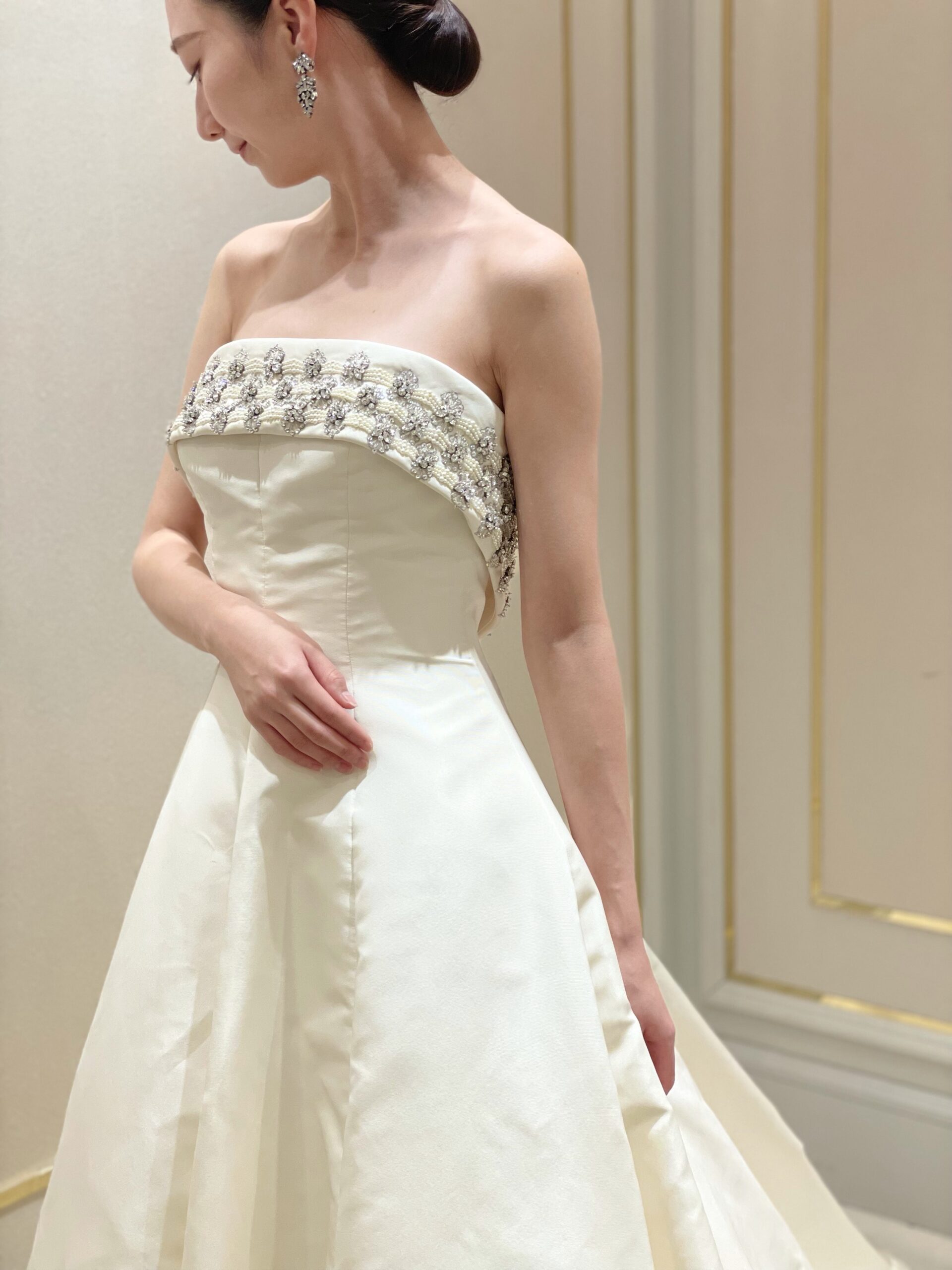 胸元のクリスタルビーディングが気品溢れるウェディングドレス