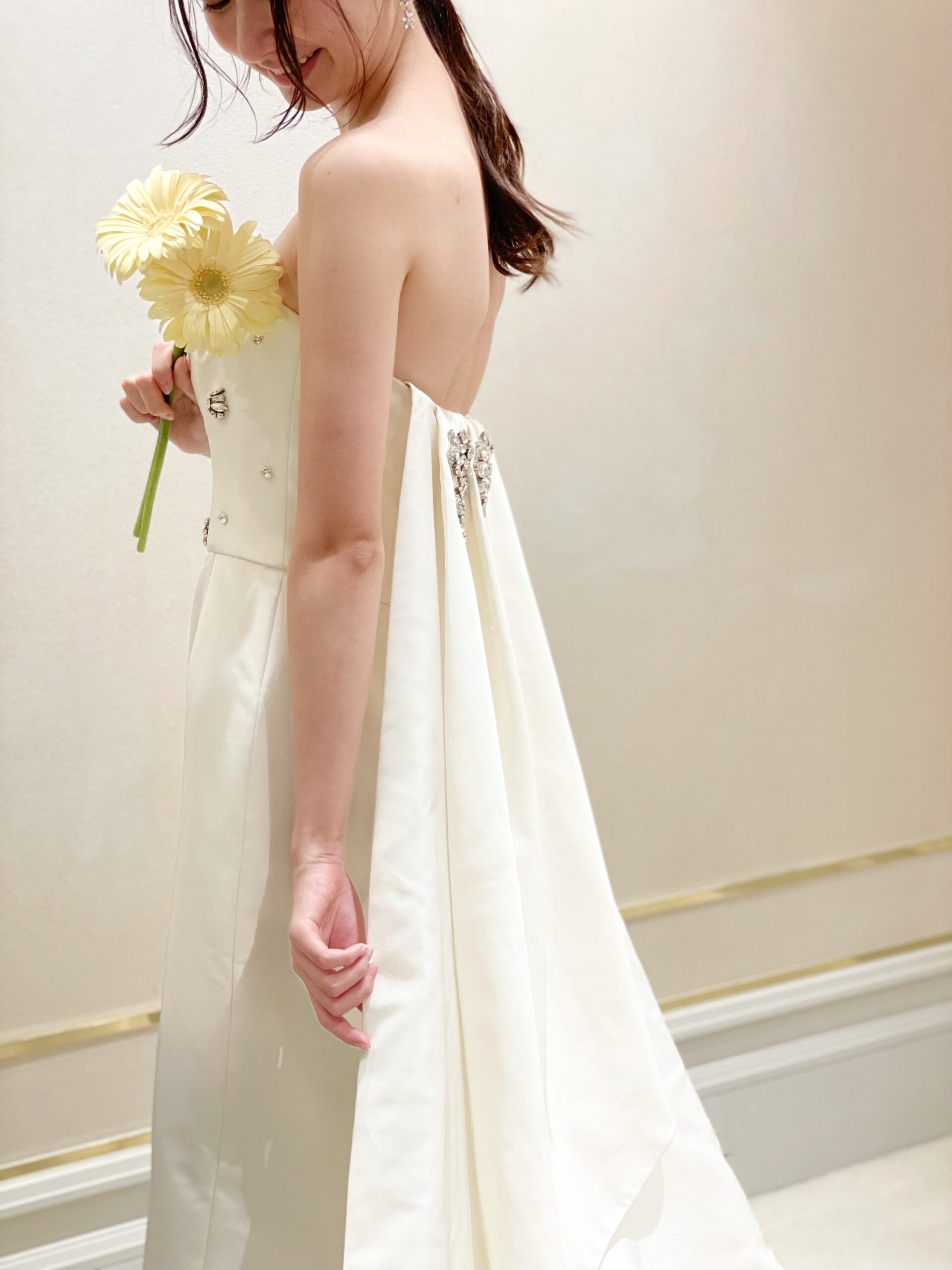 関西のナチュラルな結婚式会場におすすめしたいスレンダーラインが美しいシンプルなウェディングドレストリートドレッシングで取り扱いをしているアムサーラのトレーンが長いスレンダーラインのウェディングドレス ザ ガーデンオリエンタル大阪におすすめのアムサーラのビジューが付いたスレンダーラインのウェディングドレス