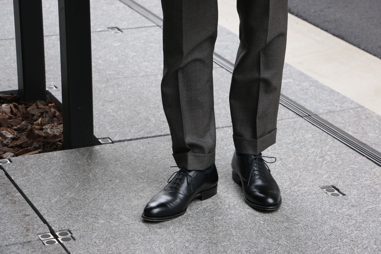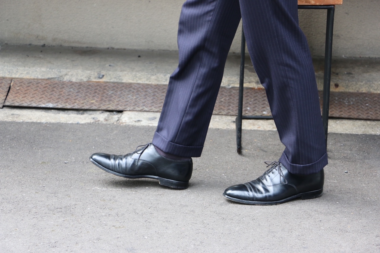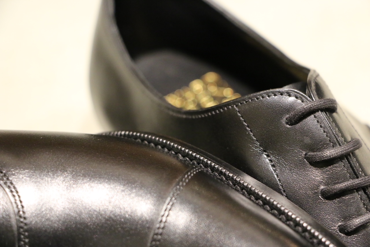 シューズのディテールとしてトゥの次に目を引く部分で、靴紐を通す皮の部分を羽根と呼びます。その部分がアッパーの部分と一体になっており甲の皮に入り込む形を内羽根式、羽根が甲の皮の上から外付けされた形を外羽根式といいます。(写真右が内羽根式:左が外羽根式) 外羽根式はもともと軍靴がルーツとされており、羽根が外付けされていることで可動域を優先して作られたシューズで内羽根式に比べるとカジュアルなシューズ。黒のプレーントゥの外羽根であれば近年ではフォーマルなシーンでも多用されます。スポーティーな印象でジャケパンスタイル等に合わせても素敵です。内羽根式は羽根がしっかりと閉まりきる為、上品な印象を与えます。ドレッシーなシューズをお探しの方は内羽根式のシューズに足を入れし、ぜひ外羽根式との違いをご覧いただき、お好きなシューズをお選びください。ザトリートドレッシング大阪店がご紹介するご新郎様におすすめのフォーマルシューズ