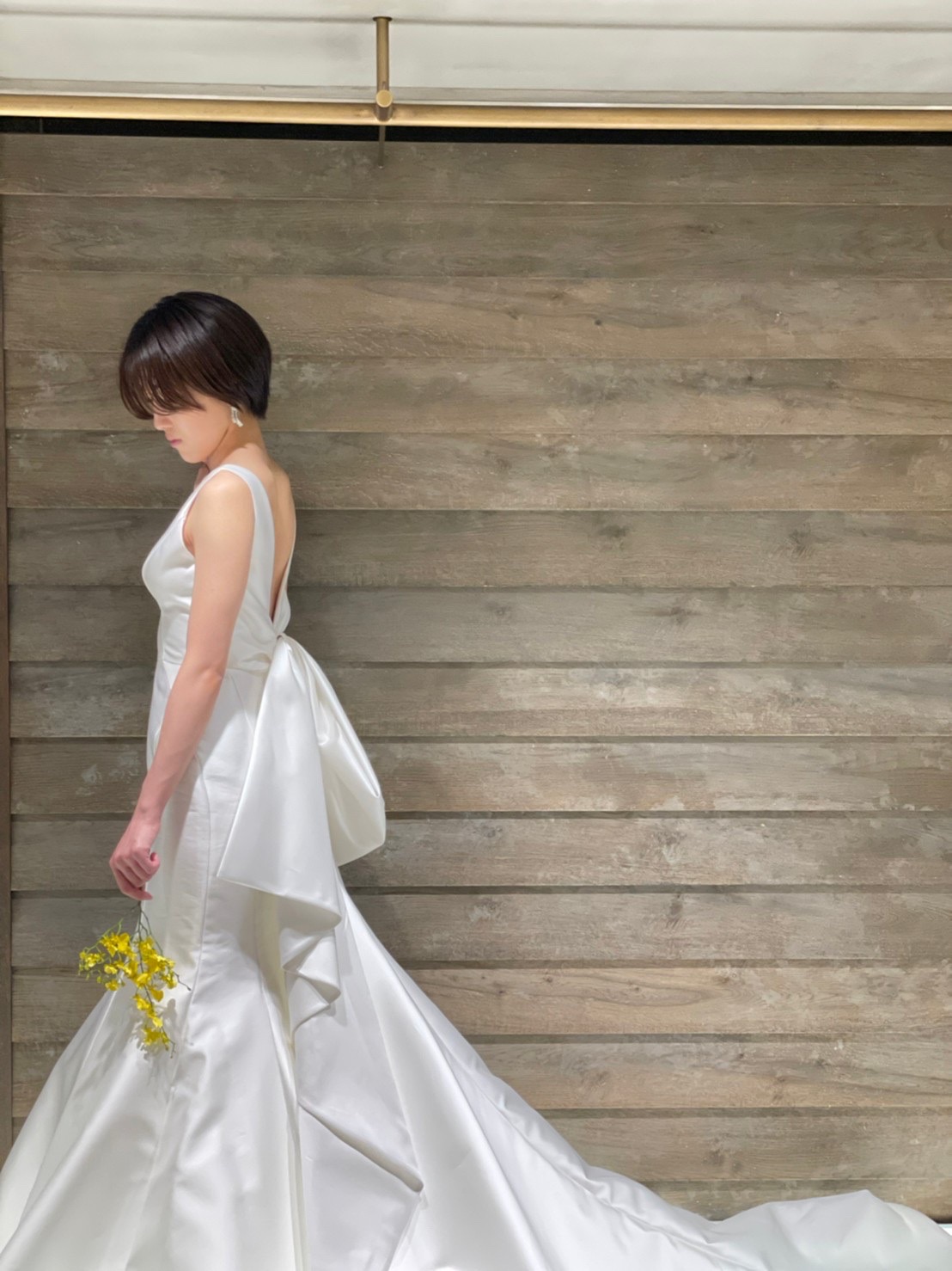 マーメイドラインのお身体にフィットする女性らしい曲線がエレガントで大人な一着。上品に広がるドレスの裾元がシンプルなドレスに存在感を放ちます。一切装飾のないデザインだからこそ、光沢感の美しい上質なサテン生地を贅沢に使用することで花嫁自身がお持ちのシルエットの美しさを更に際立たせてくれます。深く開いたネックラインですっきりとしたフロントスタイル、ウエストの切り替え位置から膝下に広がるスカートライン。ウエストやデコルテのラインを美しく魅せるシルエットにこだわり抜いたキャロリーナ ヘレラだからこそ生み出せる完璧なシルエットです。バックスタイルはフロント部分のシンプルなデザインに比べ、インパクトのある大振りのリボンが施されたバックコンシャスなデザイン。ギャップのあるデザインはきっとゲストの方も心を奪われるはず。ショートヘアの髪型と合わせるとスタイリッシュな印象になりますが、大胆なカッティングから覗く首筋やお背中が女性らしさをプラスしてくれます。シンプルだからこそ、ご自身らしさを存分に引き出してくれるこちらのドレスは、身に纏っていただいた瞬間、きっと自信に満ち溢れ気分の高まりを感じるはず。