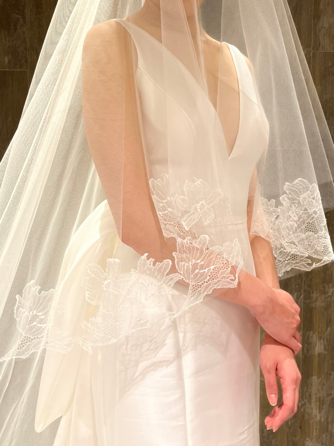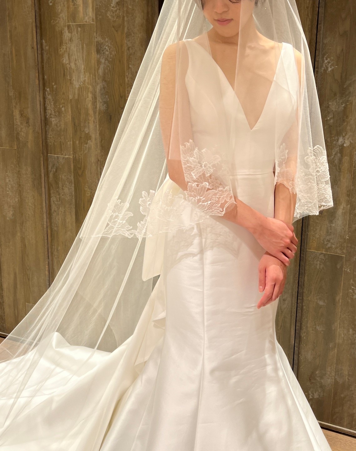 トリートドレッシングのシンプルなマーメイドラインのウエディングドレスにトリートメゾンのレースのベールを合わせたコーディネート