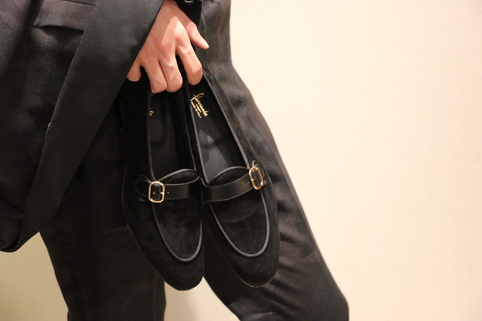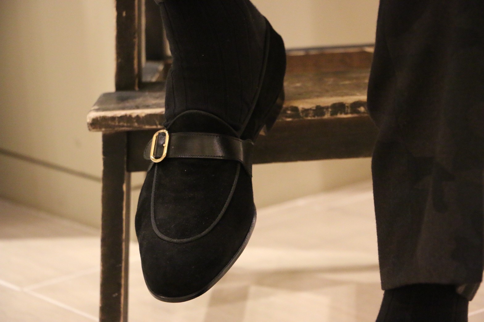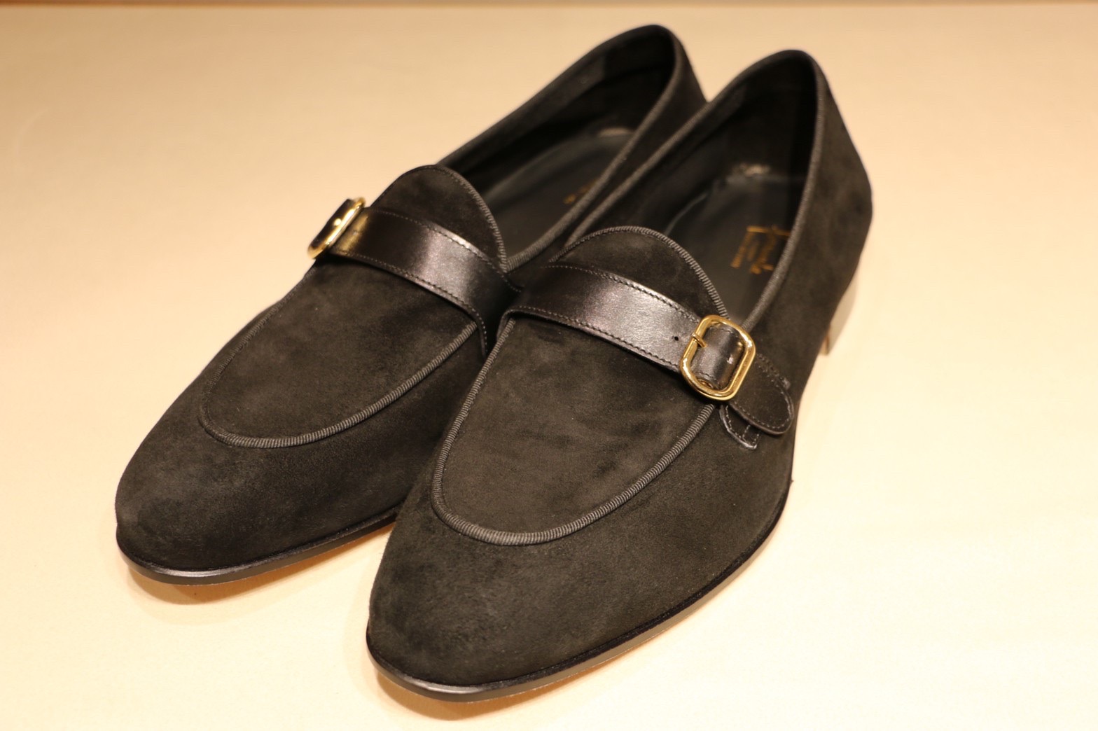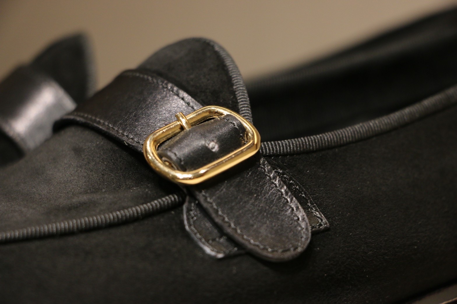 スエード生地のベルジャンシューズにベルトを施したシングルモンク。ベルトの部分はゴールドをセレクトし、クラシックな雰囲気を漂わせ自然と男性の感性を引き立てます。スエード生地の柔らかさとベルトの部分の皮は立体的な動きがあり、豊かな表情を持ちます。洗礼された綺麗な印象ですが、どこか男くささを感じさせるエレガントな一足。