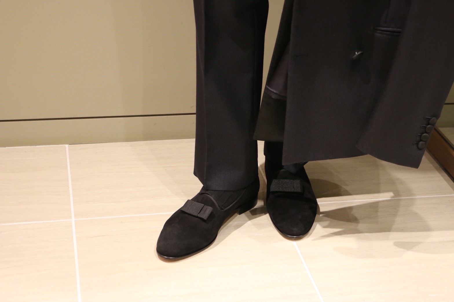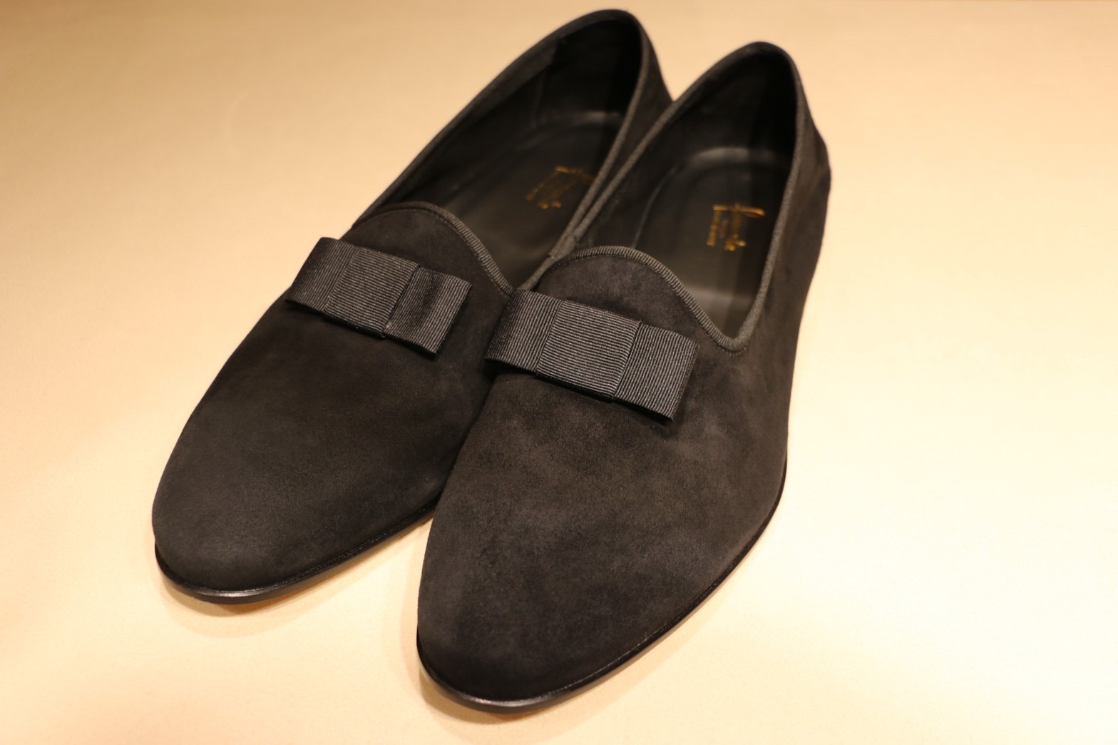 甲にリボンがついたオペラパンプスのような、スエード生地で仕上げた上品なベルジャンシューズです。王道のエナメルではなく素材を外すことで足元にどこかモダンさを演出します。毛足の短いスエードの為カジュアルすぎずタキシードにも合わせやすい一足。デザインとしてはフェミニンさを感じさせますが、男性がお召しになることでどこか色気を漂わせます。