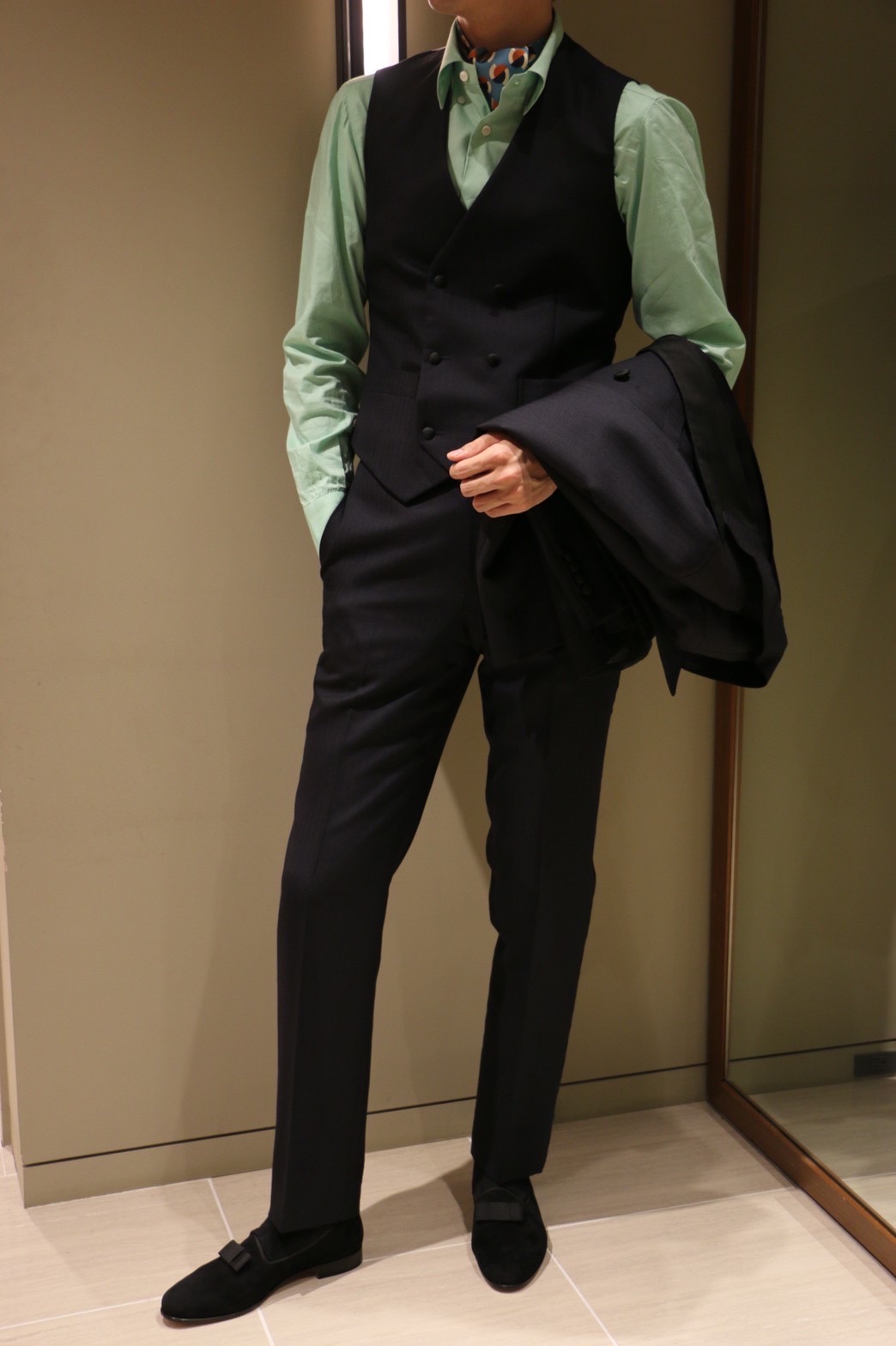 重厚感のあるミッドナイトブル―のウェアにあえて多少フェミニンな印象をもった小物を合わせスマートなスタイルにしてくれます。目を引くダブルブレストのベストスタイルに、小物は爽やかな色味を合わせてコーディネート。首元はネッカチーフスタイルとシューズもカジュアルアイテムを起用していますが、オペラパンプスのデザインはドレッシーな印象を残すので崩し過ぎずまとまりのあるスタイルに。ナイトウェディングにも相性良く、色気のある雰囲気の中にも清潔感があるコーディネートです。