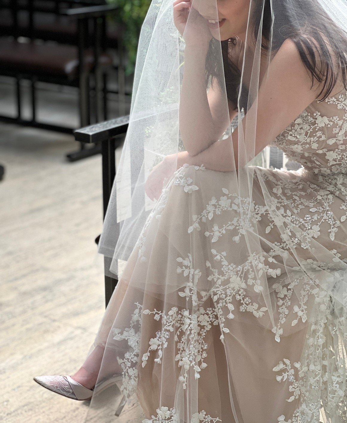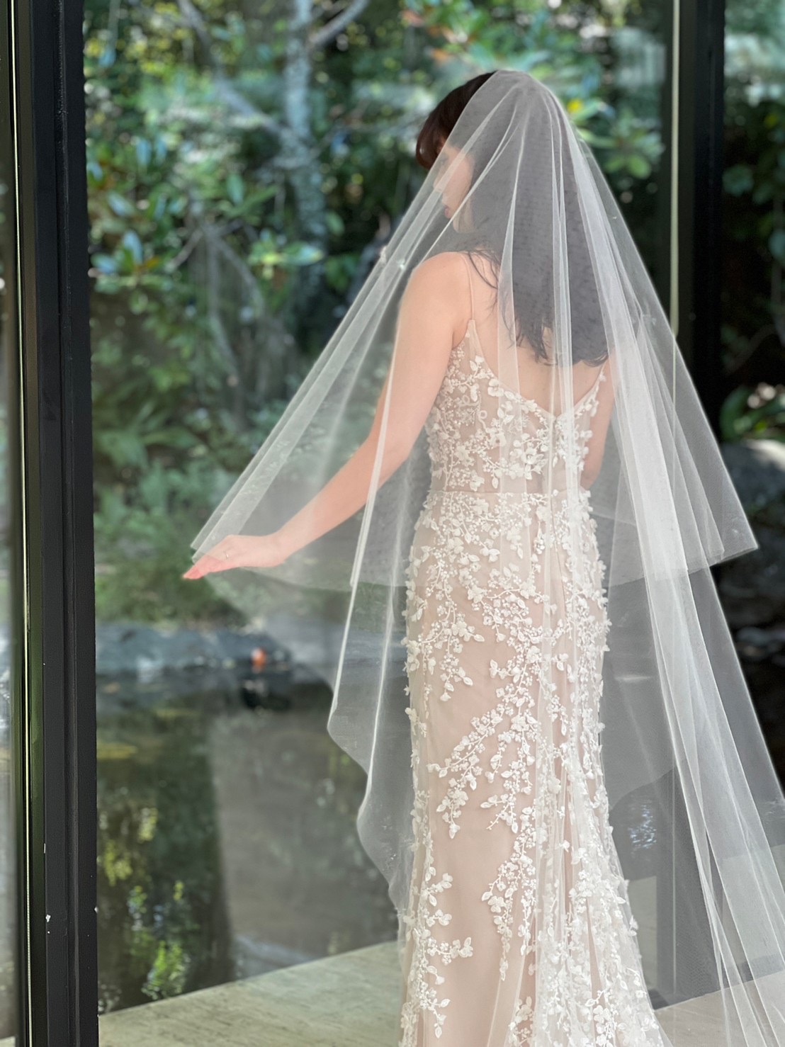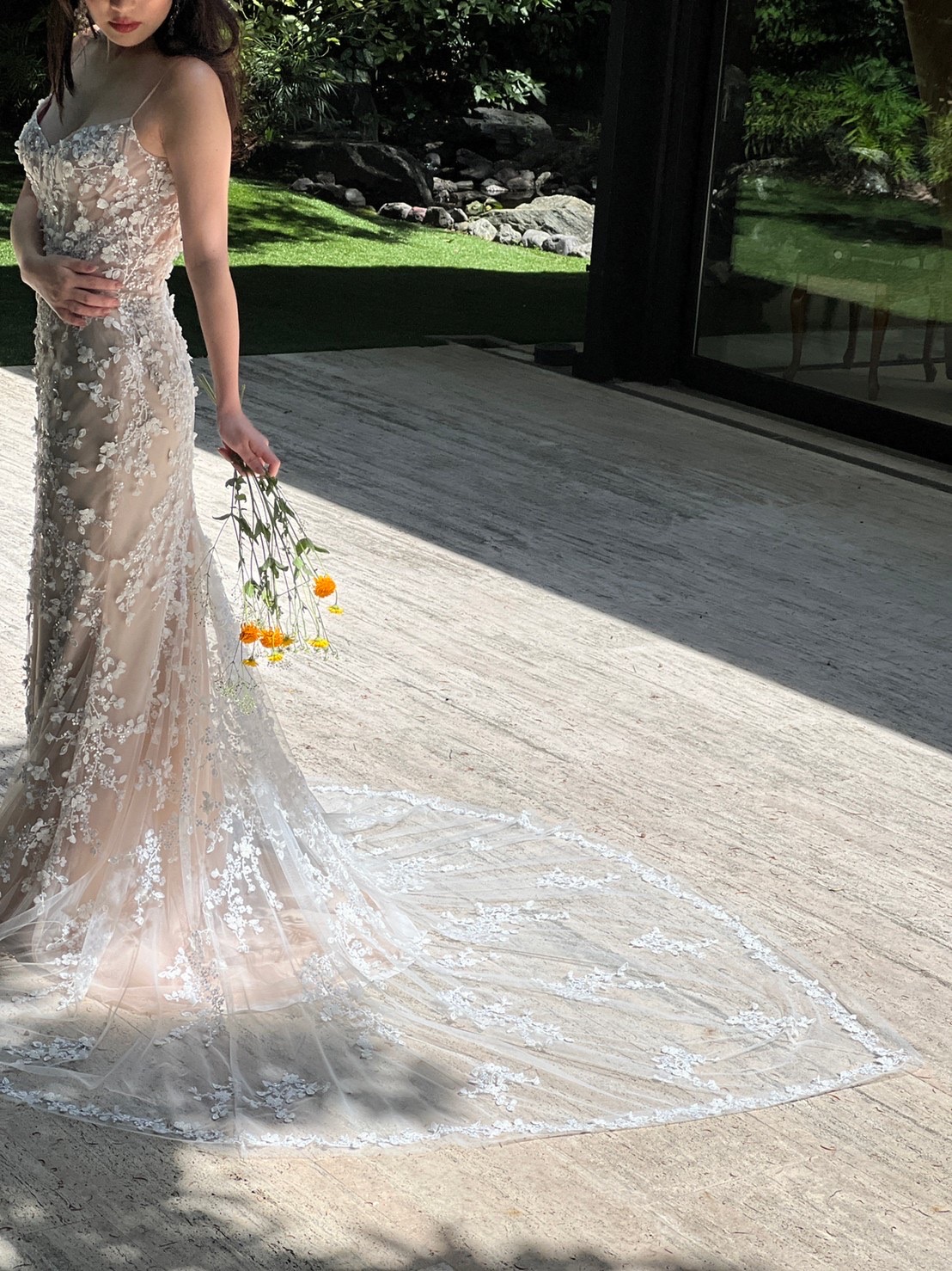中東ブランドらしい刺繍とビーズで表現されたフラワーモチーフに心奪われる1着。シンプルなマーメイドラインのウェディングドレスに立体的に浮かび上がる刺繍やビーズはドレスに華やかさをプラスしてくれます。1着のドレスに沢山のモチーフが施されていますが、既製品のレースをそのまま使用するのではなく、あえて余白を残して抜け感を出したり、透明のスパンコールを使用して輝きを控えめにしたりするなど、全体のバランスが考えられたリズのセンスが光るデザインに仕上がっております。マーメイドラインではありますが、身体のラインを拾いすぎないシルエットとベージュの柔らかい色味の生地が女性らしくナチュラルな印象も感じさせてくれます。ザ ガーデンオリエンタル大阪のチャペル、ザ ミュージックホールの眩いほどの光と緑に囲まれた開放感溢れる空間ではチュールの透明感や散りばめられたビーズモチーフに輝きが増し、より一層ドレスの魅力を引き出します。トレーンの裾には流れるように配置されたリーフやフラワーモチーフのビーディングが煌めき、バージンロードで歩みを進める後ろ姿は優美で見る人を夢中にさせてしまう程の美しさですね。髪型はあえてダウンヘアにベールと大振りのイヤリングのみを合わせ、まるで海外のガーデン挙式を思わせるような自由なスタイリングを楽しんでいただくのもおすすめです。四季折々の自然に囲まれ、まるで静穏の森にいるかのような深い安らぎを感じていただけるザ ガーデンオリエンタル大阪。そんな会場でおふたりとゲストの方々で過ごす特別な時間をご自身らしく楽しんでいただきたいです。