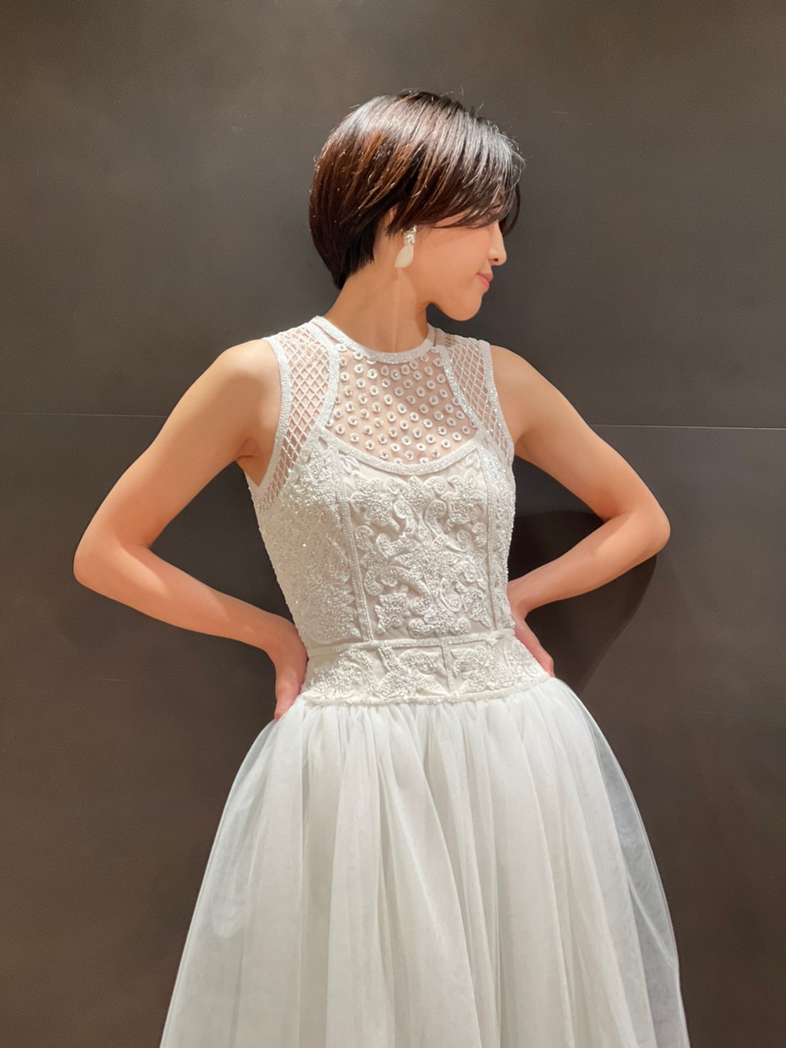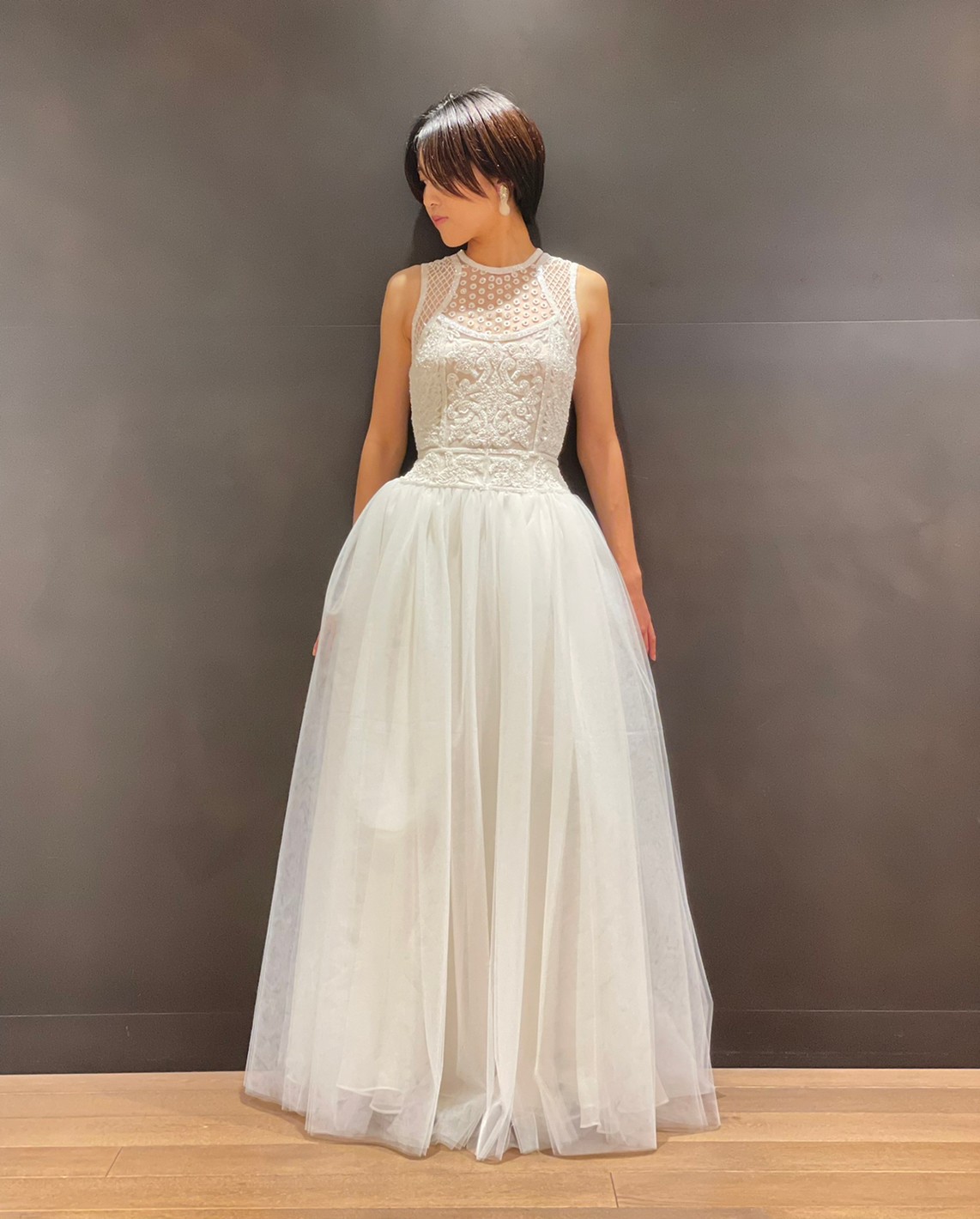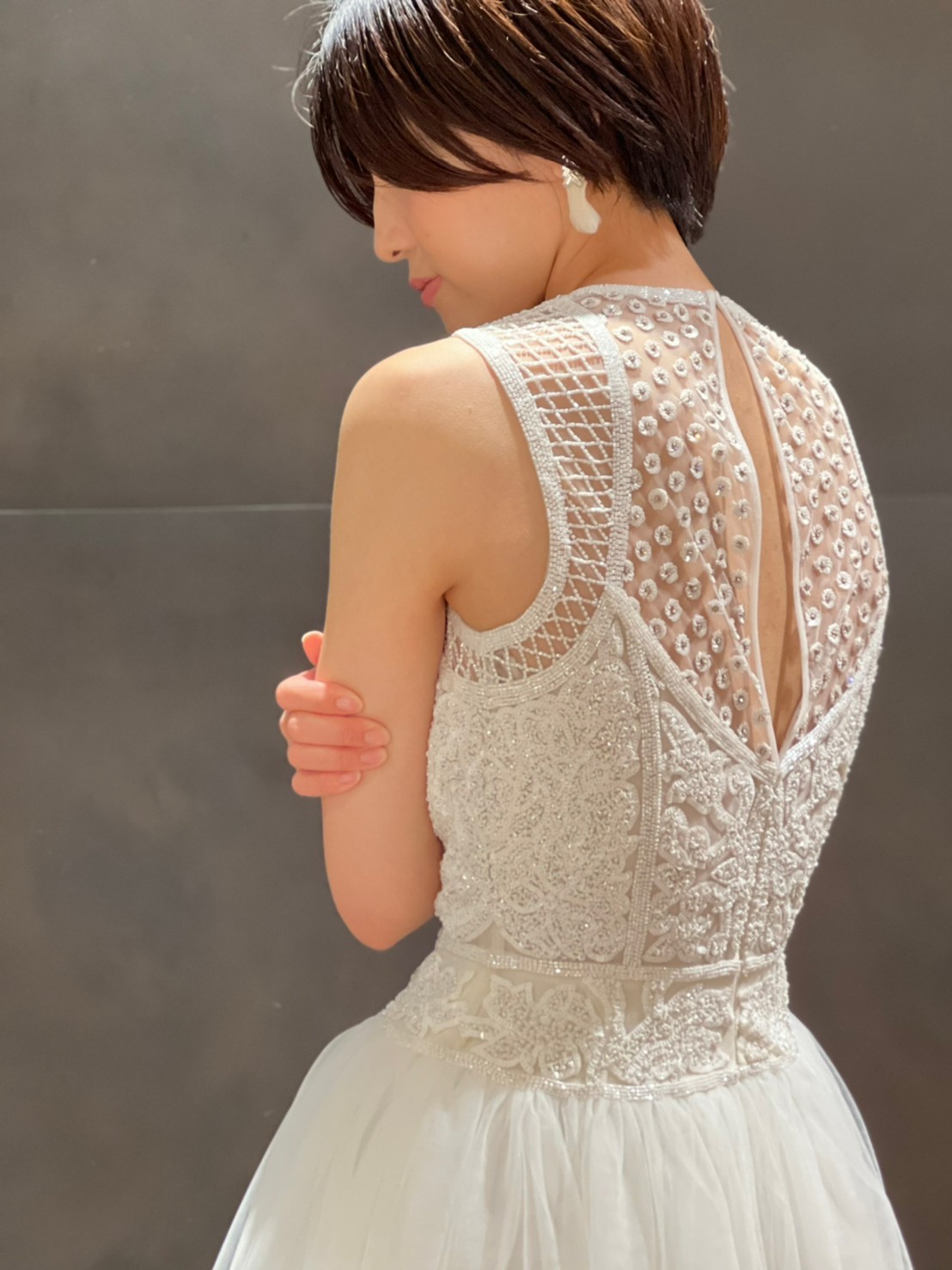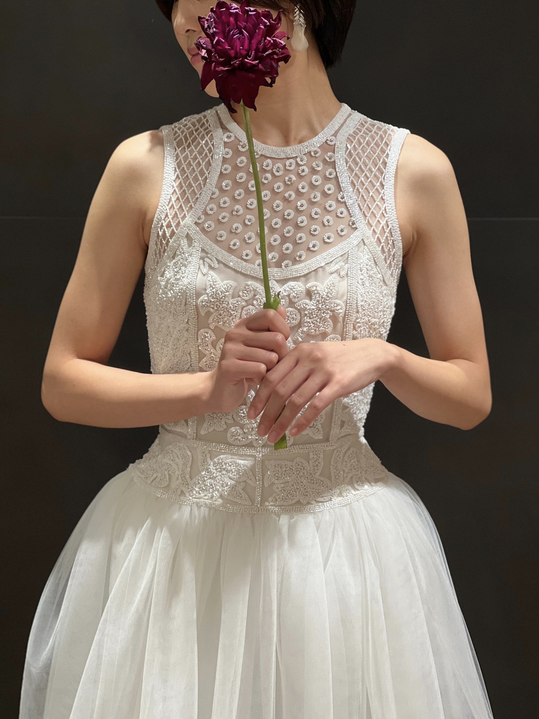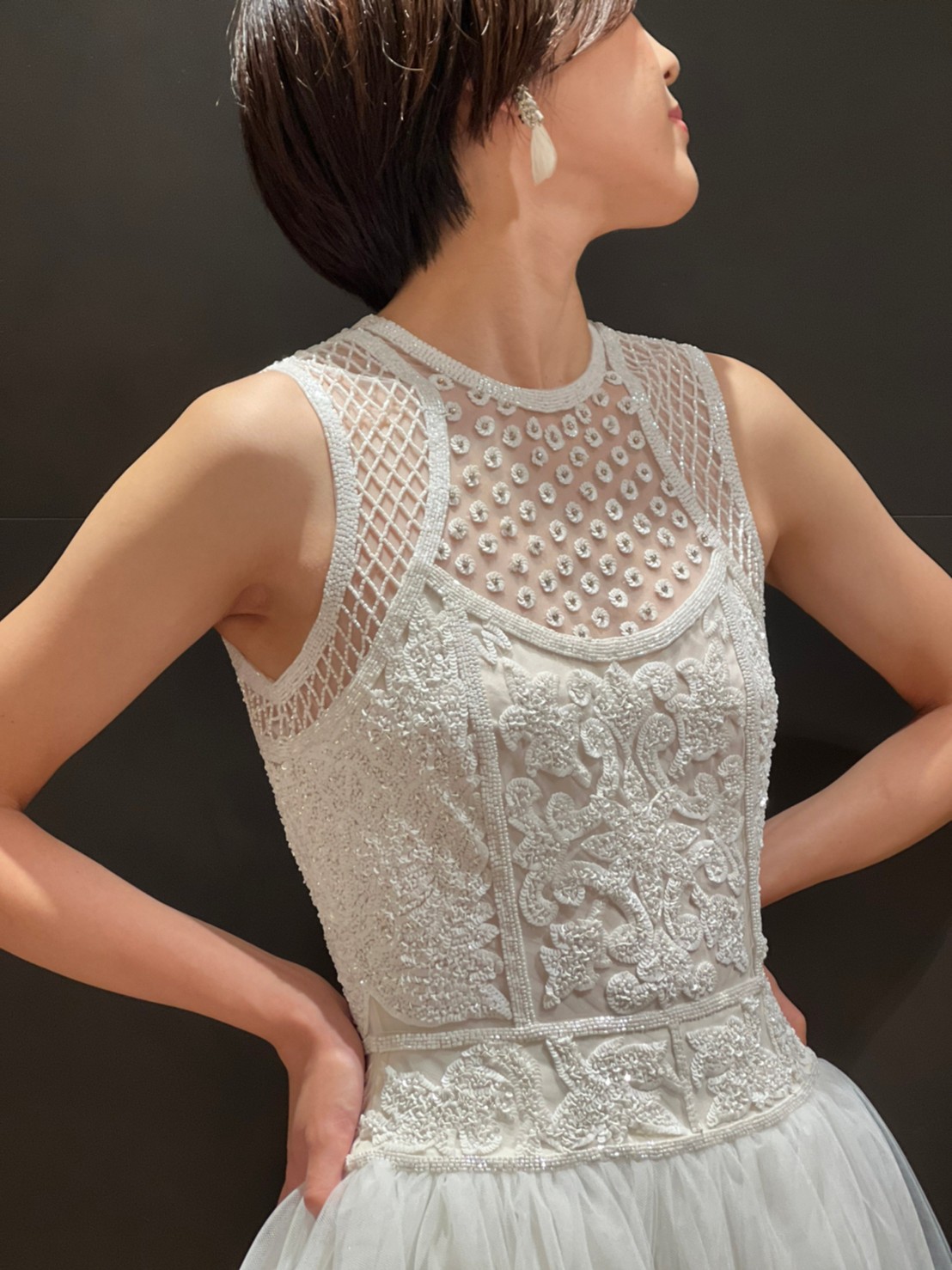 昨年10月に発表されたFall 2022 bridal collectionは暖かく美しい海辺やガーデンに囲まれたウェディングをする幸福感溢れる花嫁をイメージしたものになっており、すべてのドレスにイタリアの都市が名付けられています。ナイームカーンらしいため息の出るような精巧な技術と、イタリアの美しい景観を彷彿させるファッショナブルなセンスの光るドレスたちには、買い付けを行う私たちも魅了されました。その中でも今回ご紹介するのは「ティレニア海に浮かぶ宝石」とも讃えられる、南イタリアのリゾート地「カプリ」が名付けられたこちらのドレス。海の青と白い岩肌、島の緑からなる眩い自然美や、住宅や高級ホテルなどの街全体の建築美がインスピレーションです。デコルテやお背中を美しく彩る、5㎜にも満たない小さなスパンコールからなる圧巻のインド刺繍は、伝統の幾何学模様のモチーフを絶妙なバランスで施し、フレッシュかつモダンに昇華させています。またローウエストの切り替えと腰元から立ち上がるチュールスカートの一連のシルエットはアートの様な美しさ。女性の曲線美を最大限に引き出し、時代を超えてもモダンであり続ける大切な要素になっています。華やかなビジュー刺繍にエフォートレスなカッティングや軽やかでコンパクトなスカートを組み合わせることで、ラグジュアリーでありながらもリラックス感のある、高級リゾート・カプリを見事に体現した1着。爽やかな輝きを放つドレスは、海辺や緑豊かな風景に鮮やかに映え、光の差し込む開放的な披露宴会場や、ロマンティックな光に照らされるアットホームなナイトパーティーにもおすすめです。