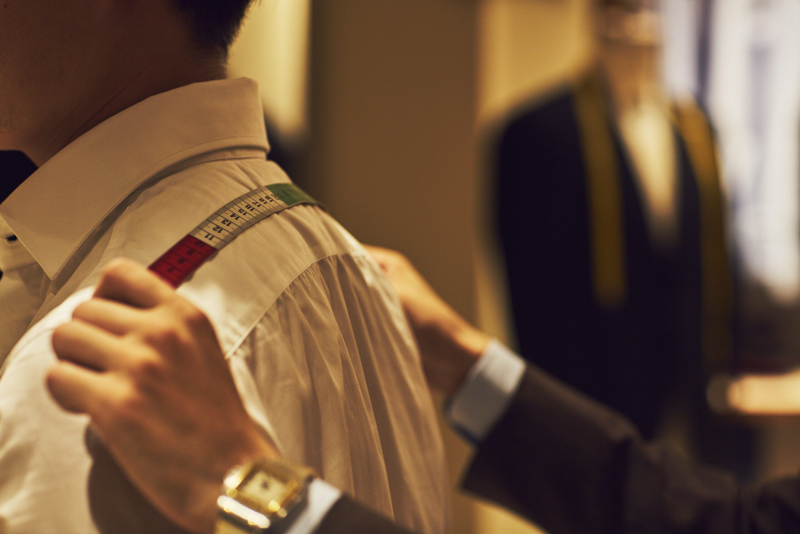トリート ジェントルマンではご新郎様の体型や雰囲気に相応しい1着をメンズスタッフよりご提案をさせていただきます。ご自身のお好みのスタイルを形成していく事もタキシード選びの愉しみの1つだと思います。トリート ジェントルマンでご準備している購入のタキシードは、「パターンオーダー」にてお仕立ていたします。パターンオーダーとは「ゲージ」と呼ばれるベースサイズから各箇所のメジャーリングを行い、ご新郎様のお身体に合わせていく手法です。既成のタキシードをお召しいただきながら採寸を進めていくため完成形をイメージしやすく、オーダーメイドが初めてというご新郎様でも安心してお仕立ていただくことができます。