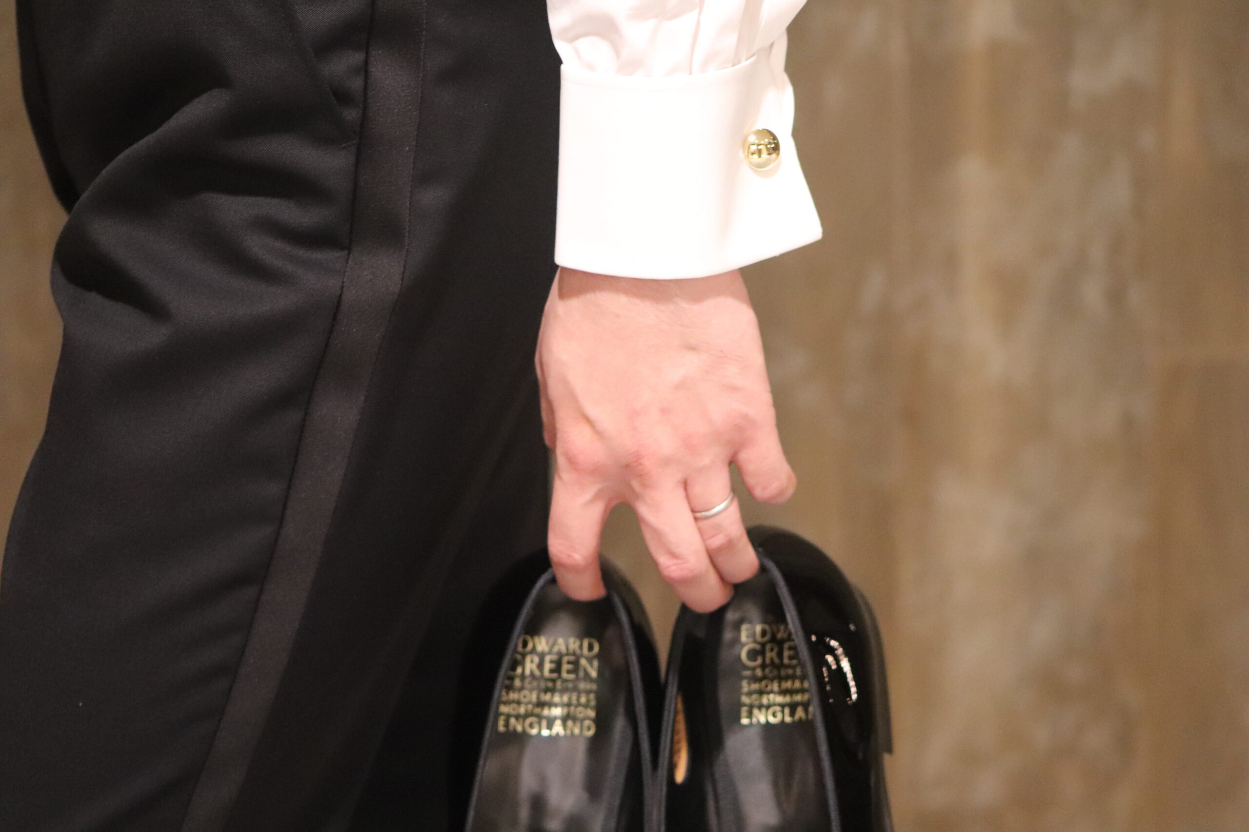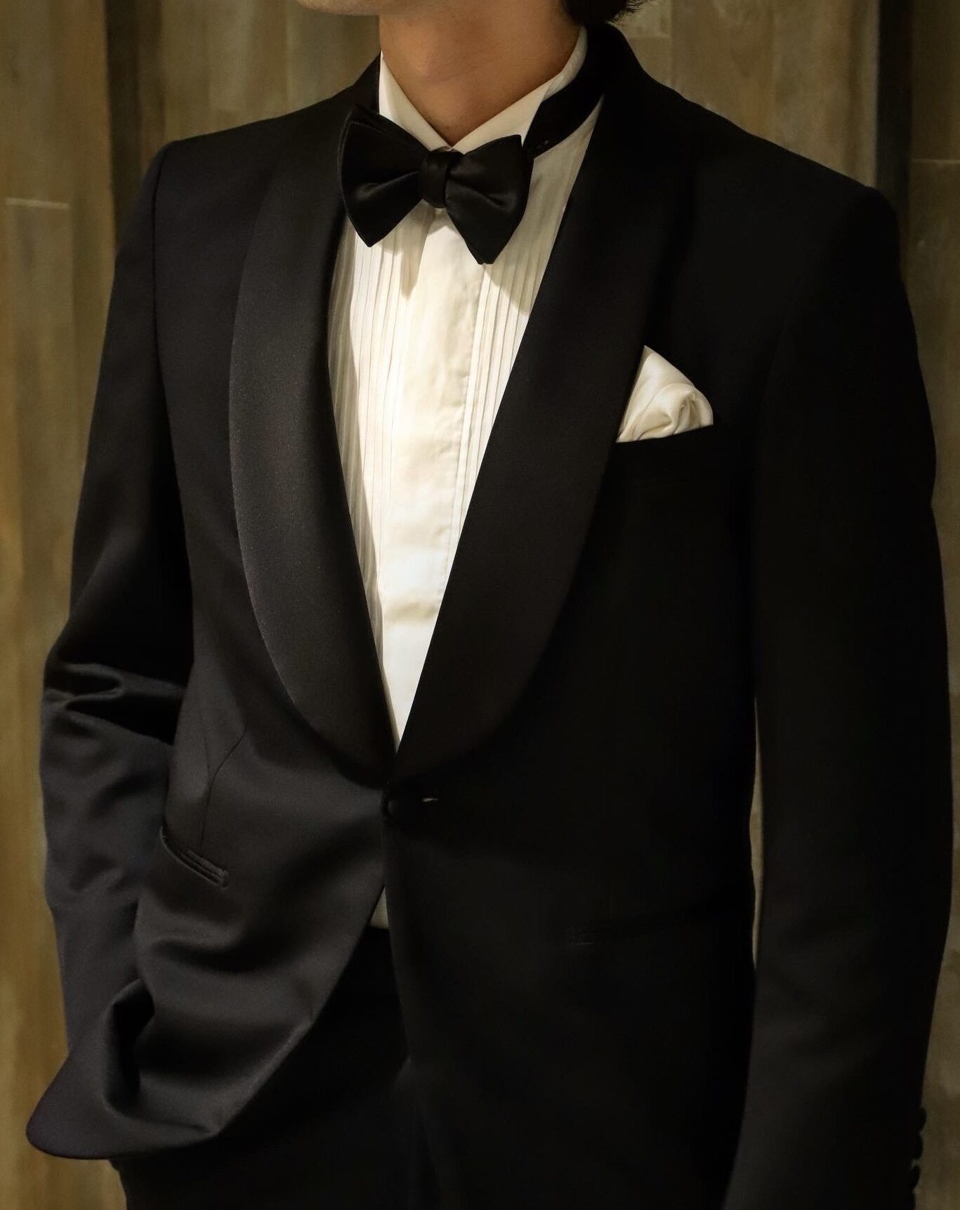 正統なタキシードを装うということは、結婚式というメモリアルな一日を過ごすのに相応しい。トリート ジェントルマン が提案する正統なタキシードは「お洒落」ではなく世界基準のドレスコードに沿ったタイムレスなシルエットとディテールで構築されています。特徴として襟は拝絹のついたピークドラペルかショールカラー。パンツには側章と呼ばれるラインが必ず入ります。そして、ブラックのボウタイ、シャツには白無地のウィングカラーにダブルカフス、カフリンクスにはブラックオニキス。足元はエナメルのオペラパンプスを合わせる装いが最もふさわしいタキシードスタイルです。