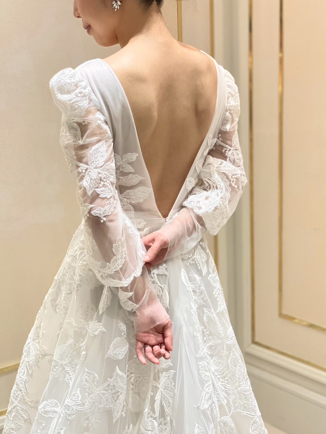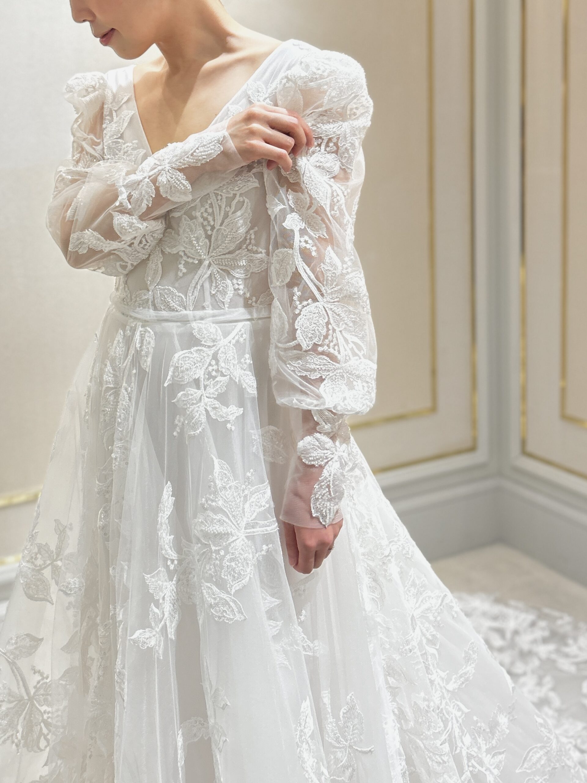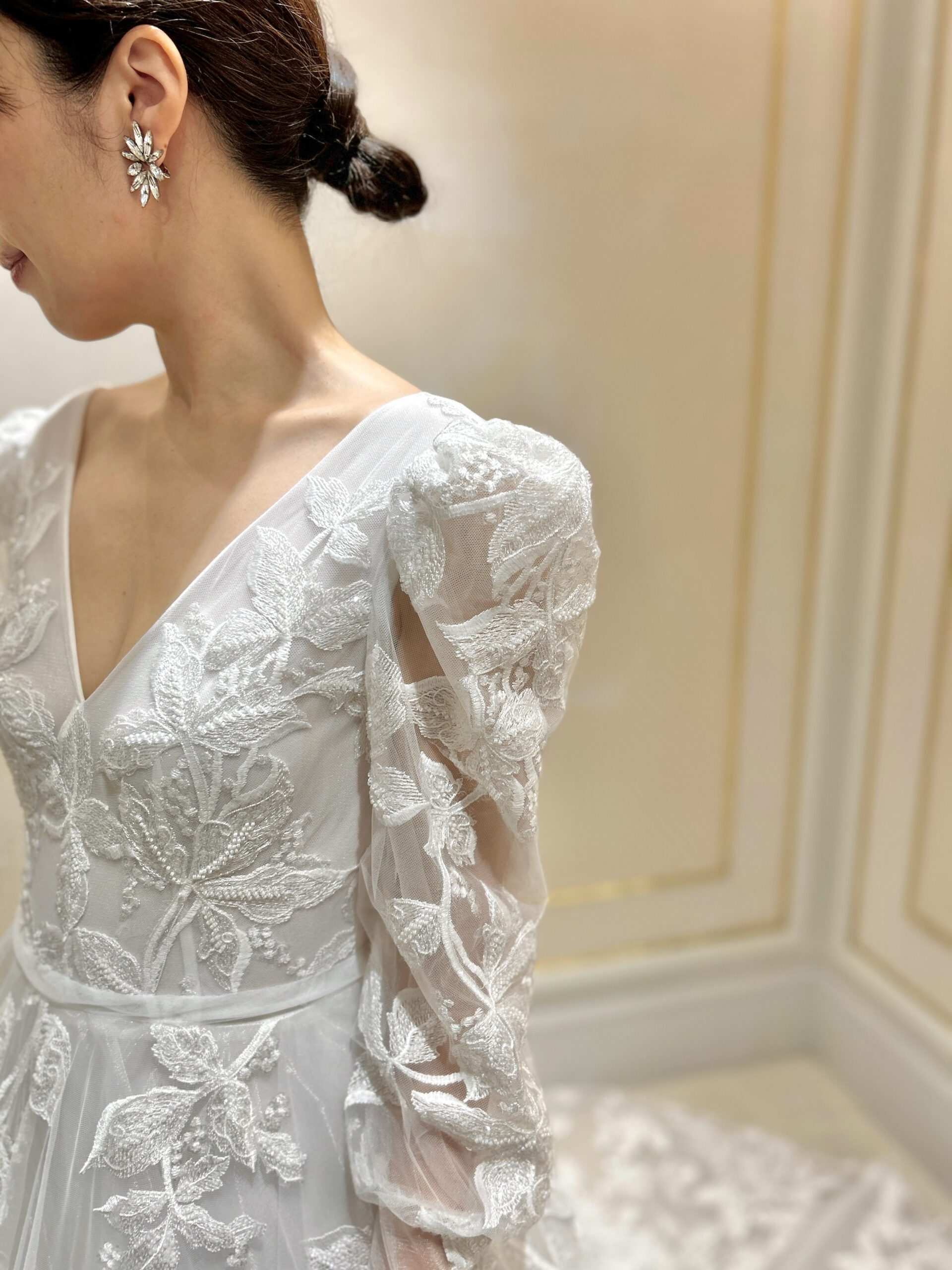 今回は刺繍やスパンコールが華やかで、優美なオーラで花嫁を包むロングスリーブのウェディングドレスをご紹介いたします。上半身からスカートの裾までリーフ調のボタニカルな刺繍が贅沢に施されたこちらのウェディングドレス。透明感のある軽やかなファブリックに施されることにより、リーフの刺繍がまるで素肌の上に乗っているかのように立体的に浮かび上がります。ネタ ドーヴァーらしい華やかでエレガントなデザインの中にリーフの刺繍が施されることで、ナチュラルでモダンな雰囲気に昇華させます。そして刺繍の上にふんだんにあしらわれたクリアのスパンコールは、陽の光やライトに照らされるときらりと繊細に光り輝き、神秘的でロマンティックな花嫁を演出します。肩元はトレンドのパフスリーブで女性らしくモダンな花嫁を表現し、女性心をくすぐります。すっきりとVカットに開くデコルテや背中はロングスリーブとのコントラストが美しく、クラシカルすぎず程よく肩の力を抜いたヘルシーな印象に。グッと大人の魅力を引き立てます。360度どの角度から見ても美しくゲストまでも魅了するこちらのウェディングドレスは誰もが記憶に残る一着に。華やかでありながらもナチュラルでヘルシーさも漂うこちらのドレスは、挙式だけではなく前撮りやお色直しの一着としてもおすすめです。