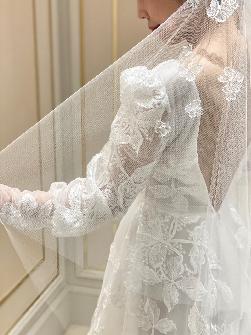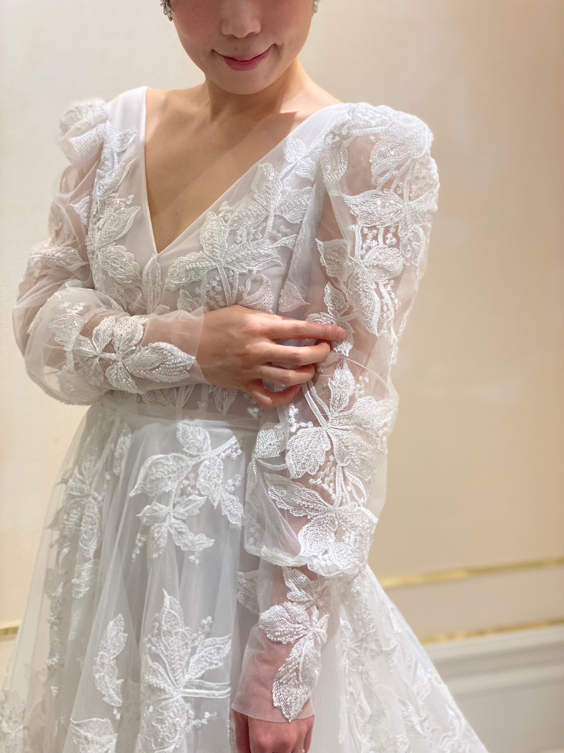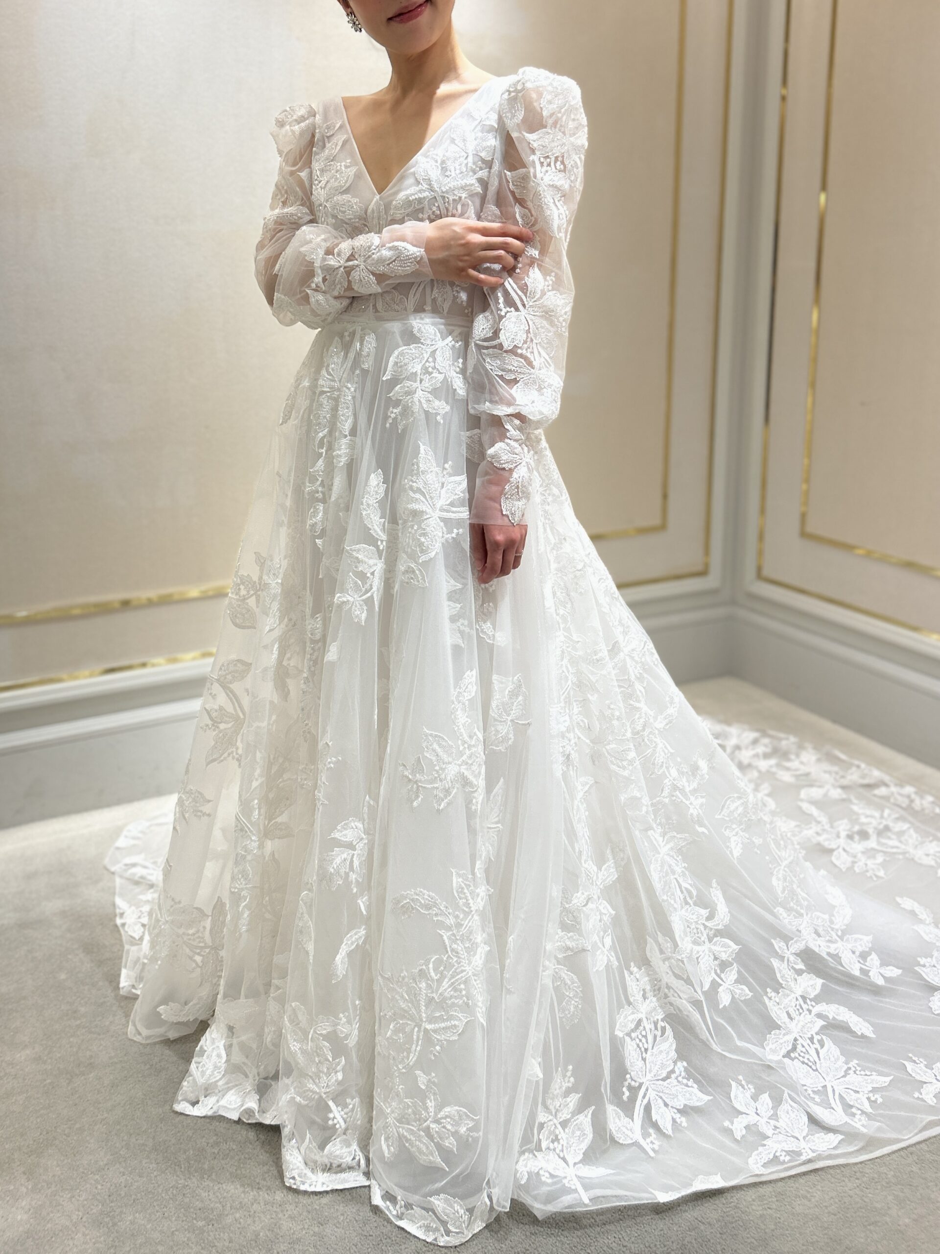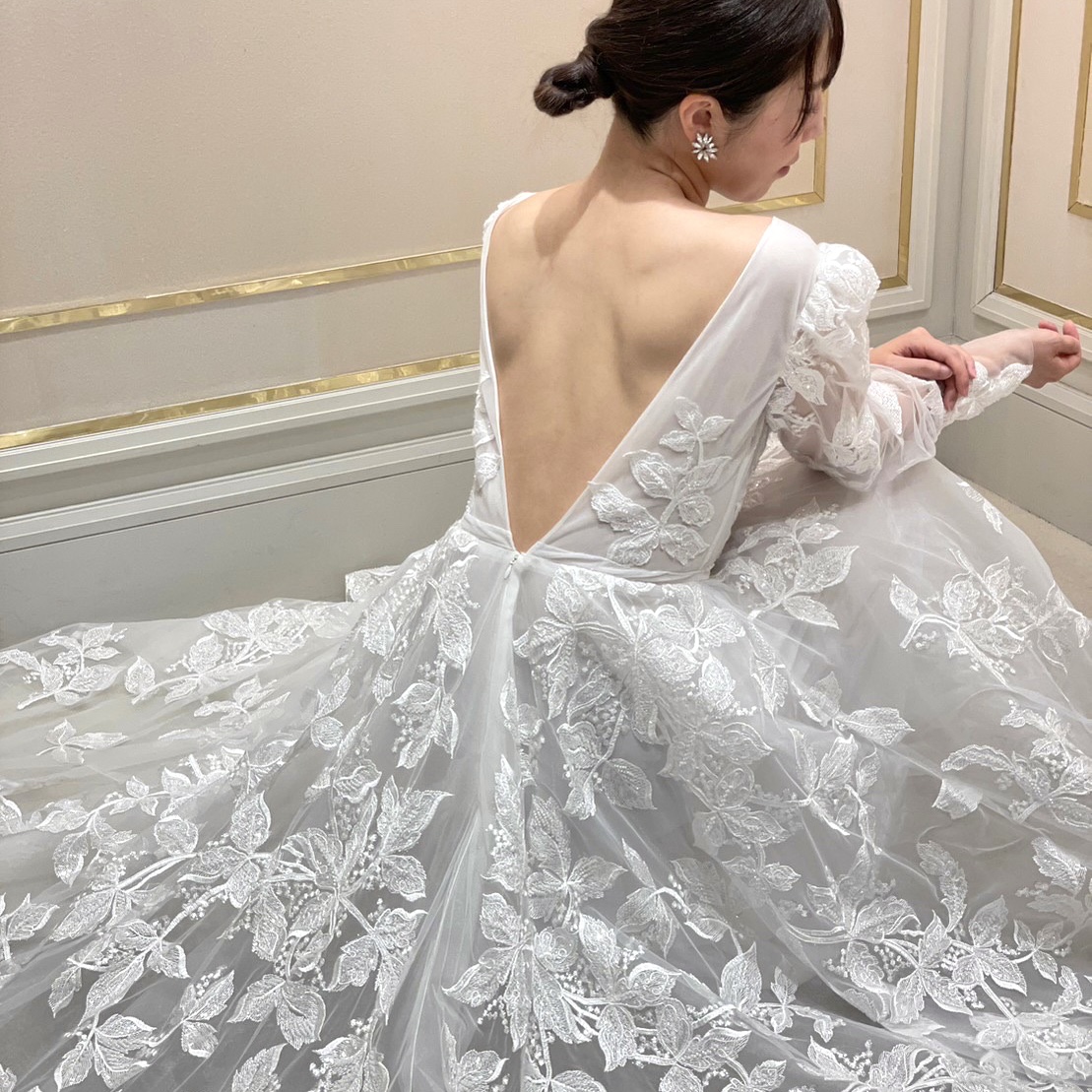 今回は刺繍やスパンコールが華やかで、優美なオーラで花嫁を包むロングスリーブのウェディングドレスをご紹介いたします。上半身からスカートの裾までリーフ調のボタニカルな刺繍が贅沢に施されたこちらのウェディングドレス。透明感のある軽やかなファブリックに施されることにより、リーフの刺繍がまるで素肌の上に乗っているかのように立体的に浮かび上がります。ネタ ドーヴァーらしい華やかでエレガントなデザインの中にリーフの刺繍が施されることで、ナチュラルでモダンな雰囲気に昇華させます。そして刺繍の上にふんだんにあしらわれたクリアのスパンコールは、陽の光やライトに照らされるときらりと繊細に光り輝き、神秘的でロマンティックな花嫁を演出します。肩元はトレンドのパフスリーブで女性らしくモダンな花嫁を表現し、女性心をくすぐります。すっきりとVカットに開くデコルテや背中はロングスリーブとのコントラストが美しく、クラシカルすぎず程よく肩の力を抜いたヘルシーな印象に。グッと大人の魅力を引き立てます。360度どの角度から見ても美しくゲストまでも魅了するこちらのウェディングドレスは誰もが記憶に残る一着に。華やかでありながらもナチュラルでヘルシーさも漂うこちらのドレスは、挙式だけではなく前撮りやお色直しの一着としてもおすすめです。
