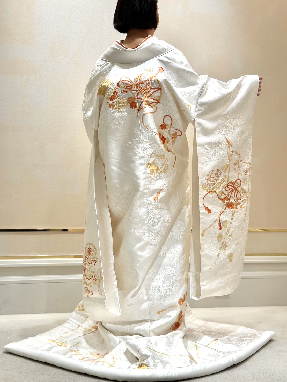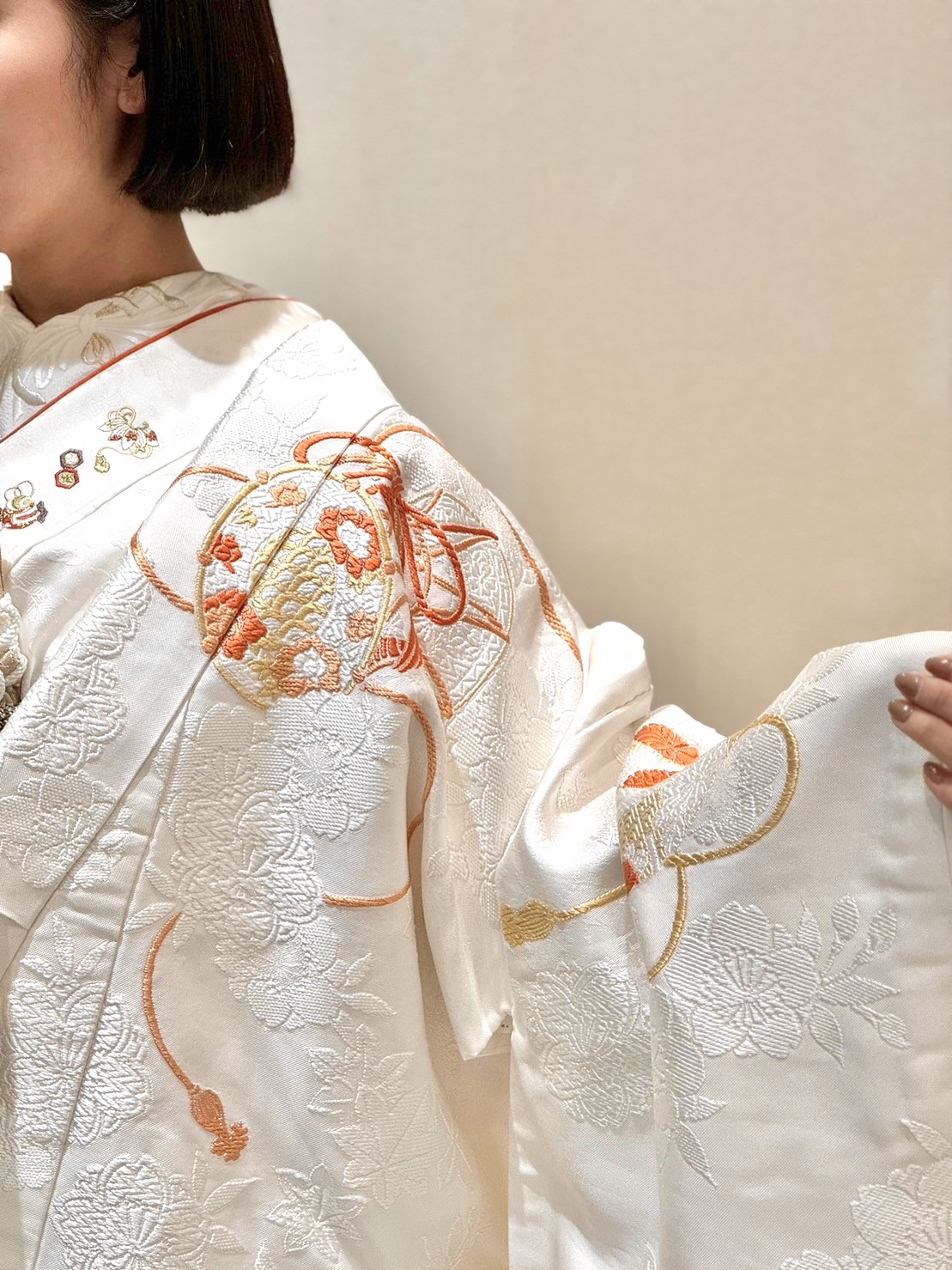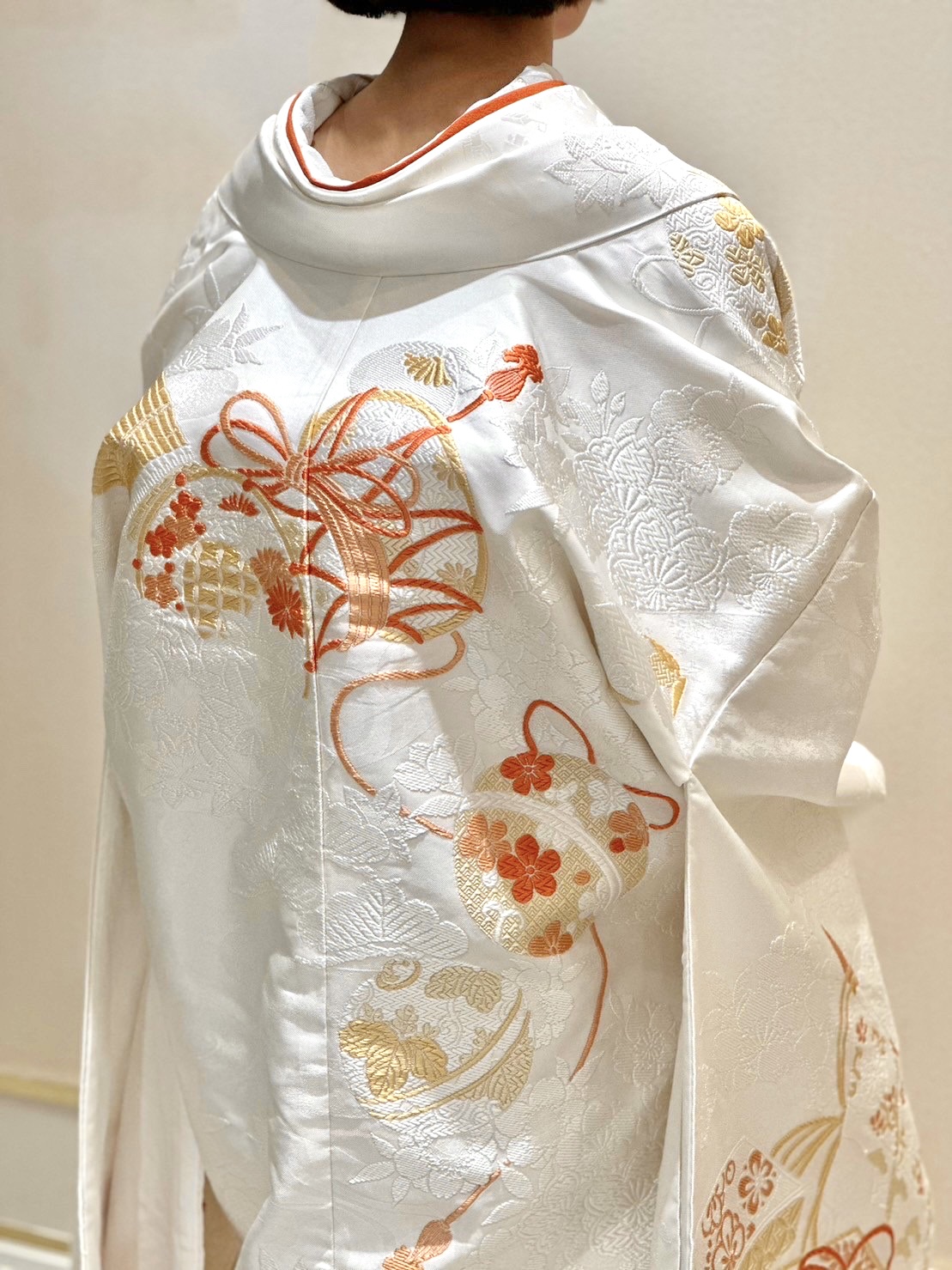 温もりのある柿色がアクセントになる華やかな白無垢は、善王寺織という新たな技法を用いて生まれました。くっきりと浮かび上がる豊かな表現力が魅力の善王寺織は、絵柄を織りなす際に太い経糸を使用することでふっくらとした立体感を生み出します。まるで刺繍が施されたかのような立体感が奥行きのある柄にさせ、控えめながらも豪華な印象を与えます。また太い糸特有の艶の少ない質感は上品さを演出し、白無垢本来の奥ゆかしさや可憐さを引き立ててくれます。京都の京丹後にある、デザインから作成までを担う地の名前をとり善王寺織と名付けられた織物。袖を通すと模様の重厚感からは想像のつかない軽やかさが、結婚式当日の緊張感を和らげ心軽やかにしていただけるのではないでしょうか。伝統的な白一色で仕立てられた白無垢とは違い、色糸を取り入れた遊び心あるデザインがゲストの心に残ることでしょう。個性彩る白無垢を、人生最良の日の1着に選んでみてはいかがでしょうか。
