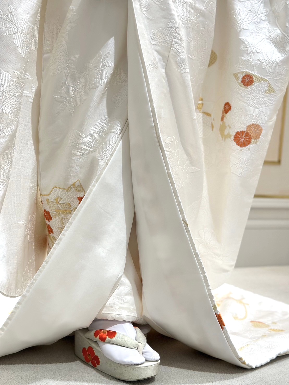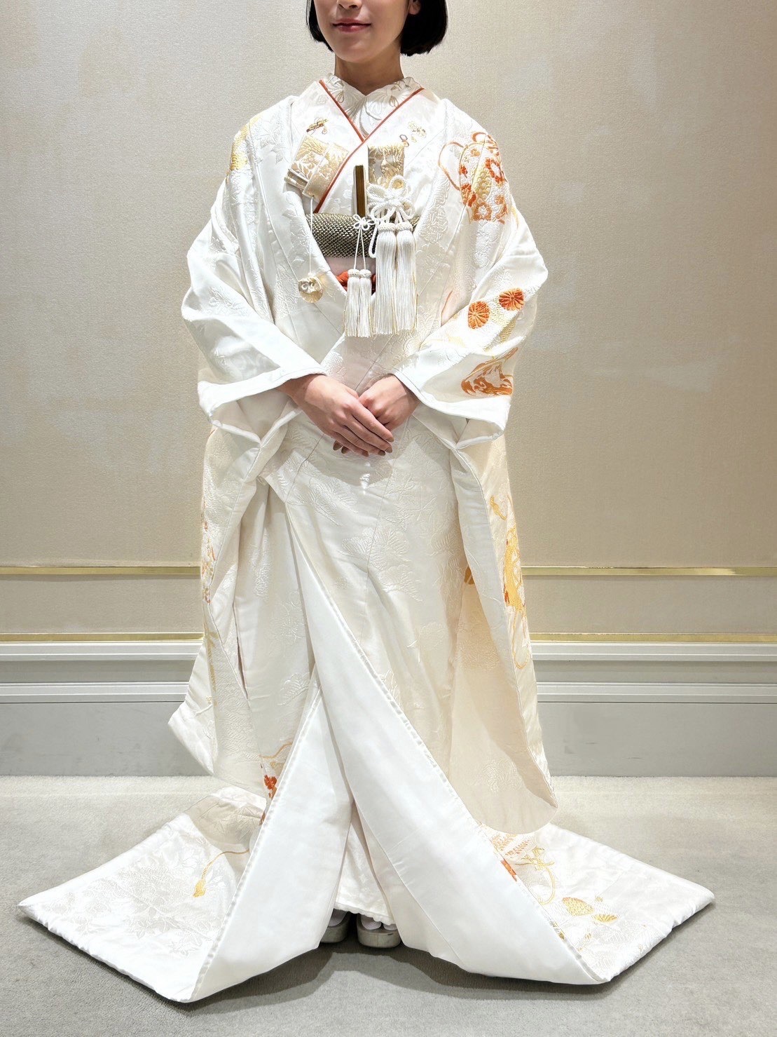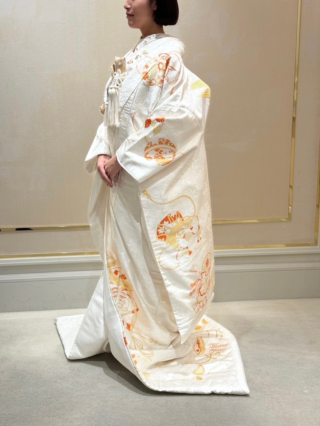 温もりのある柿色がアクセントになる華やかな白無垢は、善王寺織という新たな技法を用いて生まれました。くっきりと浮かび上がる豊かな表現力が魅力の善王寺織は、絵柄を織りなす際に太い経糸を使用することでふっくらとした立体感を生み出します。まるで刺繍が施されたかのような立体感が奥行きのある柄にさせ、控えめながらも豪華な印象を与えます。また太い糸特有の艶の少ない質感は上品さを演出し、白無垢本来の奥ゆかしさや可憐さを引き立ててくれます。京都の京丹後にある、デザインから作成までを担う地の名前をとり善王寺織と名付けられた織物。袖を通すと模様の重厚感からは想像のつかない軽やかさが、結婚式当日の緊張感を和らげ心軽やかにしていただけるのではないでしょうか。伝統的な白一色で仕立てられた白無垢とは違い、色糸を取り入れた遊び心あるデザインがゲストの心に残ることでしょう。個性彩る白無垢を、人生最良の日の1着に選んでみてはいかがでしょうか。