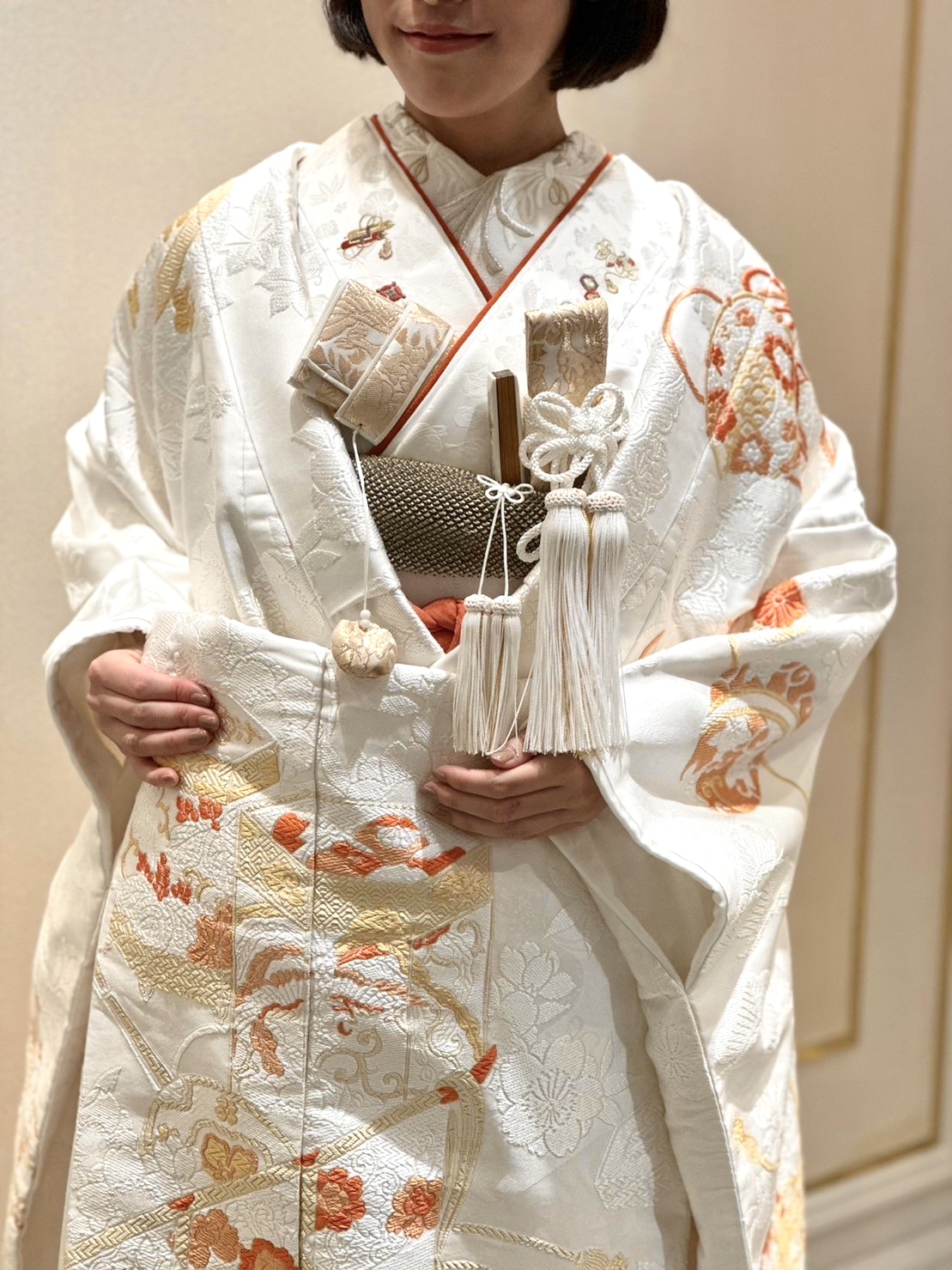 金色や柿色など暖色の色味を使用した新鮮な白無垢だからこそ、柄の立体感や大胆さを引き立てる同系色でまとめたコーディネートはいかがでしょうか。清廉な白無垢のシンプルな潔さや奥ゆかしさの中に力強さを感じさせる織の色糸に合わせて、重衿と丸ぐけには同じ色味を用いることで顔まわりに華やかさと共に締まった印象を与えます。宝尽くしが描かれた掛下は春の宴のめでたさをより表現してくれます。金糸と銀糸の大胆な熨斗柄の半衿と、ふんだんに金糸が施されつつ白地の抜け感ある懐剣、筥迫、そしてあえて茶色がかった深緑の帯揚げがそれぞれアクセントになり、バランスの取れたほんの少しの遊び心がゲストの皆様の目線を惹きつけるでしょう。足元は真っ白ではなく金糸が織り込まれた草履を履くことで、歩むたびに柔らかに煌めく優美さがあなたに自信を与えます。細部までこだわり抜いたコーディネートで女性ごころをくすぐるスタイリングを叶えていただけます。存在感溢れる白無垢で、あなたの美しさを魅せる華麗で大胆な着こなしをしていただきたいです。