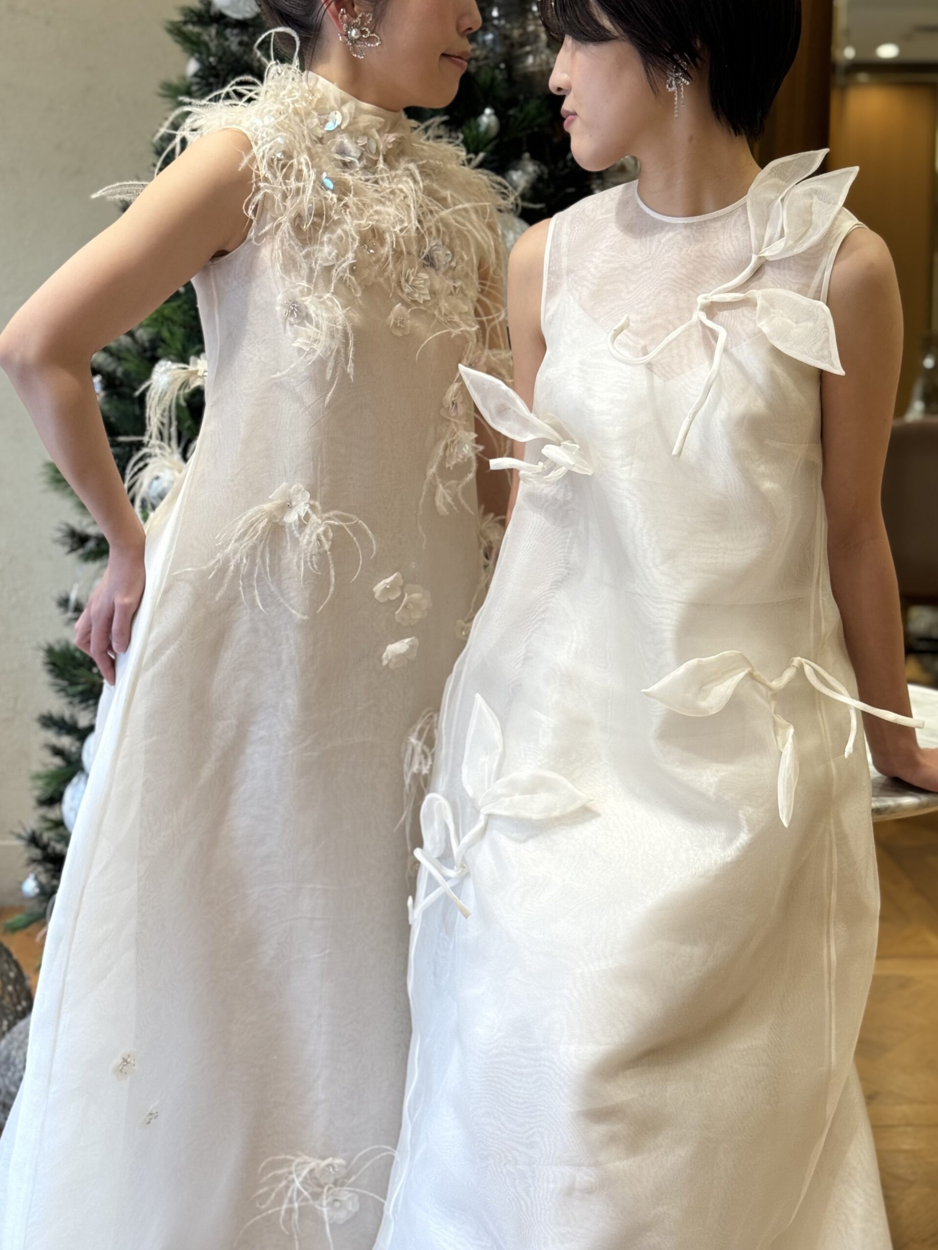 ザトリートドレッシング大阪店よりおすすめの立体的なリーフデザインが美しいモダンなウェディングドレスザトリートドレッシング大阪店がおすすめするザセカンドスキンコの新作ウェディングドレスシルエットが美しい軽やかなオーガンジーの新作のAラインのウェディングドレス