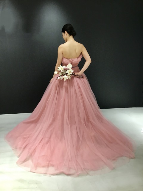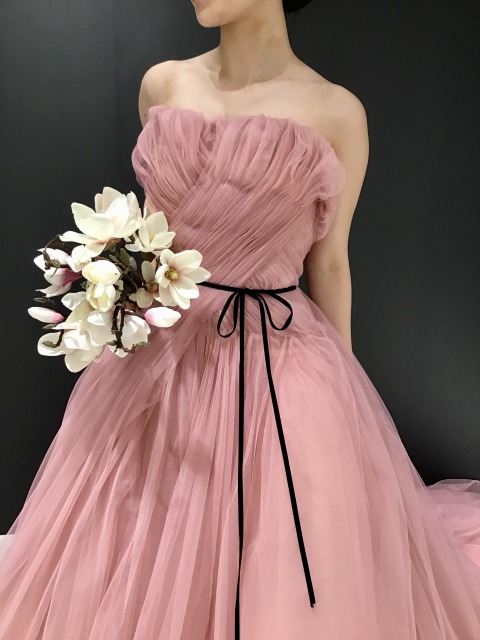 ふんだんに使用された落ち着いたrose pinkの繊細なチュールが美しく