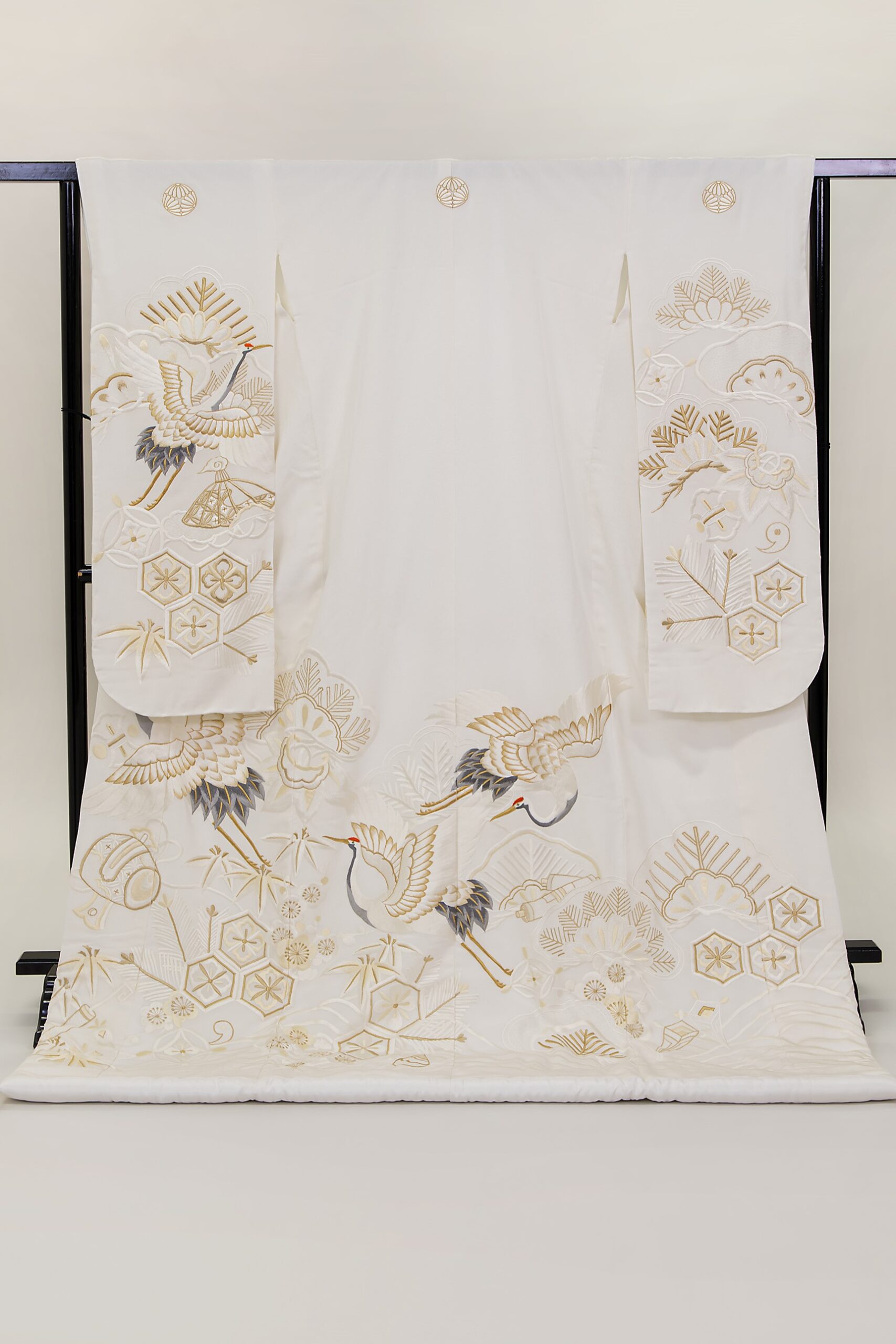 絞りの立体感が美しい最高級の鬼絞縮緬地に、一番手(いちばんて)といわれる熟練の職人の手による横振刺繍で縫い上げられた白無垢の逸品。正絹糸であしらわれた刺繍は白やベージュの色味がやわらかく、立体感と刺繍ならではの繊細さが光り、優美な印象を引き立てます。大正時代のアンティーク振袖を元に描いた意匠は、一品鳥といわれ長寿の象徴である大振りの鶴を中心に福を招く宝尽くし、常盤緑である老松、春を告げる梅とめでた尽くしの文様が裾と袖のみに広がり、上部分は刺繍の五ツ紋のみを配して格調高い伝統美を醸し出しています。白無垢だからこそ成し得る最高級の和を存分に味わえる一枚が完成しました。