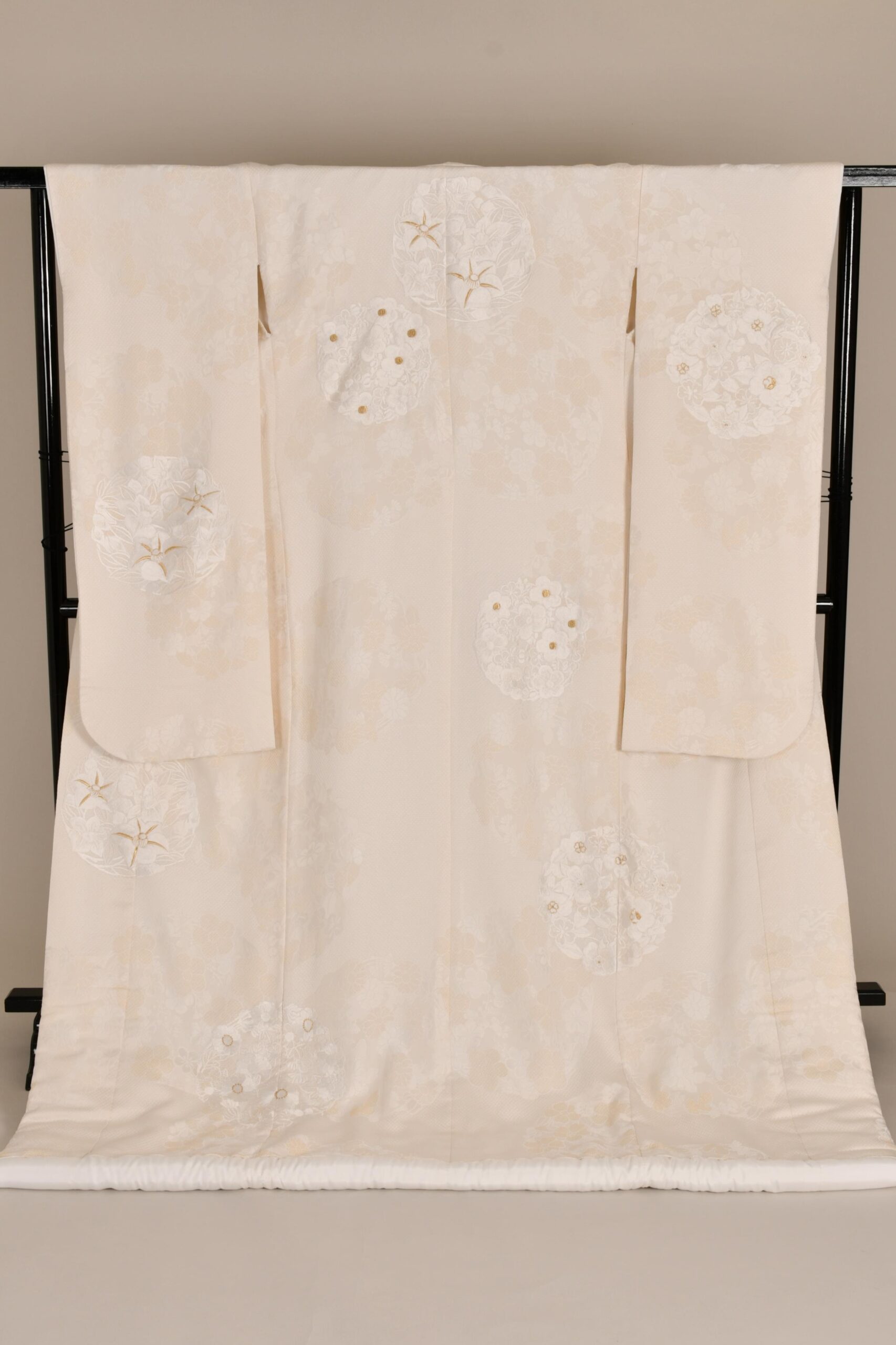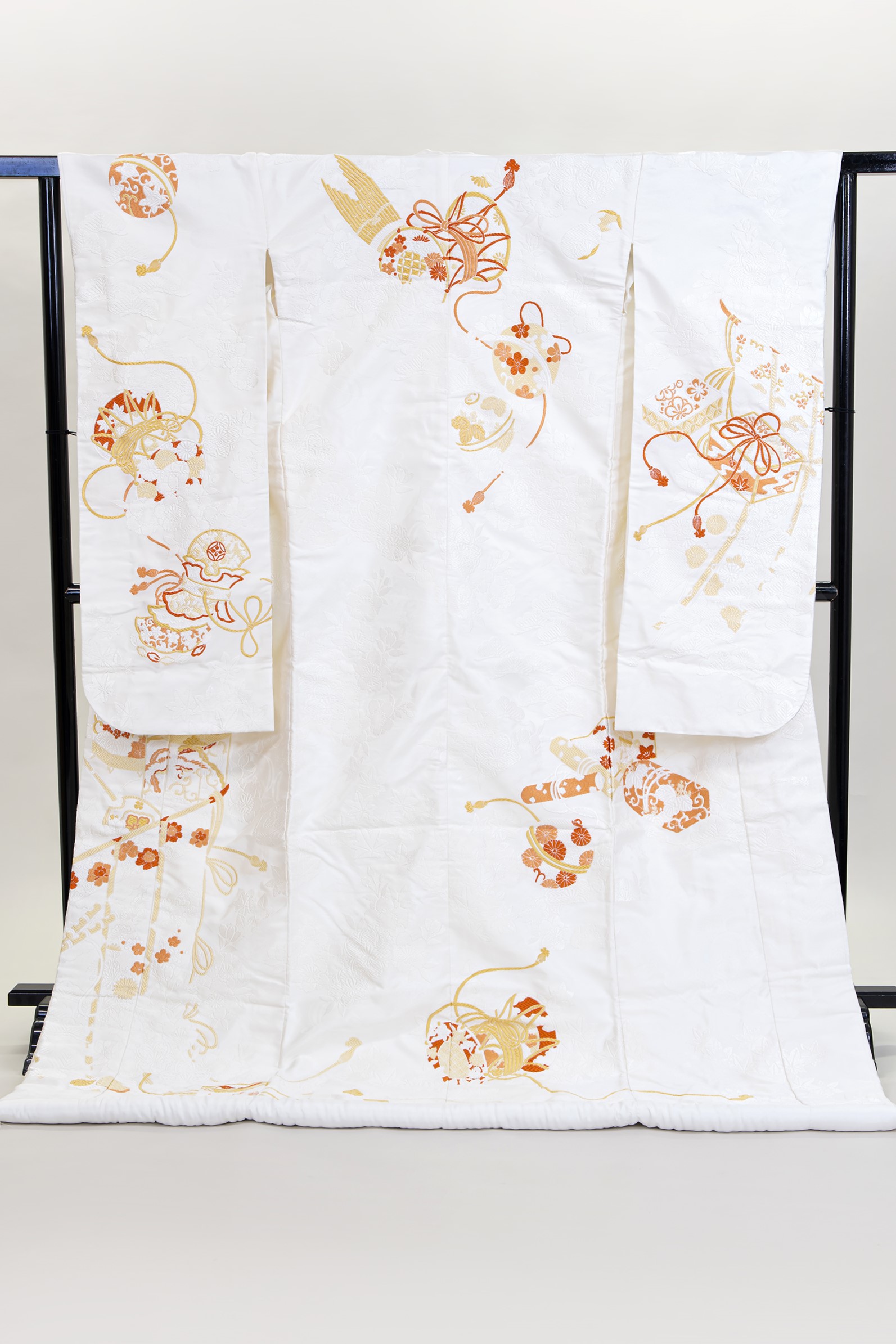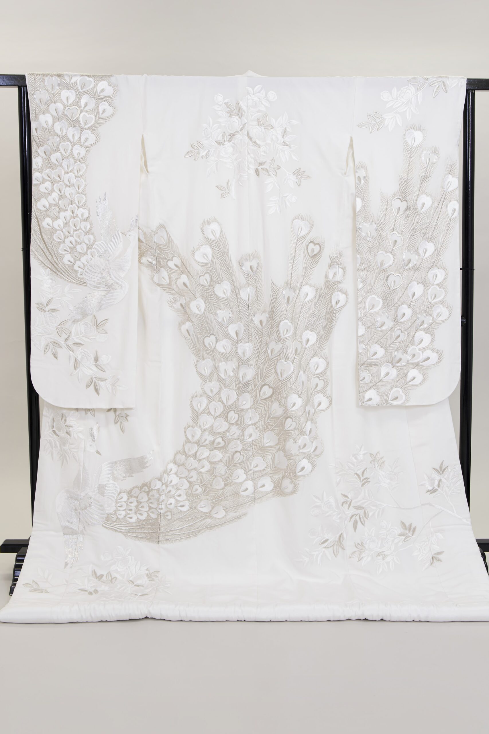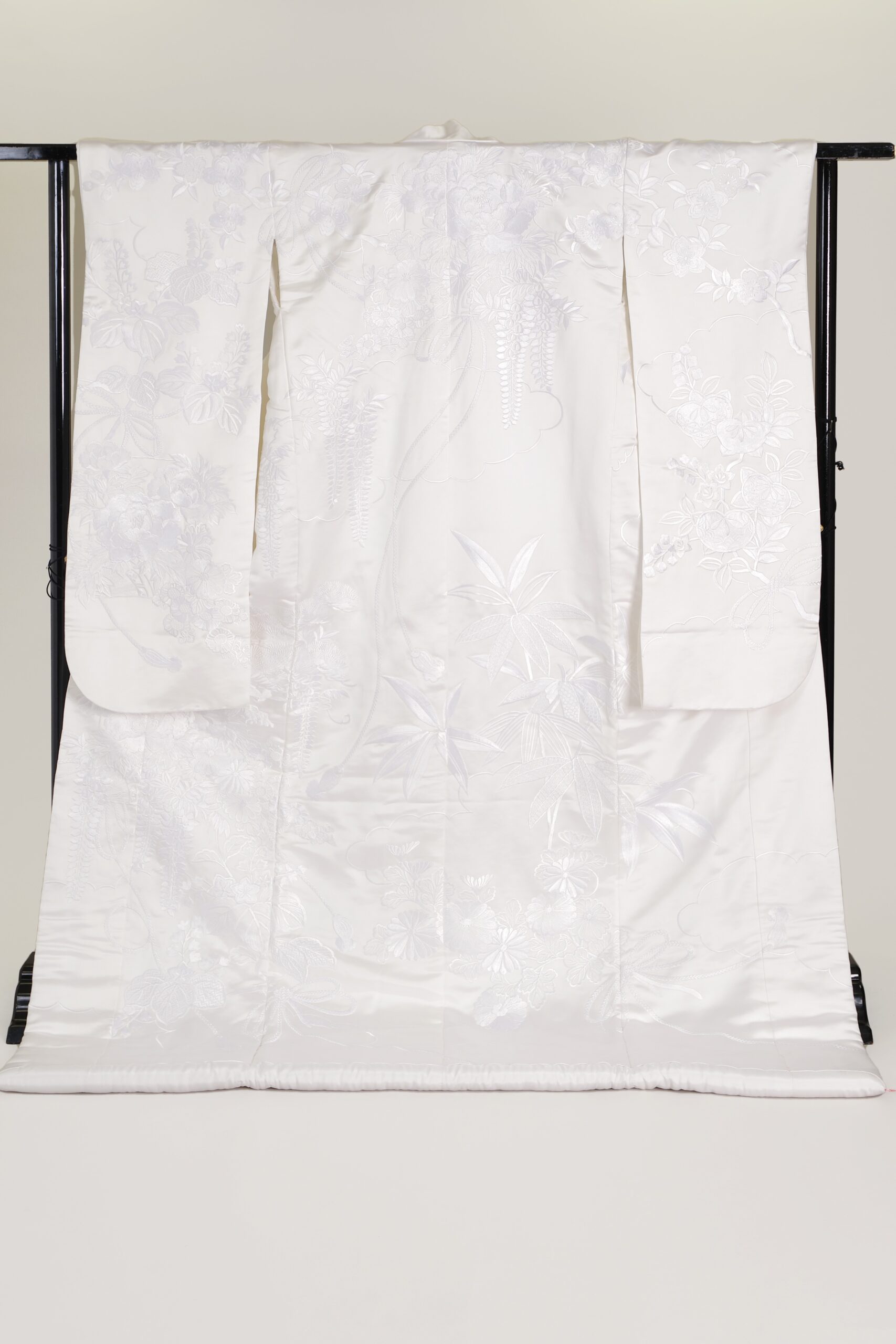 絞りの立体感が美しい最高級の鬼絞縮緬地に、一番手(いちばんて)といわれる熟練の職人の手による横振刺繍で縫い上げられた白無垢の逸品。正絹糸であしらわれた刺繍は白やベージュの色味がやわらかく、立体感と刺繍ならではの繊細さが光り、優美な印象を引き立てます。大正時代のアンティーク振袖を元に描いた意匠は、一品鳥といわれ長寿の象徴である大振りの鶴を中心に福を招く宝尽くし、常盤緑である老松、春を告げる梅とめでた尽くしの文様が裾と袖のみに広がり、上部分は刺繍の五ツ紋のみを配して格調高い伝統美を醸し出しています。白無垢だからこそ成し得る最高級の和を存分に味わえる一枚が完成しました。